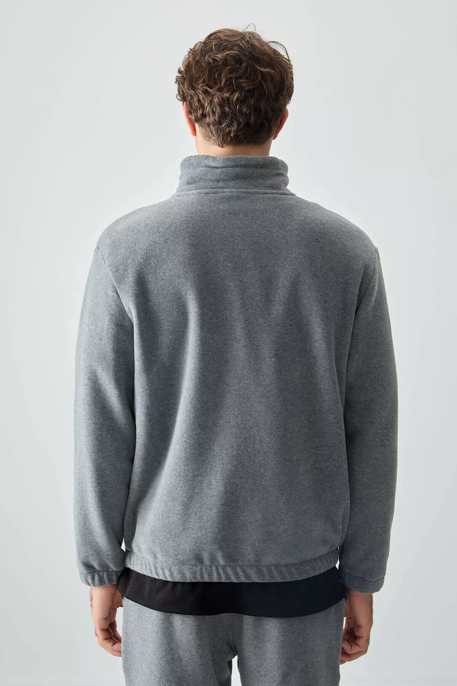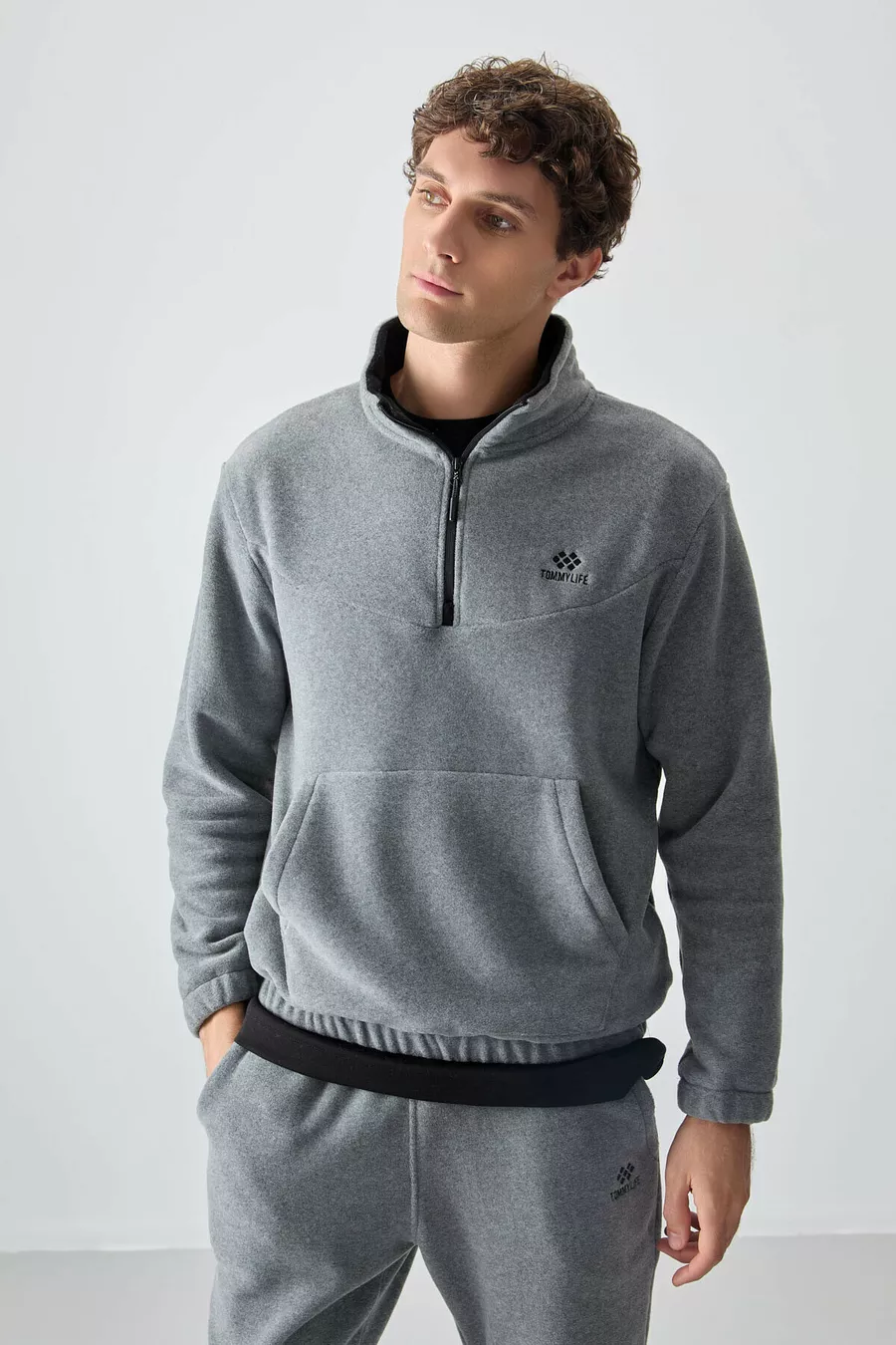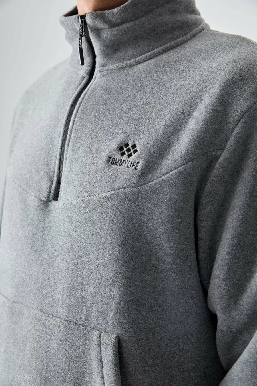 Grijs gemêleerd trainingspak voor heren met halve rits, rechte kraag en elastische boorden -