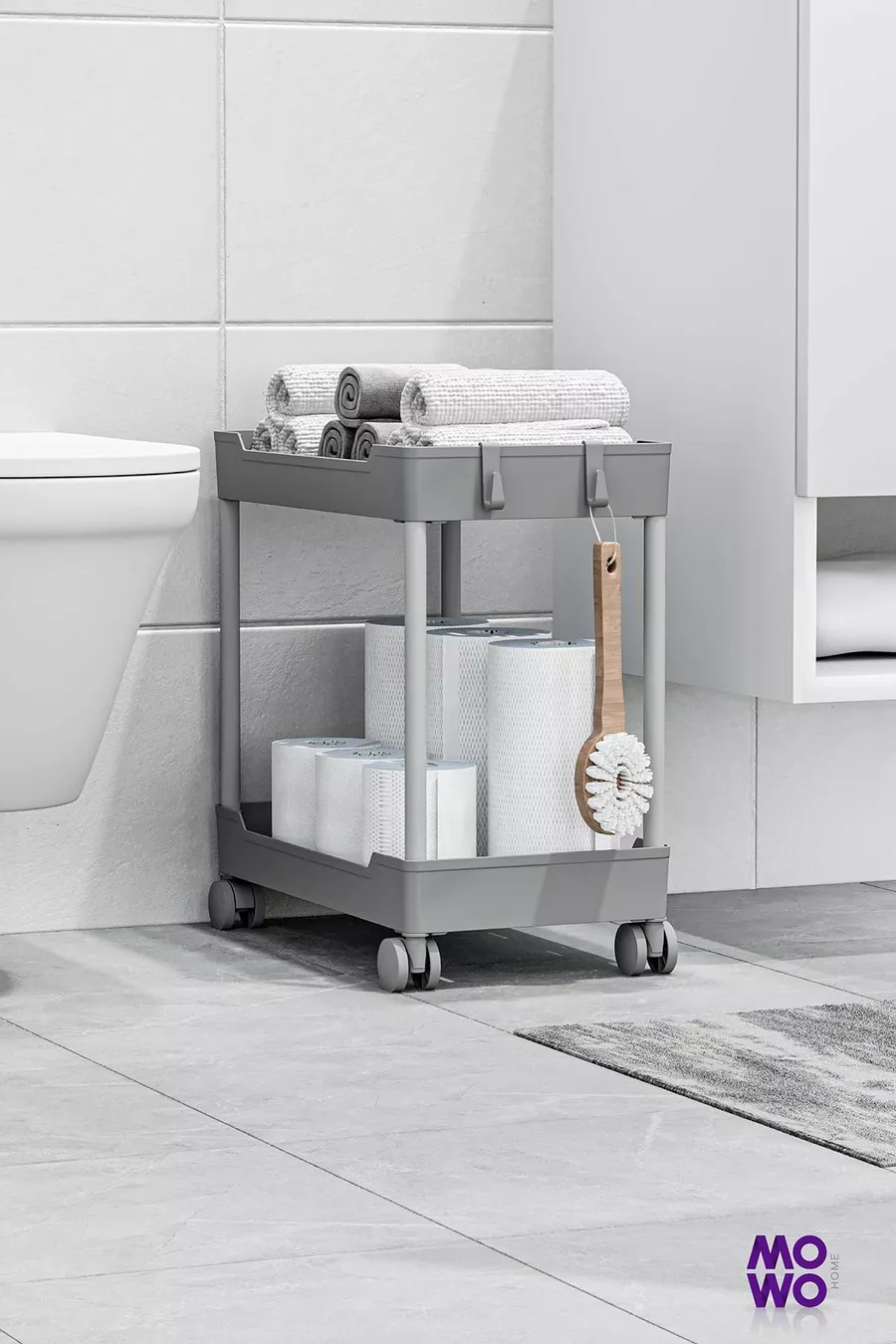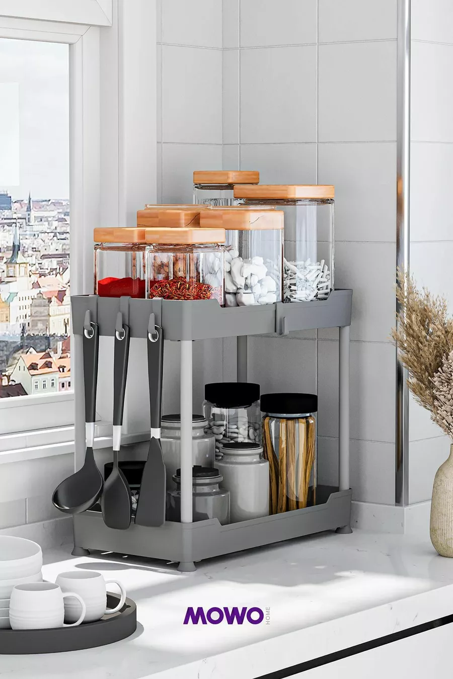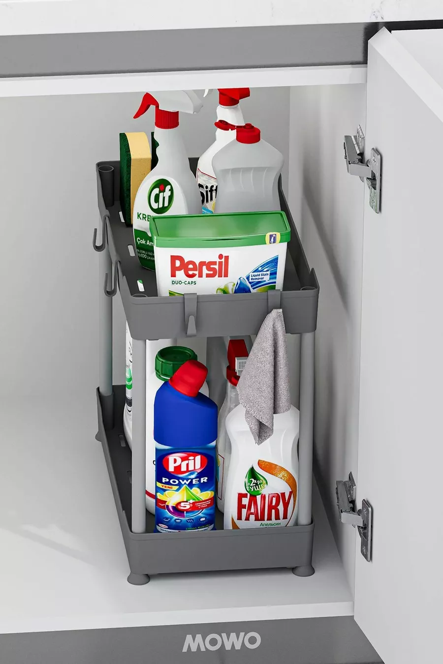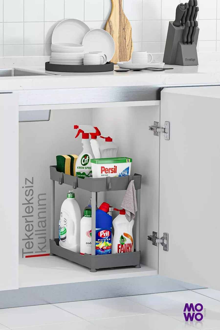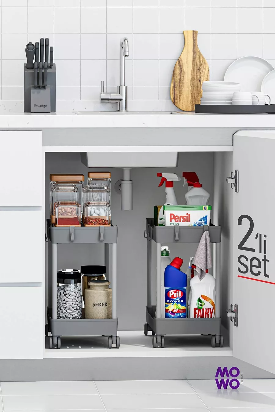 Grijze 2-laags wieltjes organizer set van 2, keukenkastrek, badkamerrek, onder aanrecht, onder de gootsteen voor afwasmiddel