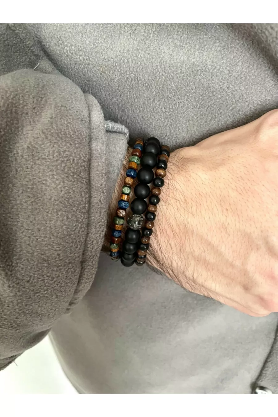 Heren - Zeer Stijlvolle 3-delige Armbanden Set Gemaakt van Massief Hout en Natuursteen