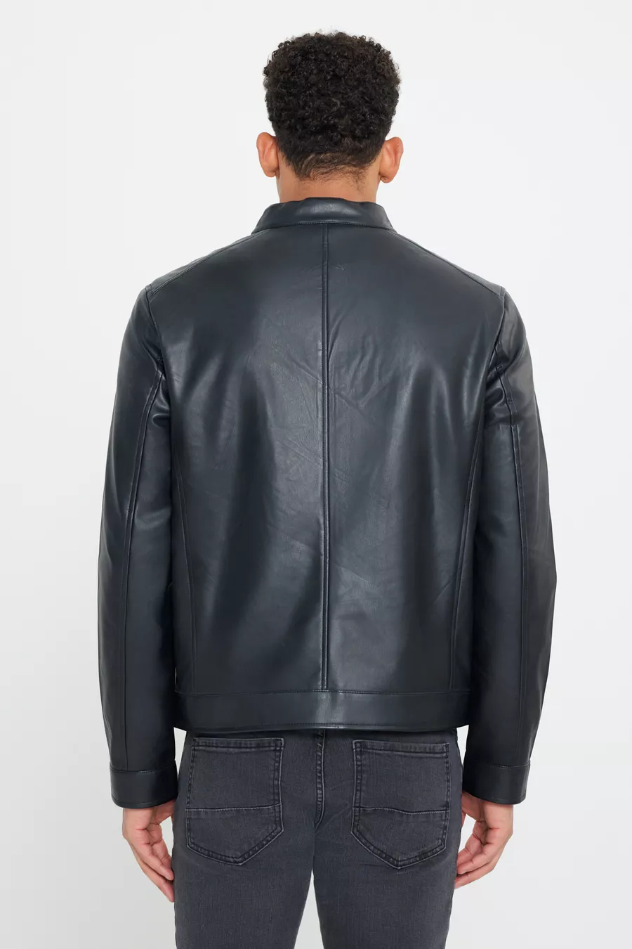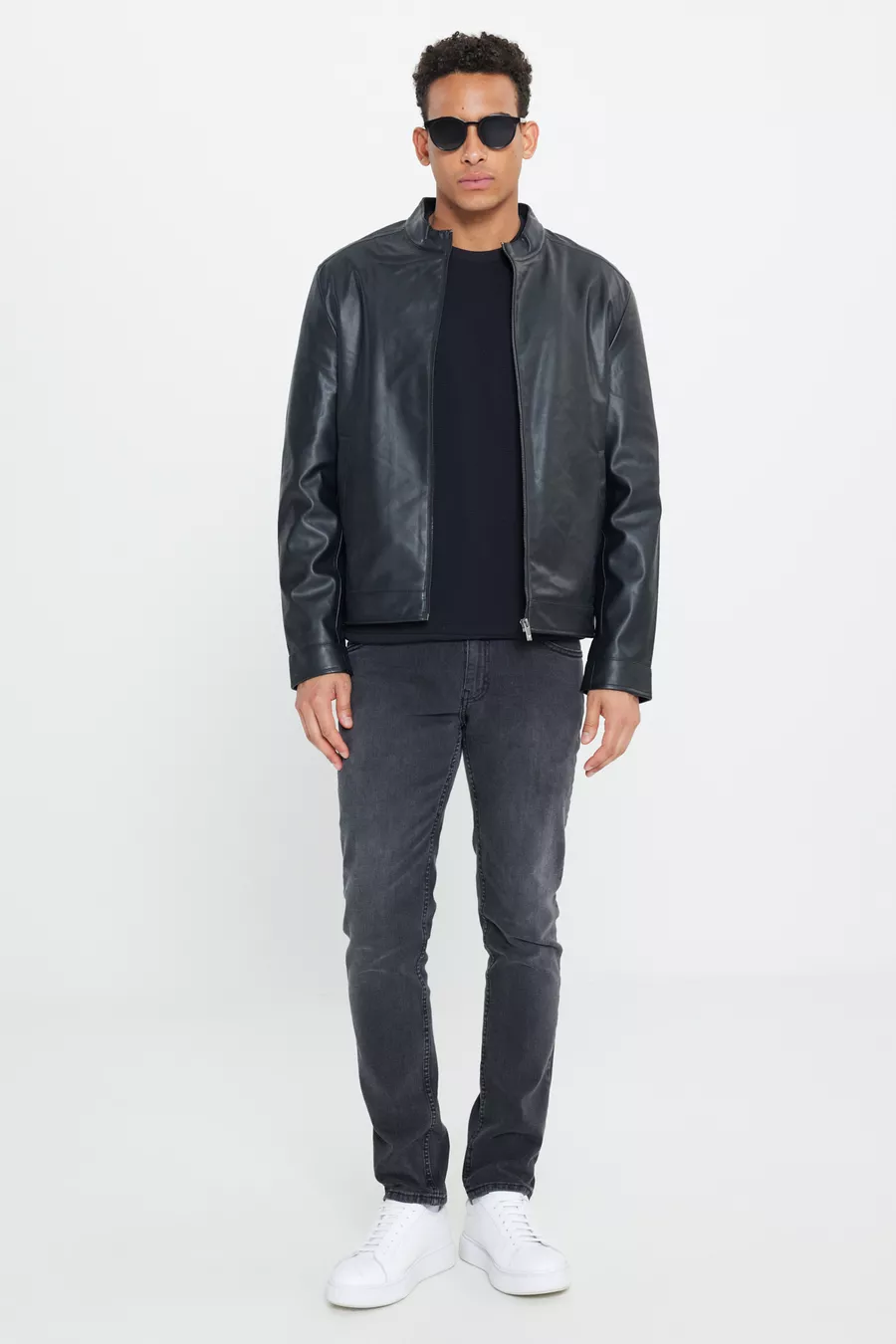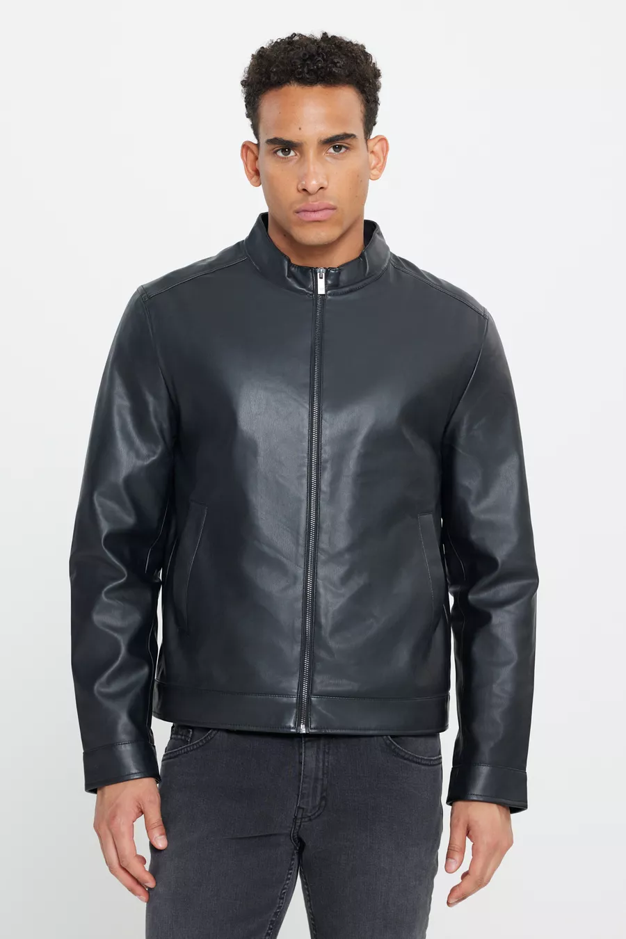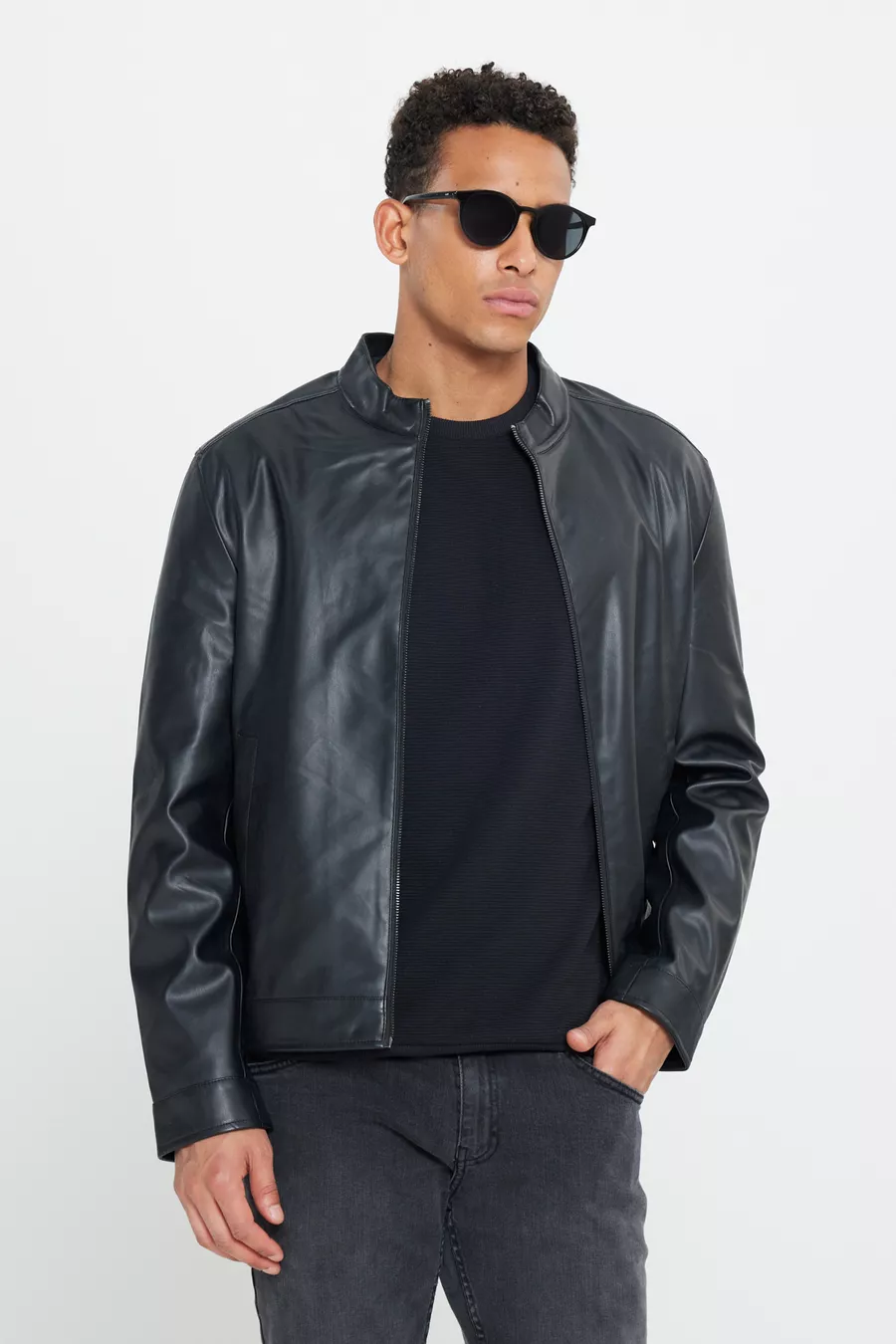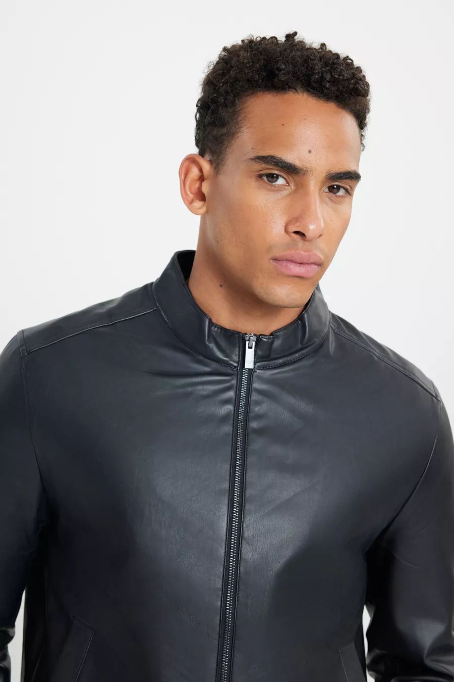 Heren Zwarte Leren Jas Met Rits, Standaard Pasvorm, Normale Snit, Rechte Kraag