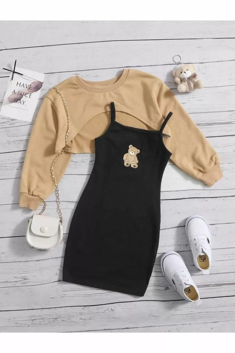 Kinderjurk met Teddyprint & Crop Trui Combinatie