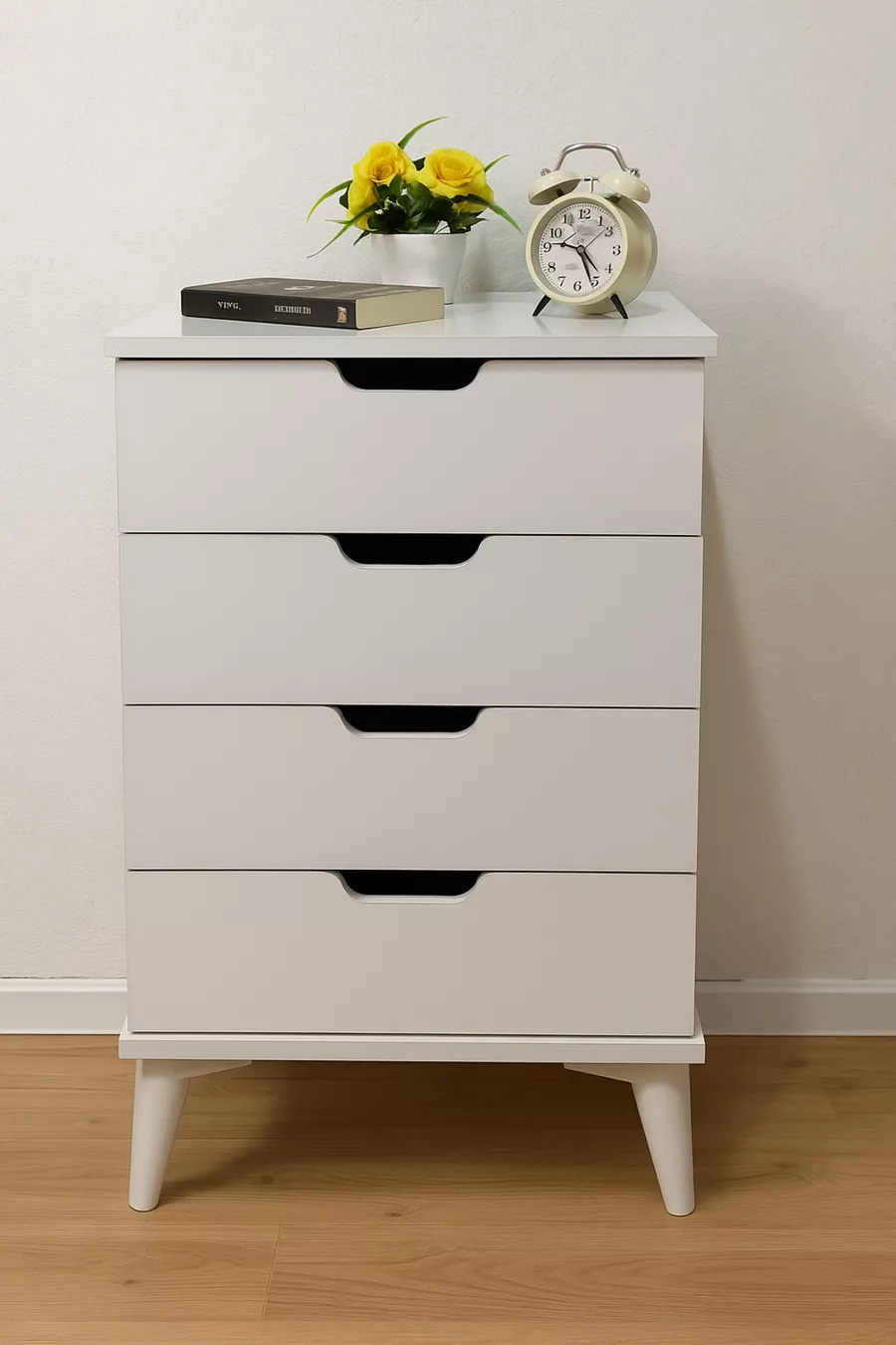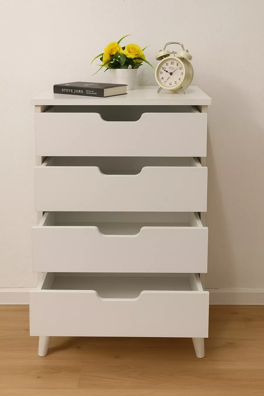 Materiaal: Suntalam Kleur: Wit Garantieperiode: 2 jaar Aantal laden: 4 Hoogte: 81 cm Breedte: 51 cm Diepte: 40 cm Stijl: Retro Thema / Stijl: Retro Herkomst: TR Kenmerk: Lang
