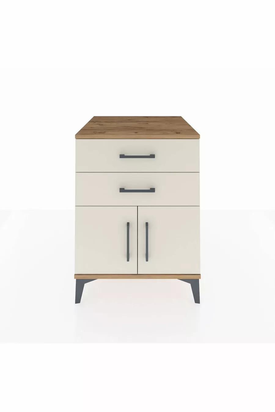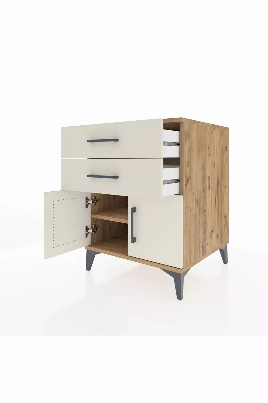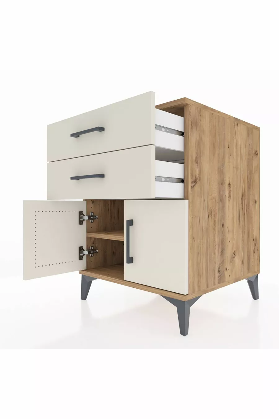 Kronos Nachtkastje met één plank, 2 lades en 2 deuren, dennen-ijzersteen