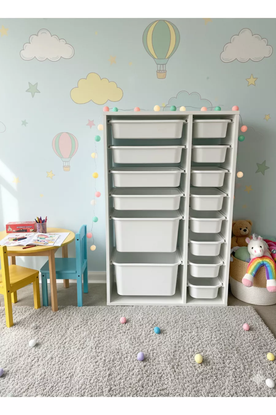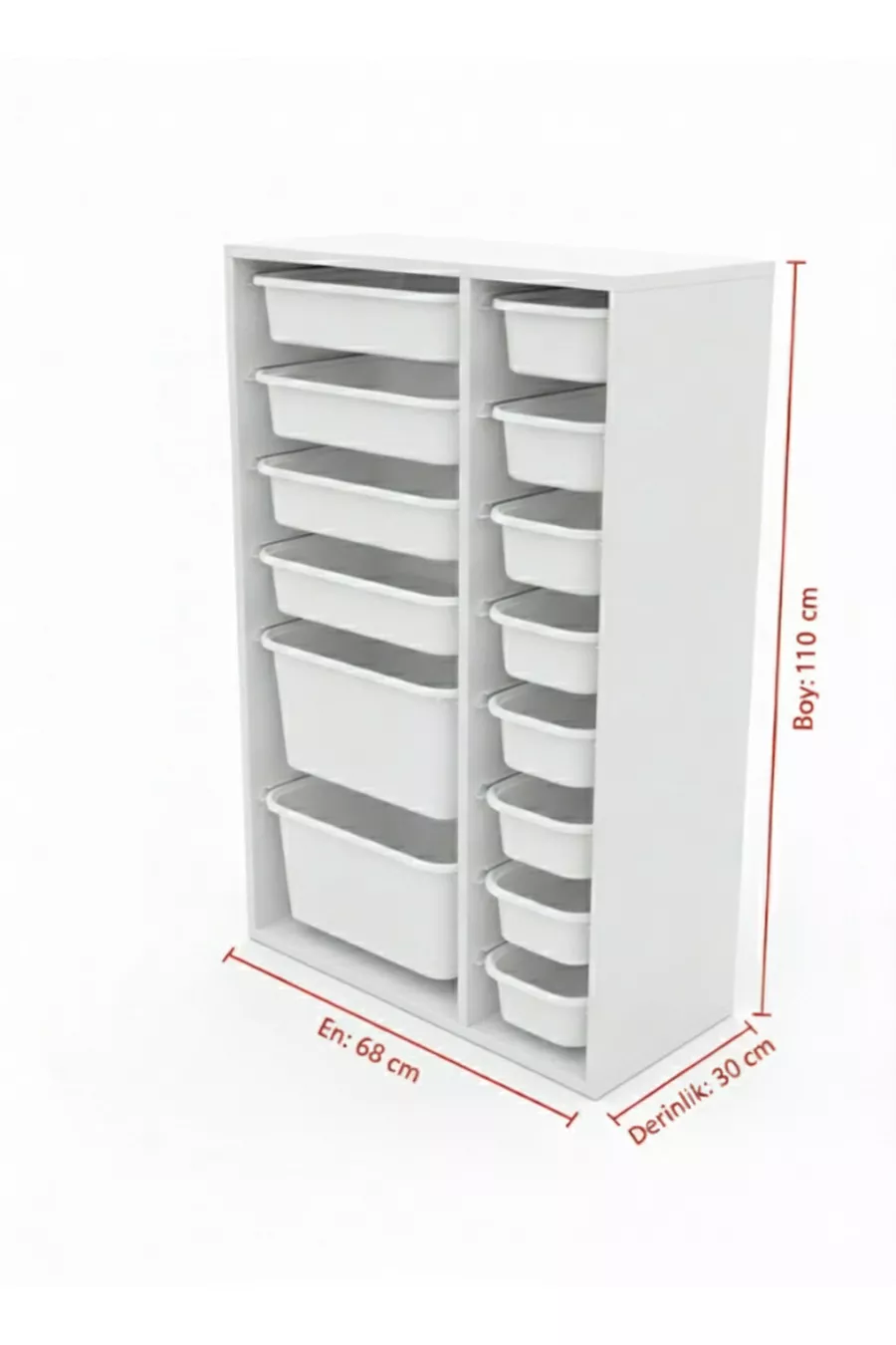 Materiaal: Polypropyleen Aantal lades: 14 Breedte: 69 cm Diepte: 30 cm Hoogte: 110 cm Kleur: Wit Thema / Stijl: Modern Herkomst: TR Leeftijd: Alle leeftijdsgroepen Kenmerk: Met lades