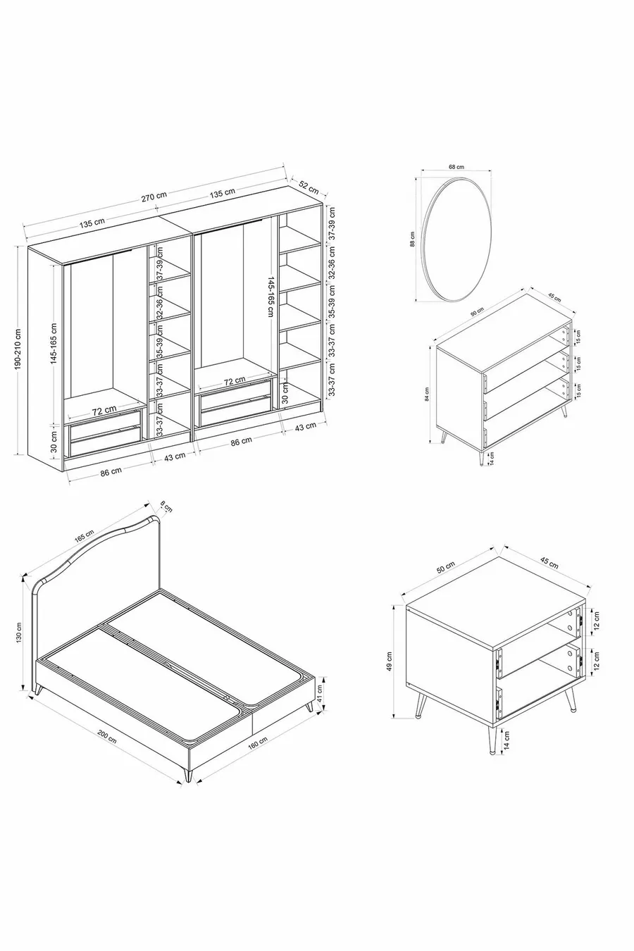Setinhoud: Kast + 2 Nachtkastjes + Ladekast + Hoofdeinde bed