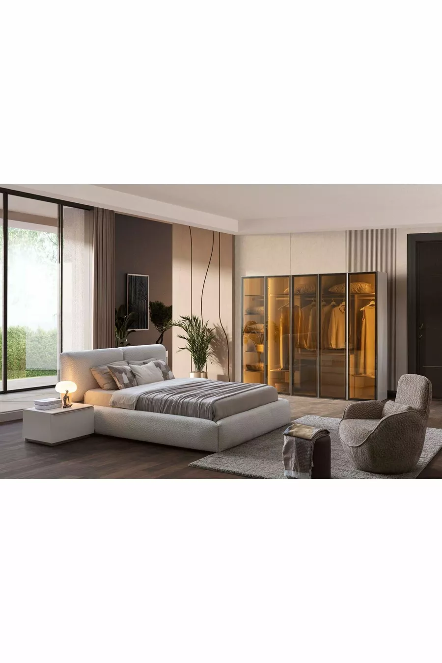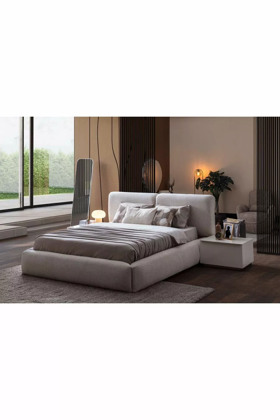 Setinhoud: Kast + 2 nachtkastjes + ladekast + hoofdbord van boxspring