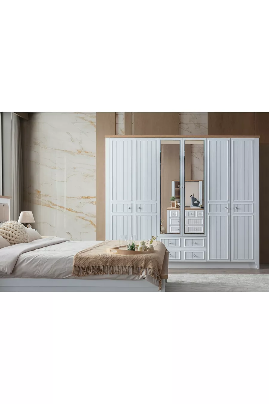 Setinhoud: Bed + 2 nachtkastjes + ladekast + kast