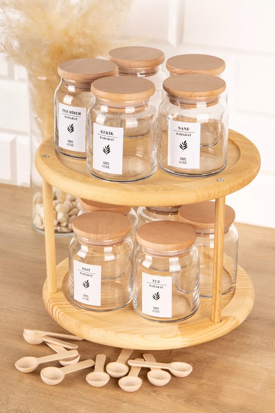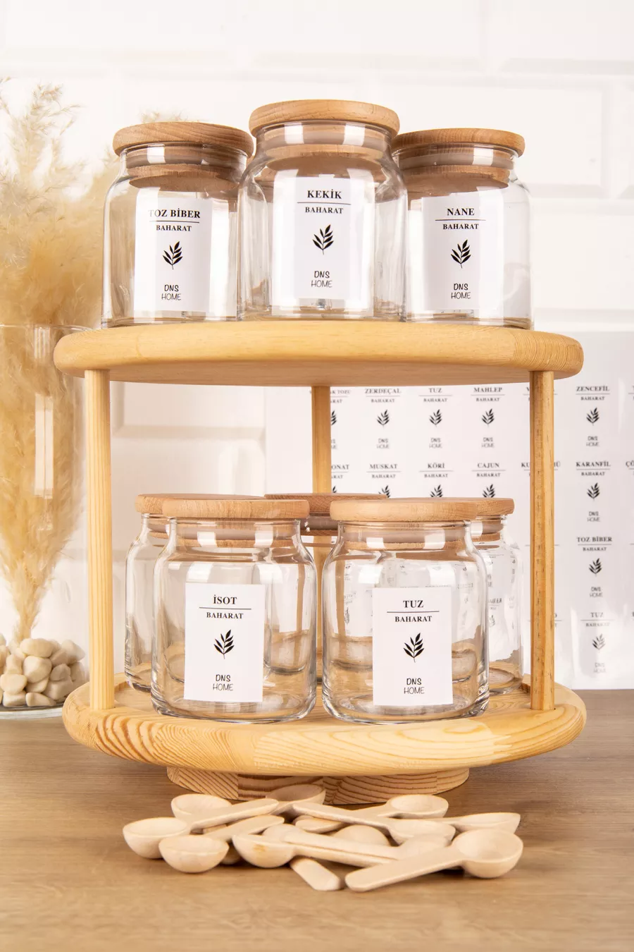 'lu Houten Rechte Vacuüm Deksel Kruidenpot Set met Lepel en Draaiende Standaard, Geëtiketteerde Glazen Bewaarpot