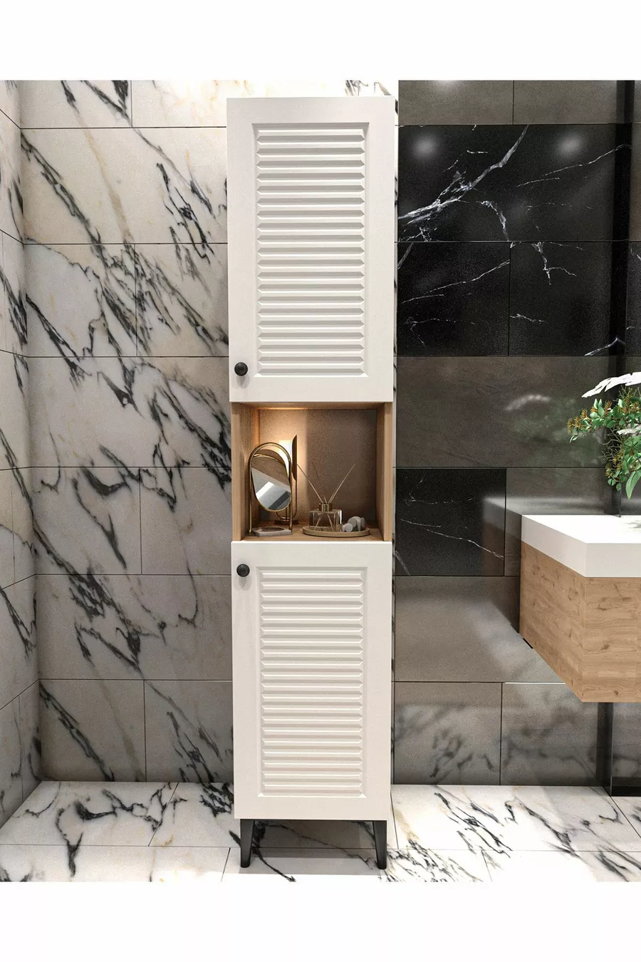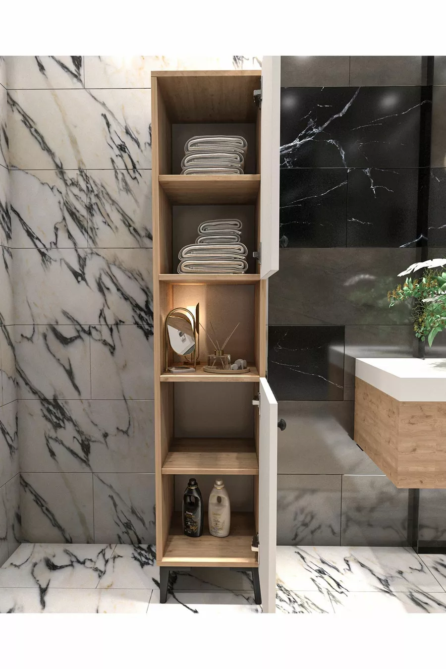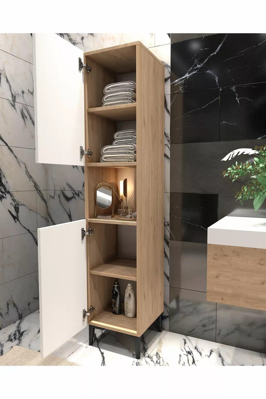 Aantal deuren: 2 Materiaal: Spaanplaat met fineer Kleur: Bruin Aantal lades: 1 Functie: Met deur Kastmaat: 172 x 33 x 30 Model: Set Stijl: Modern Thema / Stijl: Modern Herkomst: TR Kenmerk: Overig