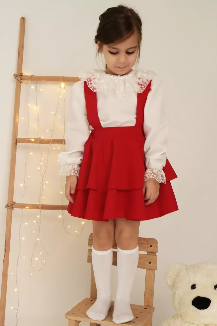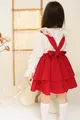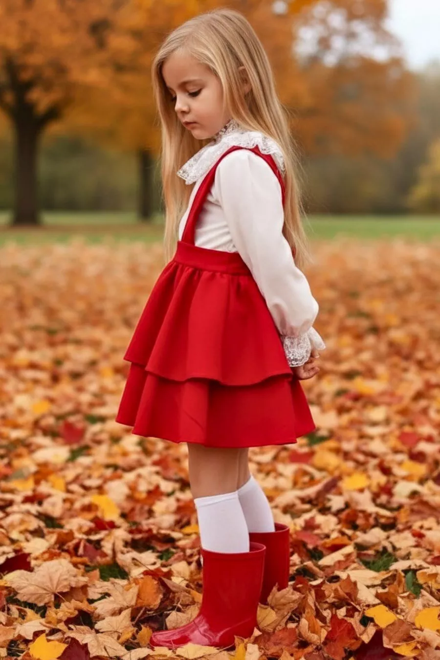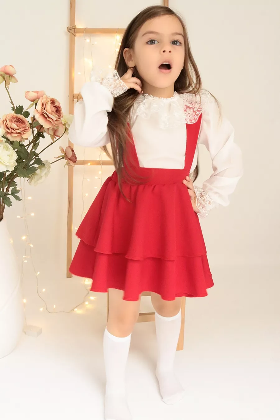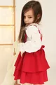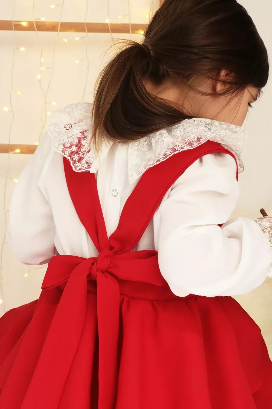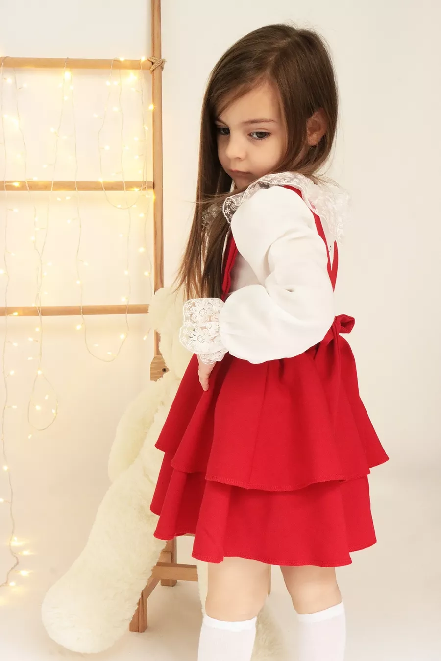 Meisjesjurk rood met hemdjurk en kanten blouse, lange mouwen, april en oktober showkostuum