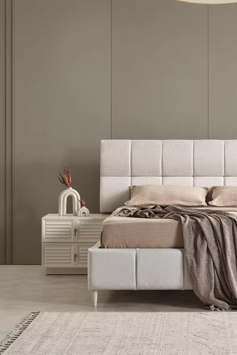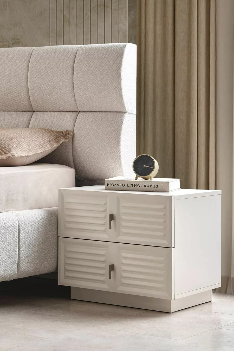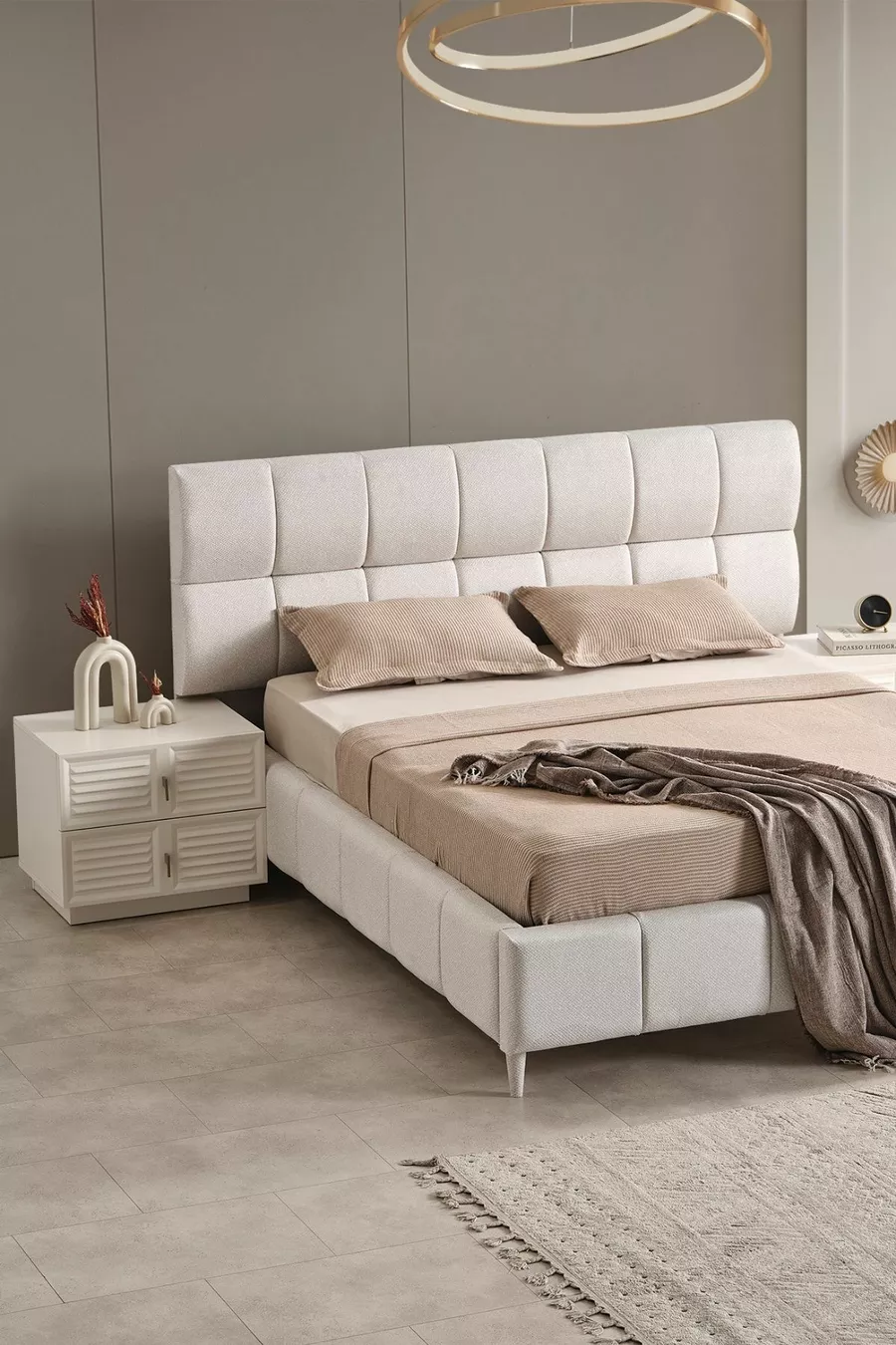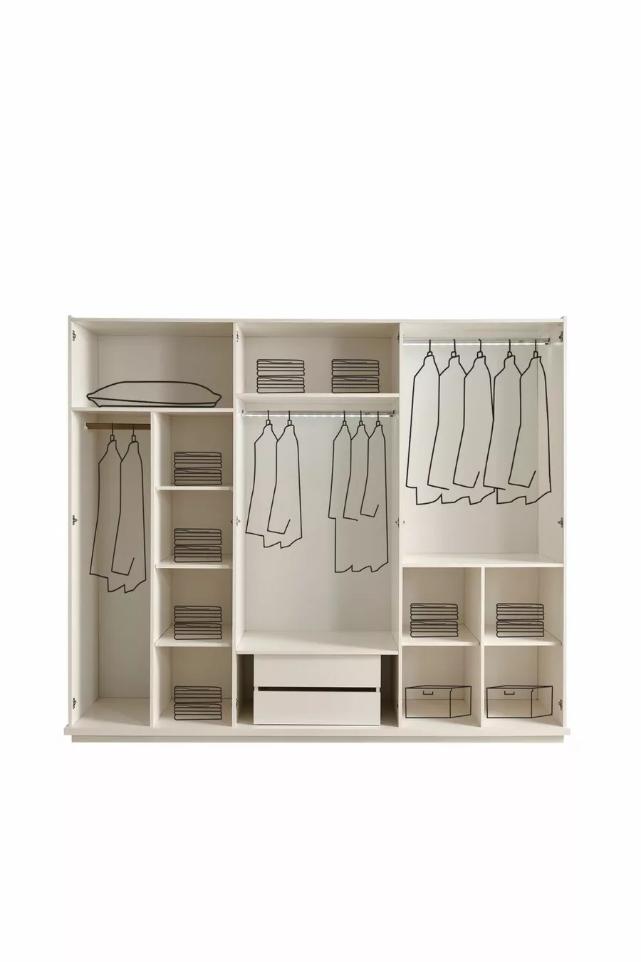 Setinhoud: Bed met opslag + 2 nachtkastjes + ladekast + kledingkast