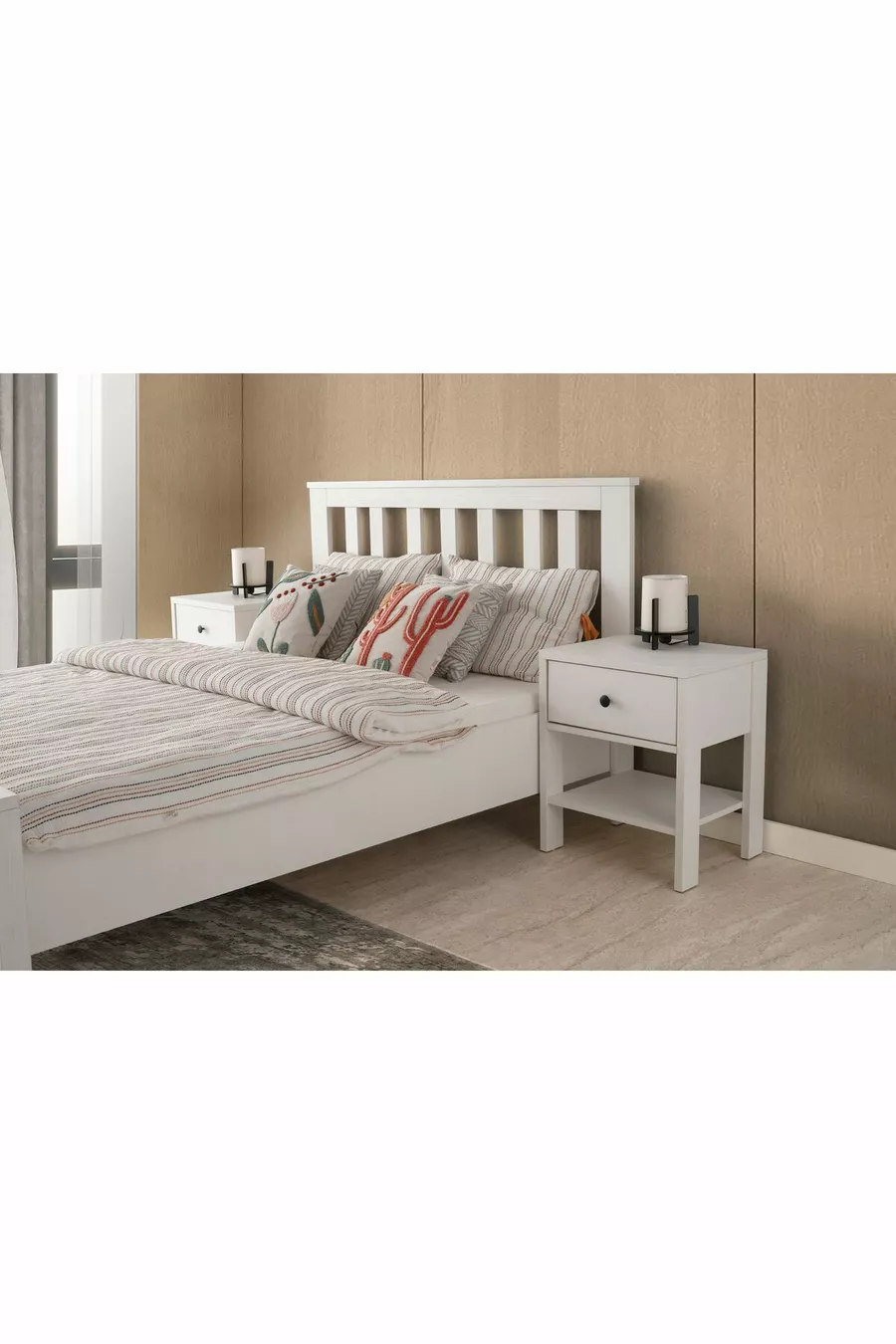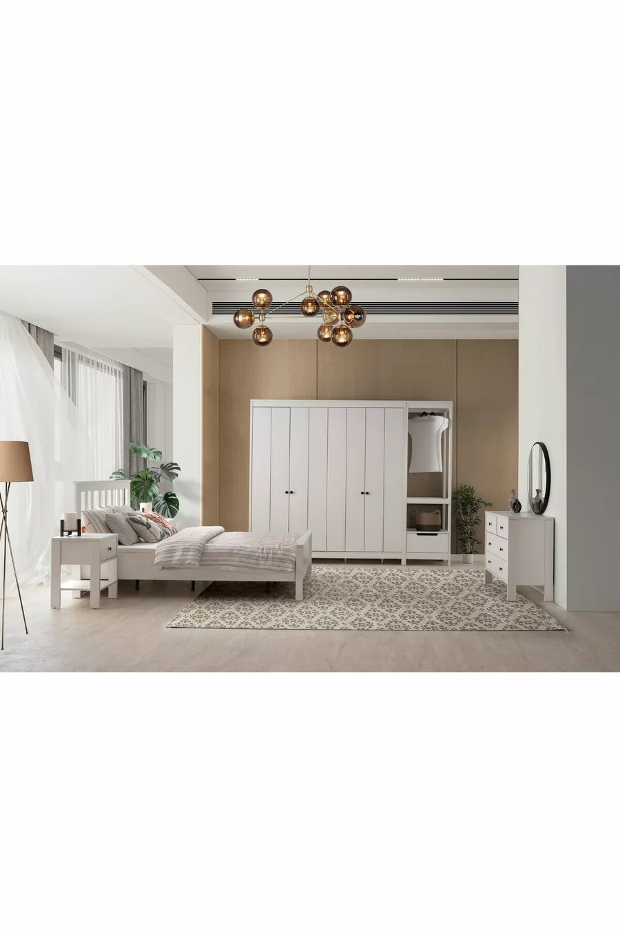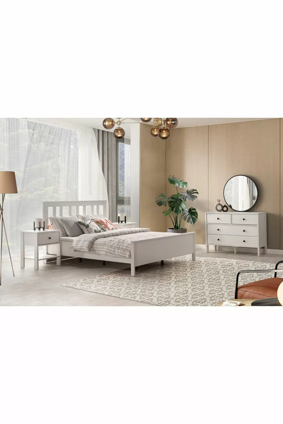 Setinhoud: Bed + 2 nachtkastjes + ladekast + kast + spiegel