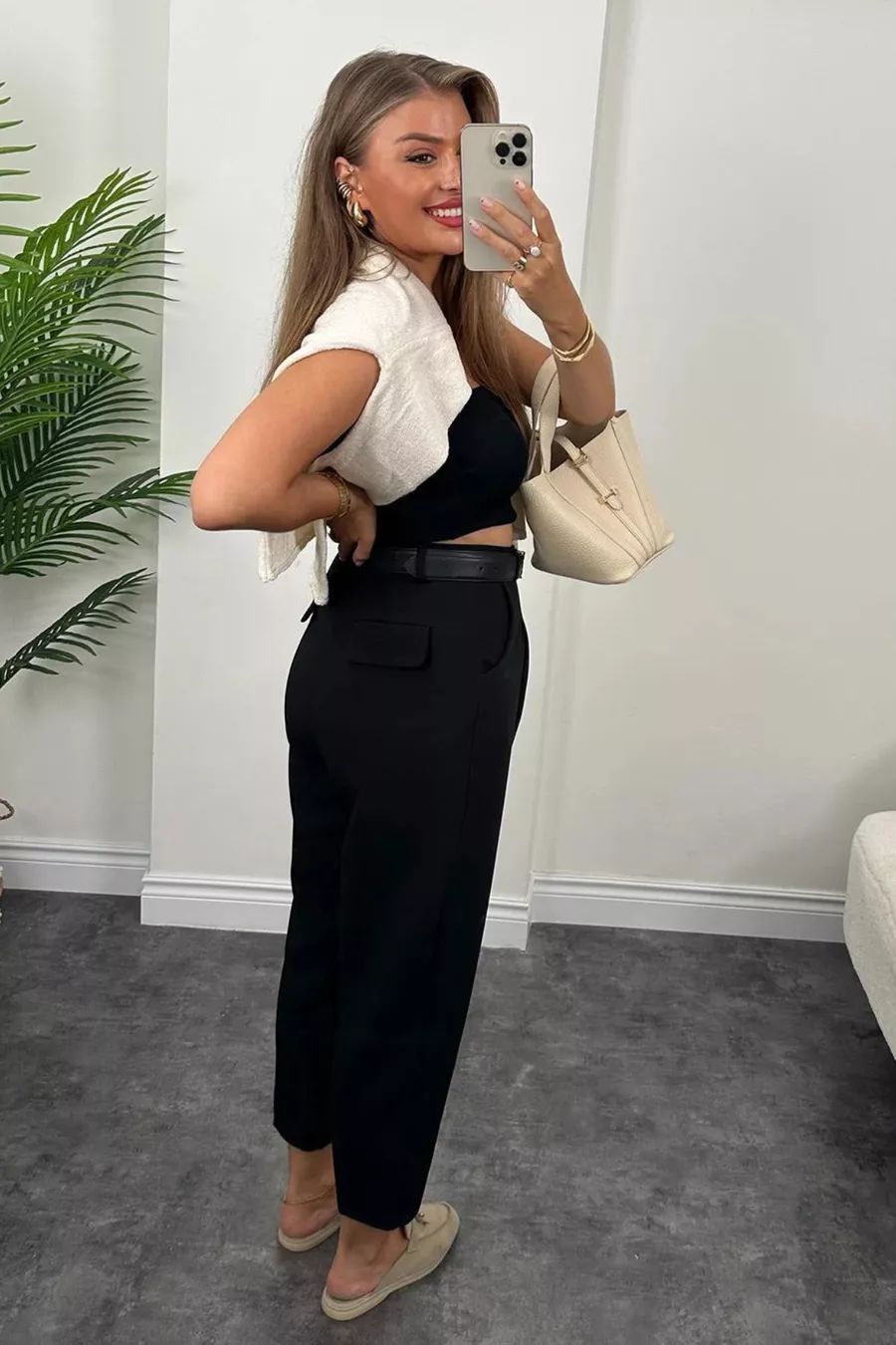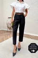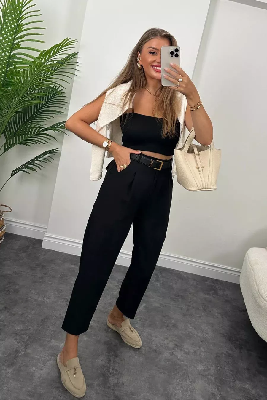 Materiaal: Stof Type stof: Geweven Pijptype: Smal/Steek Taille: Hoge taille Patroon: Effen Kleur: Zwart Zak: Dubbel met klep Productdetails: Met riem Collectie: Basic Dikte: Midden Voering: Zonder voering Lengte: Lang Silhouet: Kokervorm/Bloembroek Omgeving: Kantoor Pasvorm: Kokervorm/Bloembroek Extra kenmerk: Kreukbestendig Type weving: Interlock Persoon: Kantoor Druk/ Borduurtechniek: Zonder print Riem / Tailleband: Met riem Duurzaamheidsdetails: Nee Materiaalcomponent: 65% Polyester, 35% Katoen Wasinstructies: TYPE1 Seizoen: Alle seizoenen Herkomst: TR Doosstatus: Geen doos Verpakkingsinhoud: Enkel