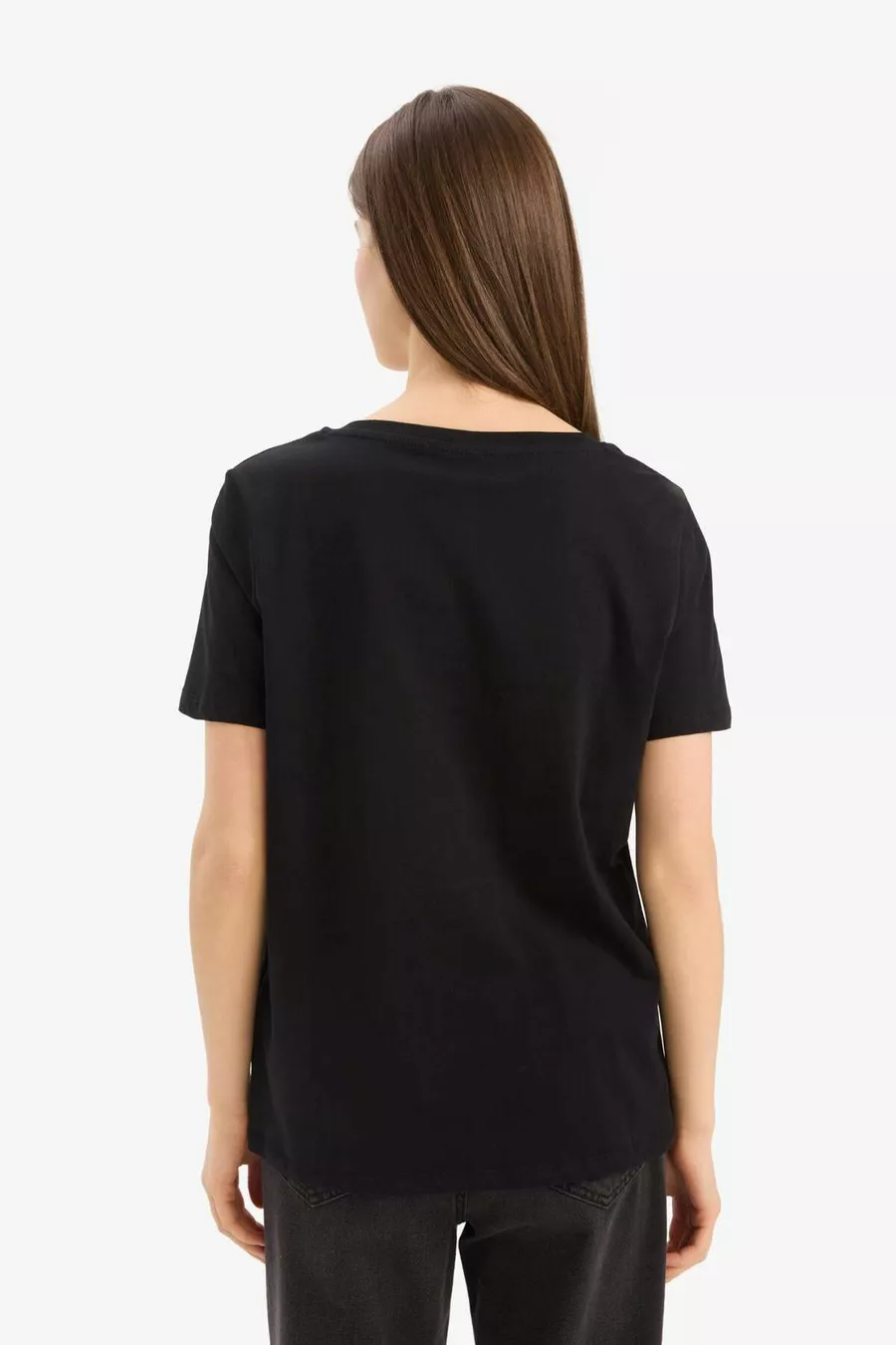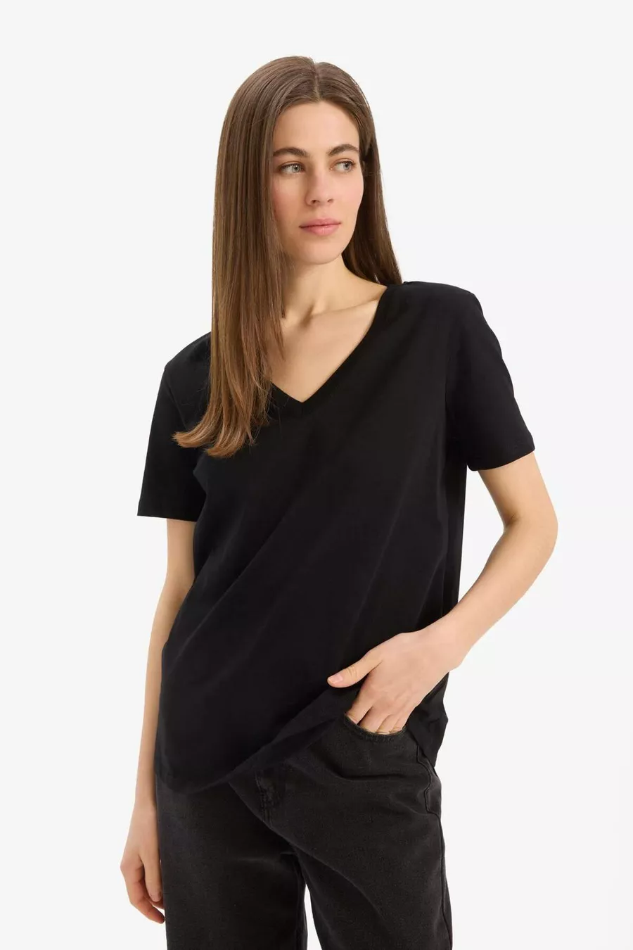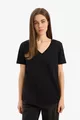 Patroon: Effen Pasvorm: Regular Kraagtype: V-hals Materiaal: Katoen Stofsoort: Gebreid Mouwtype: Korte mouw Kleur: Zwart Inhoud van de verpakking: Enkel Techniek: Geen Zak: Zonder zakken Mouwlengte: Kort Collectie: Basic Lengte: Standaard Omgeving: Casual/Alledaags Extra kenmerk: Geen extra kenmerk Druk/ borduurtechniek: Zonder print Duurzaamheidsdetails: Nee Weefwijze: Effen geweven Silhouet: Basic Persona: Cool & Comfort Materiaalsamenstelling: 100% Model Wasvoorschrift: Type 3 Herkomst: TR