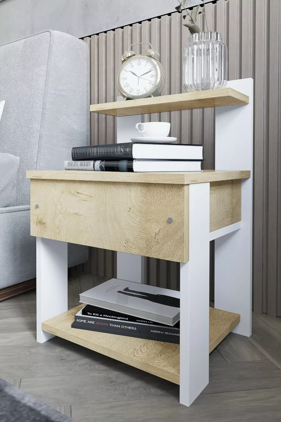 Materiaal: Suntalam Kleur: Wit Aantal lades: 1 Hoogte: 75 cm Breedte: 45 cm Diepte: 40 cm Herkomst: TR Kenmerk: Met lade