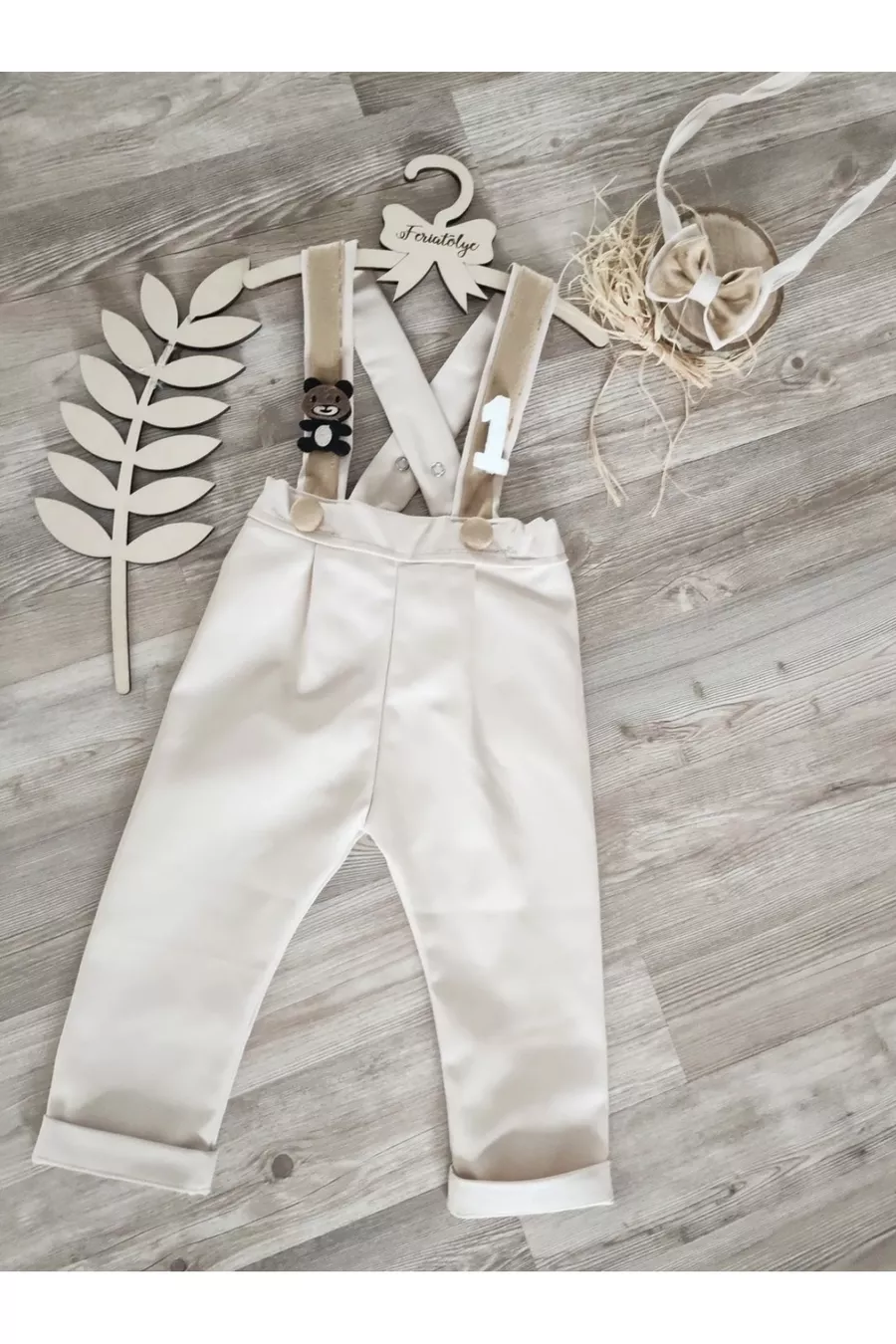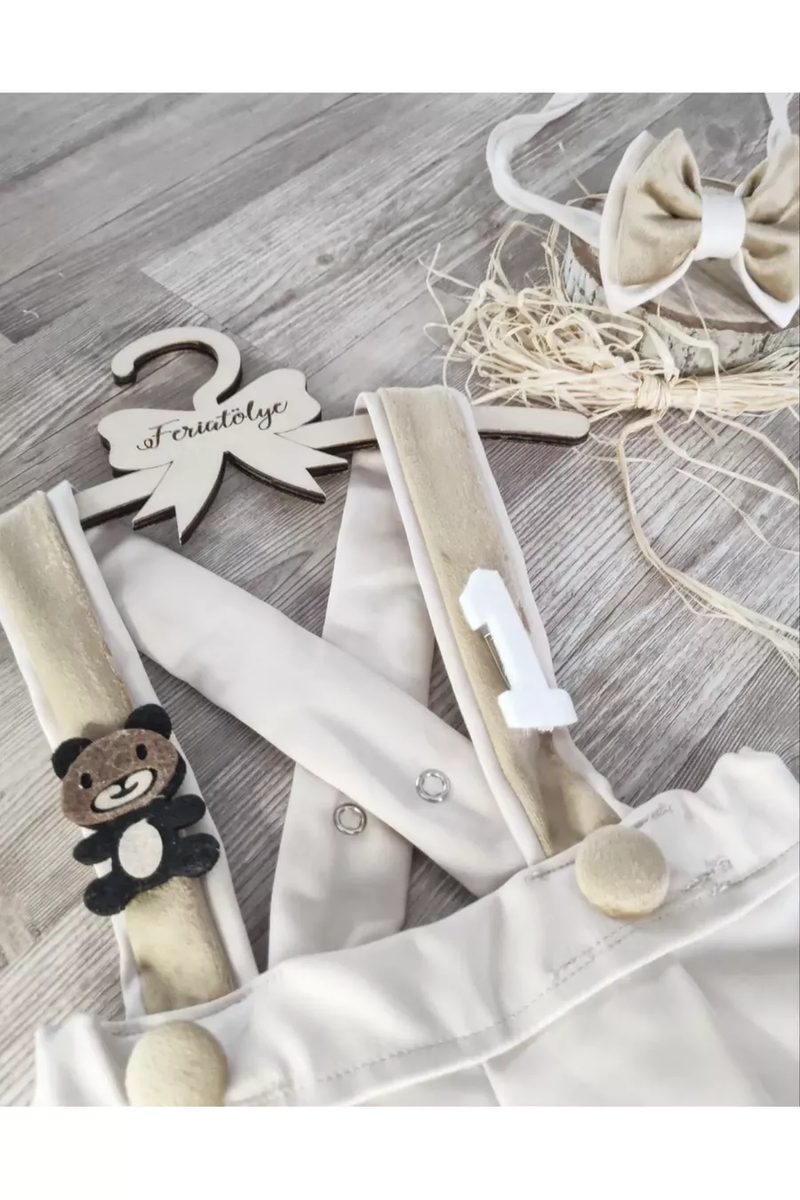 Romperpakje met gouden details en berenmotief, inclusief strik, verjaardagsoutfit