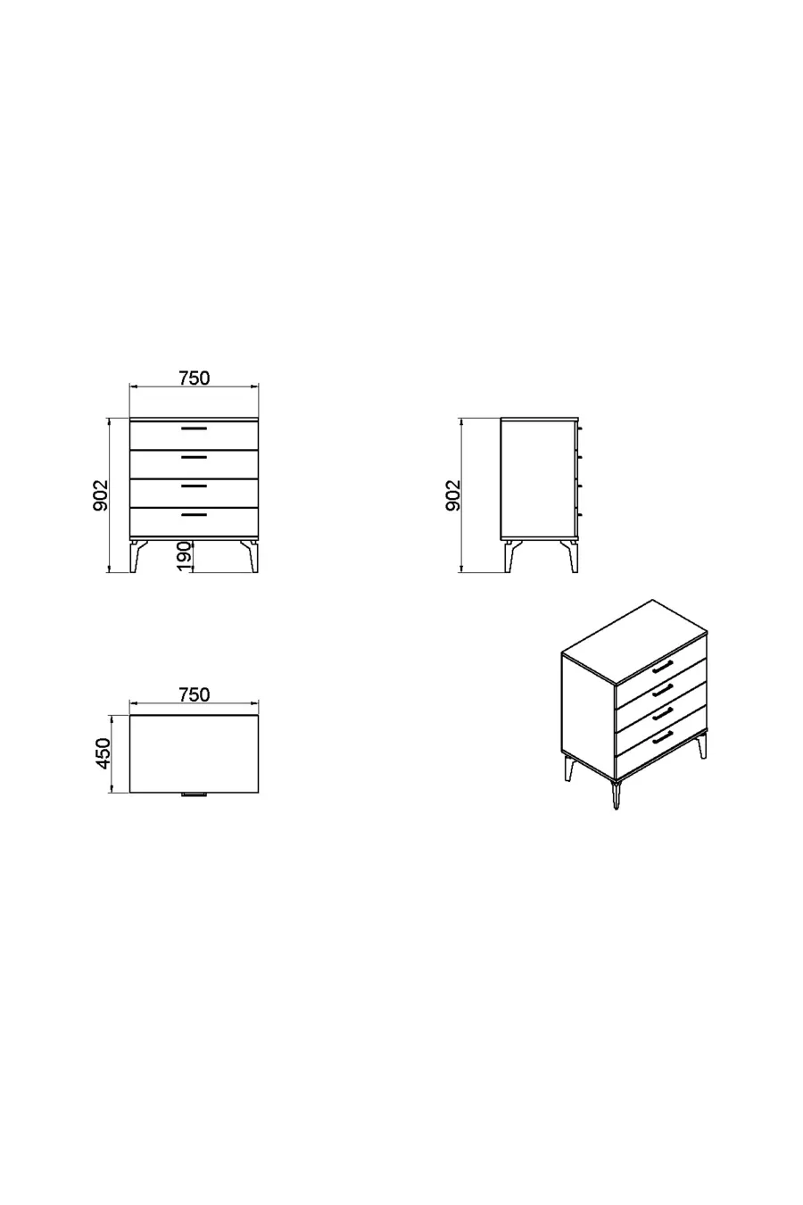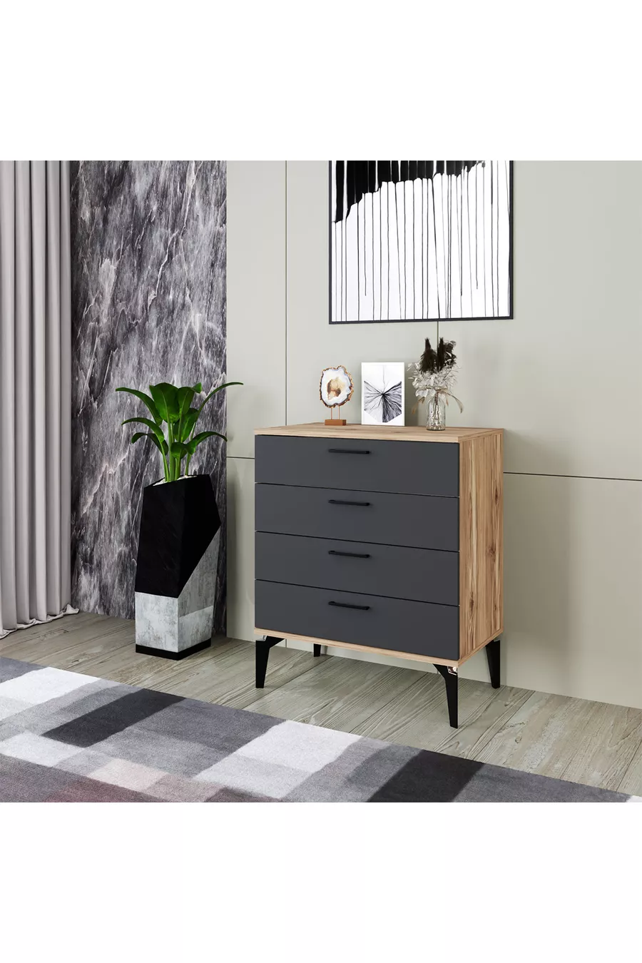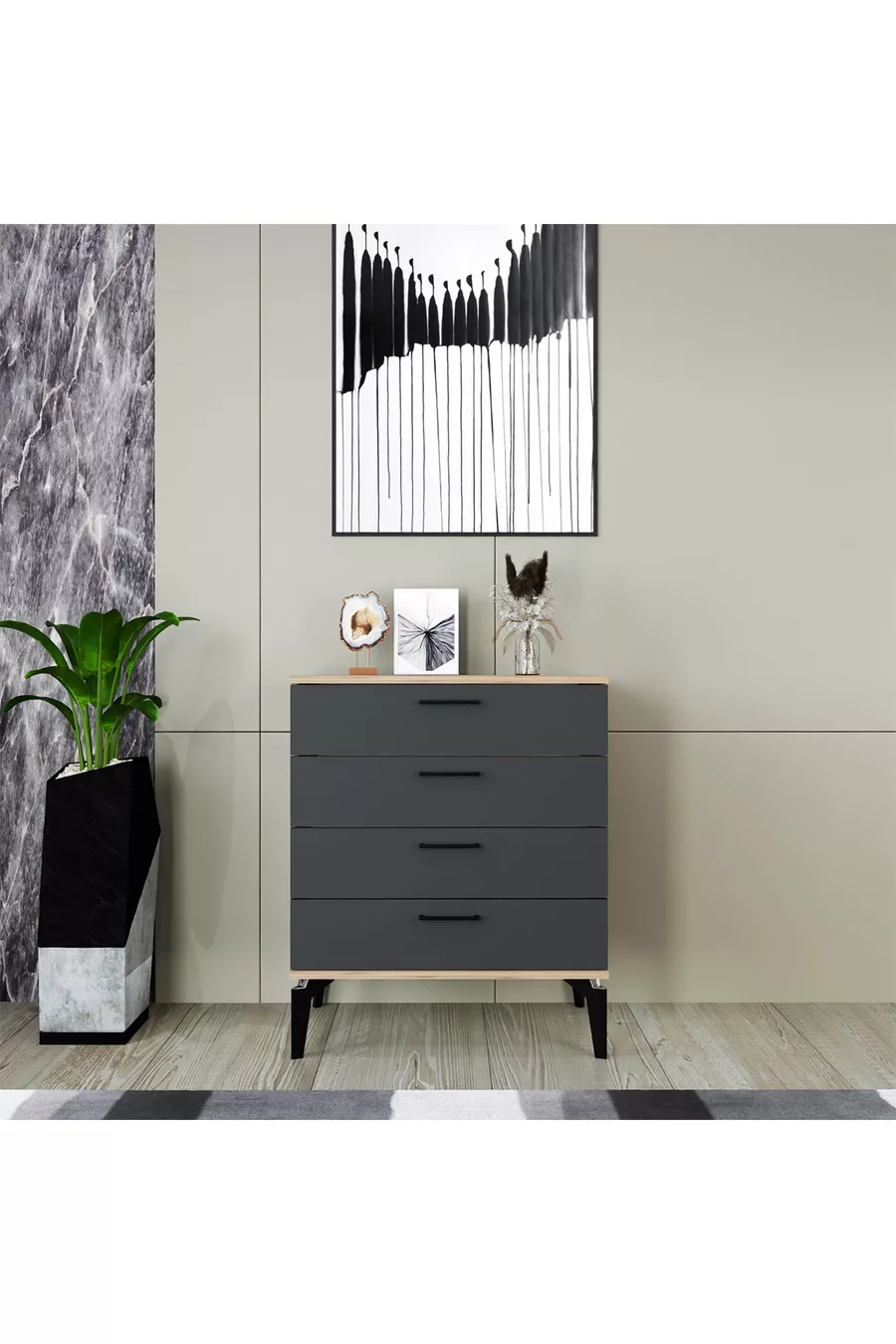 Kleur: Grijs Garantieperiode: 2 jaar Materiaal: Spaanplaat Hoogte: 90 cm Breedte: 75 cm Diepte: 45 cm Aantal lades: 4 Productkenmerk: Met lades Stijl: Modern Thema / Stijl: Scandinavisch Kenmerk: Met lades