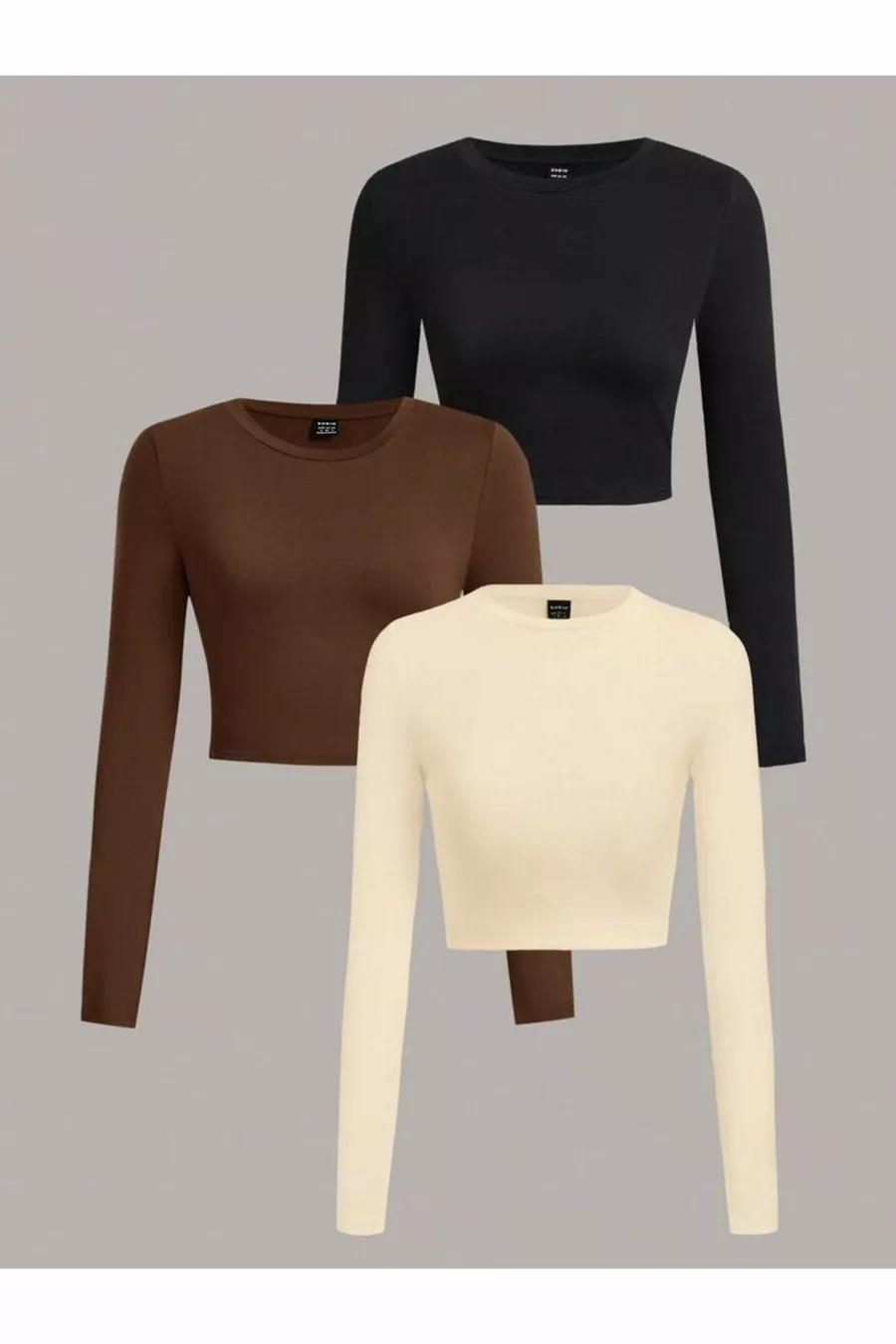 Set van 3 Dames Ribgebreide Crop Top met Ronde Hals
