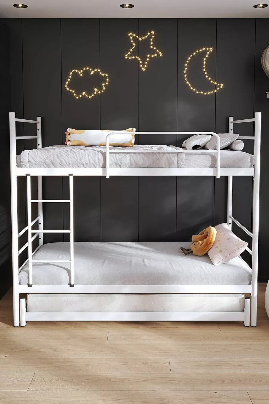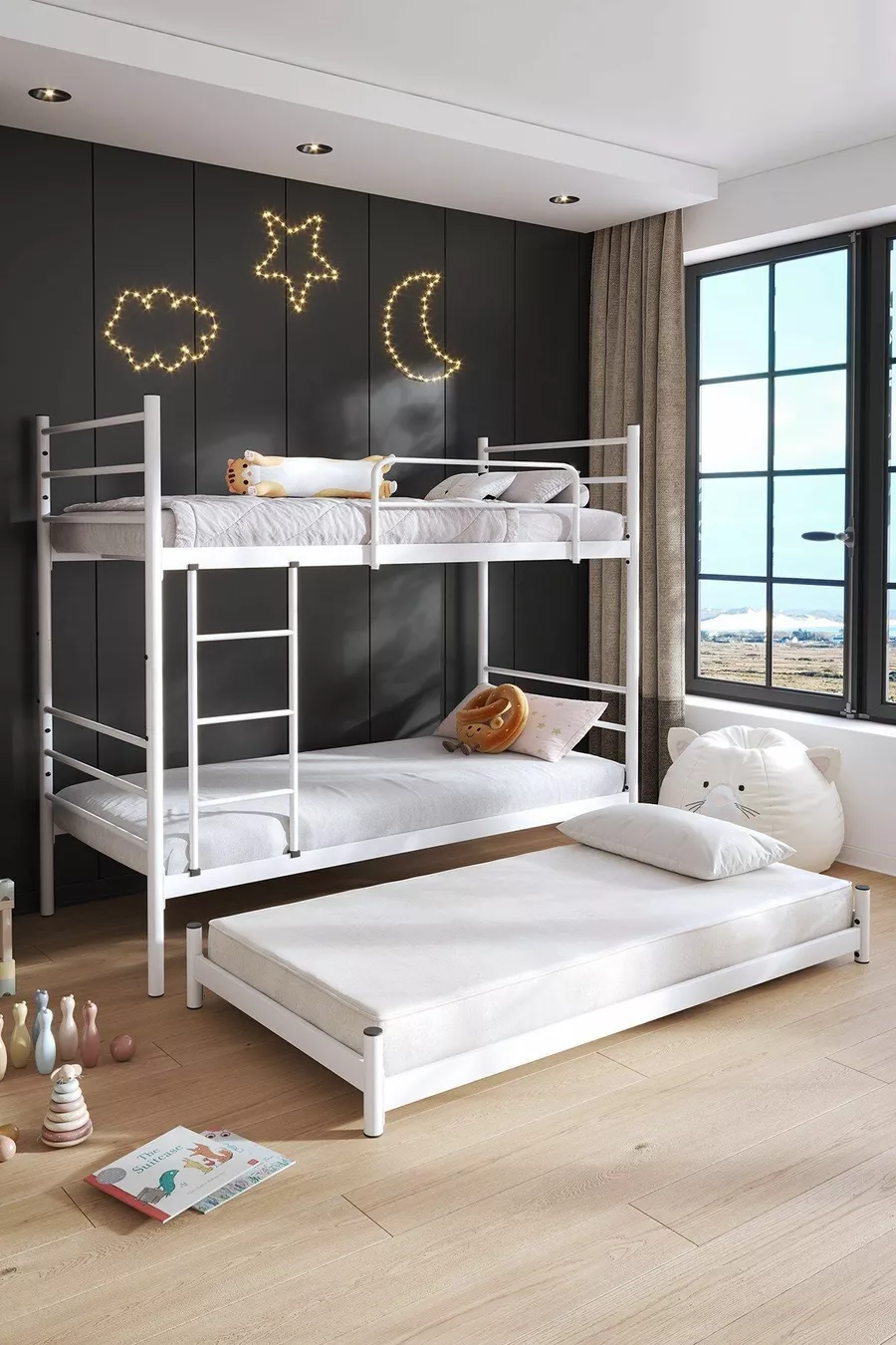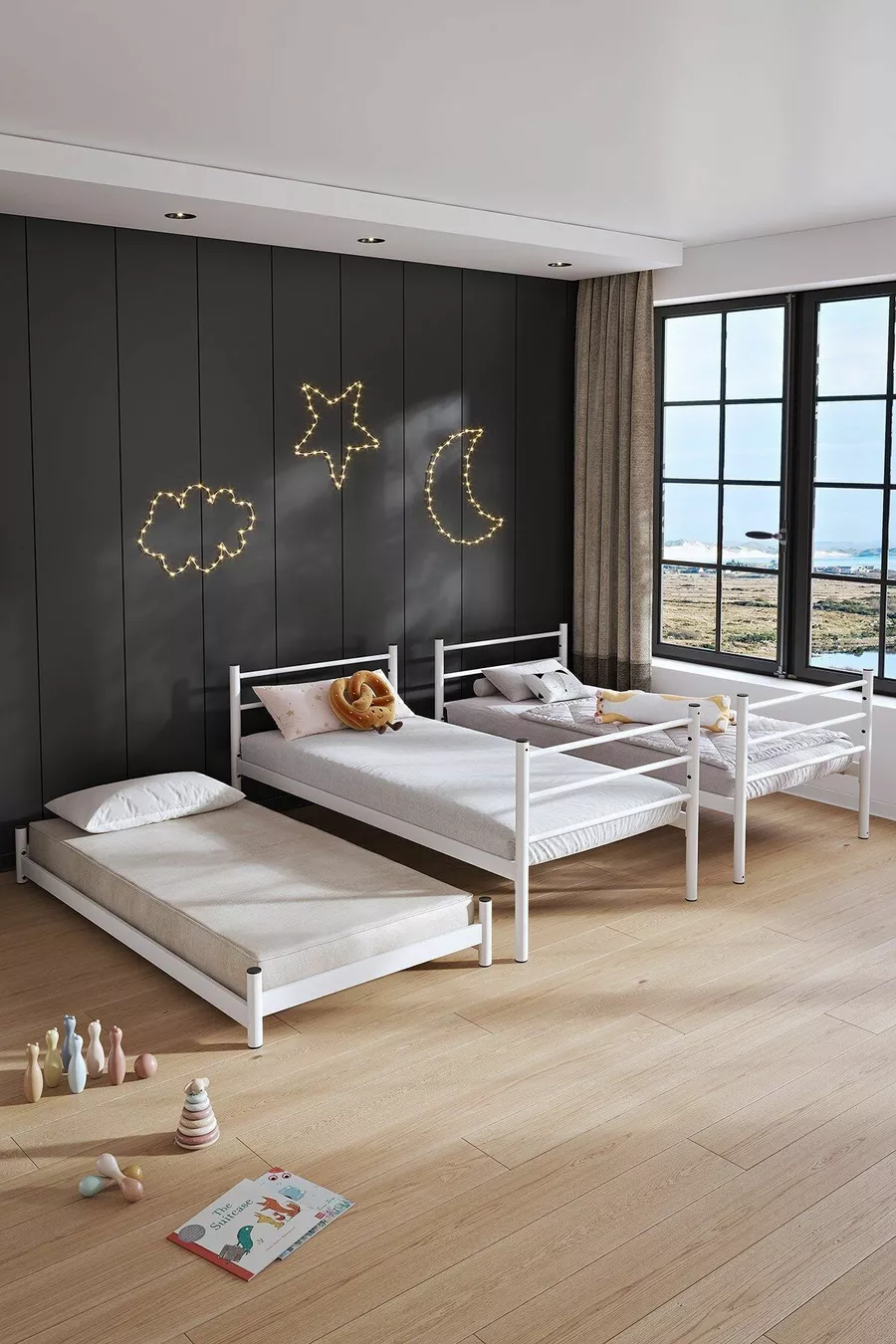 Kleur: Wit Materiaal: Metaal Maat: Tweepersoons Afmetingen: 90 x 190 Garantie: 2 jaar Stijl: Scandinavisch Thema / Stijl: Retro Bed met lade: Ja Eigenschap: Lang