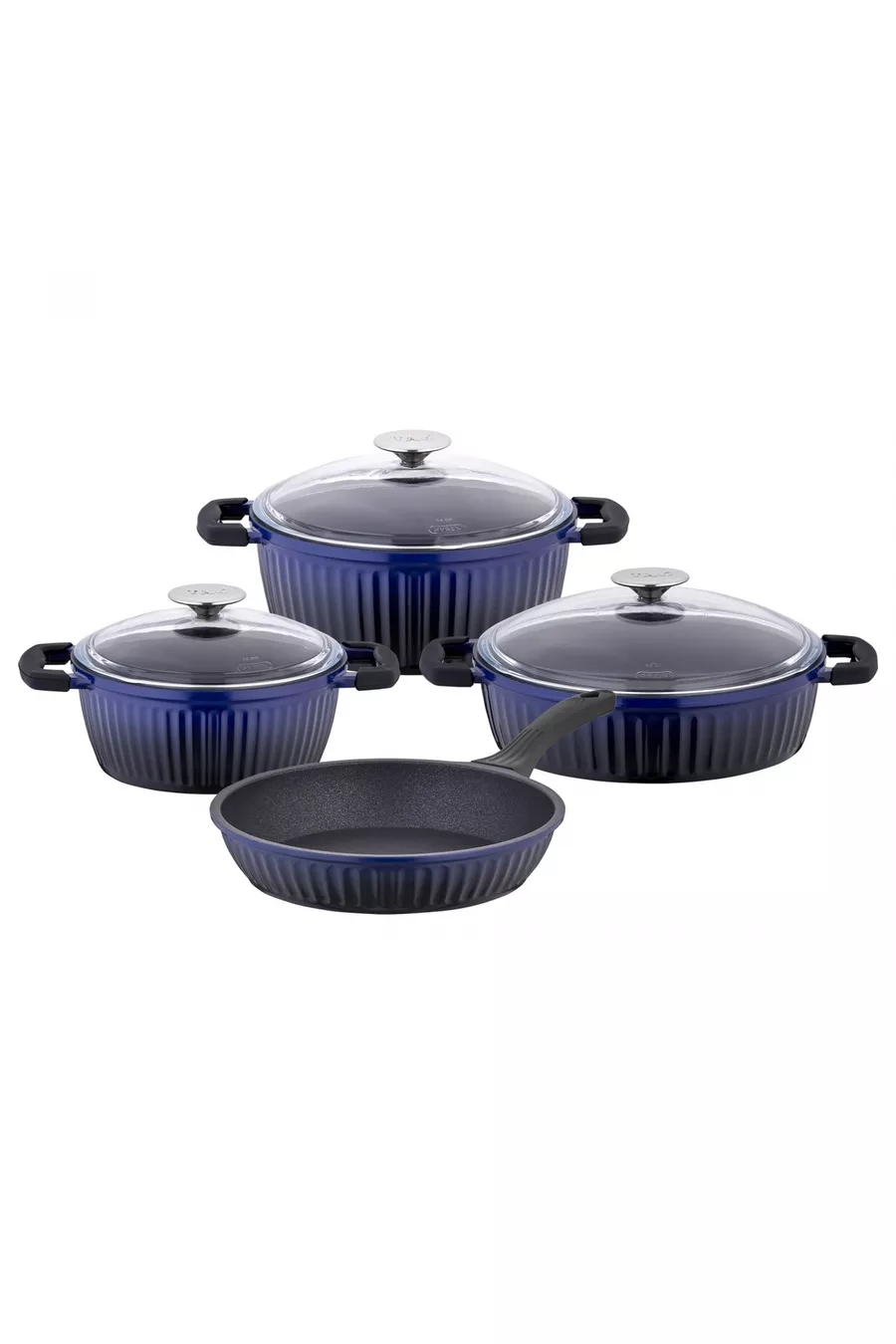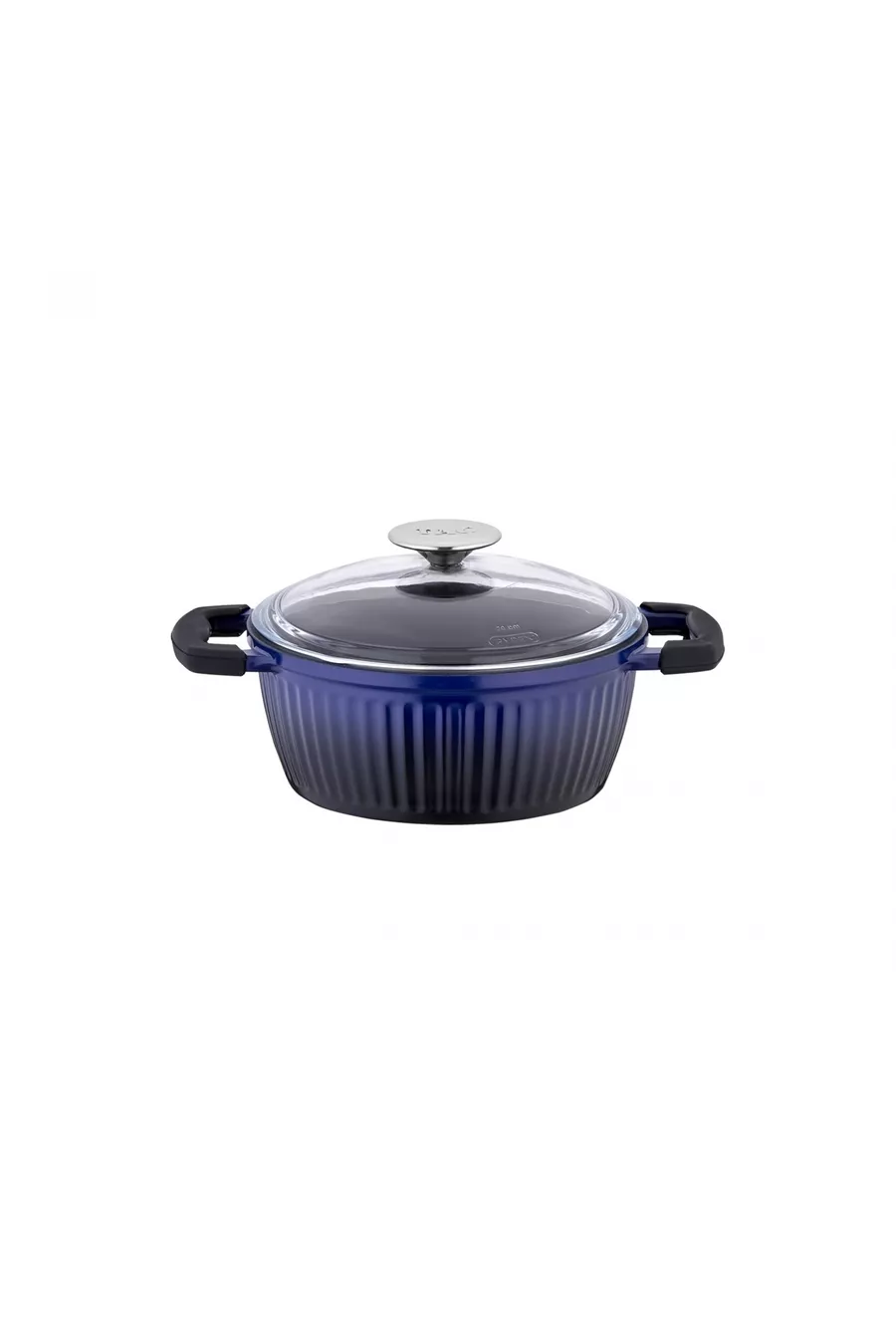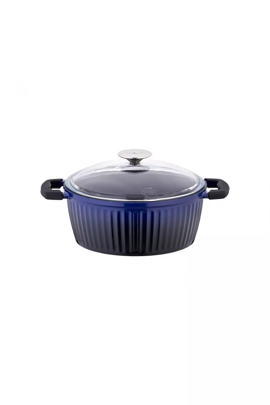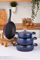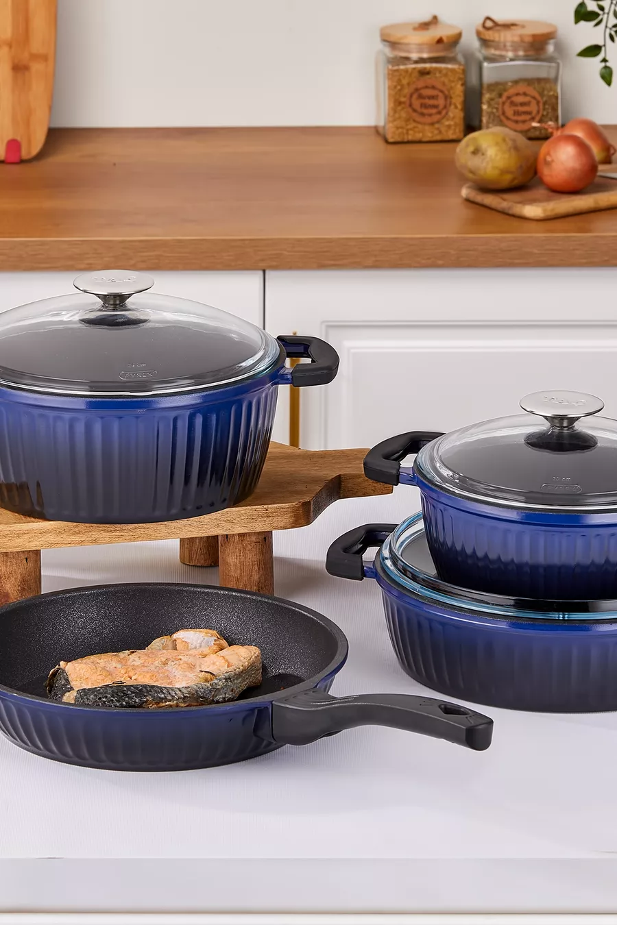 Kleur: Donkerblauw Maat/Afmeting: 24 cm Inhoud: 2 L Kenmerk: Antiaanbakbodem Buitenmateriaal: Gietijzer Binnenmateriaal: Gietijzer Aantal stukken: 7 Herkomst: TR Materiaal: Gietijzer