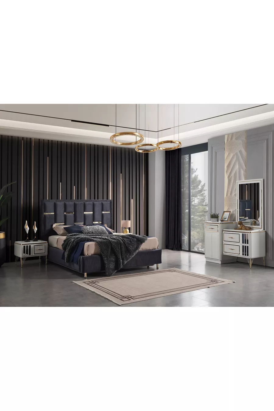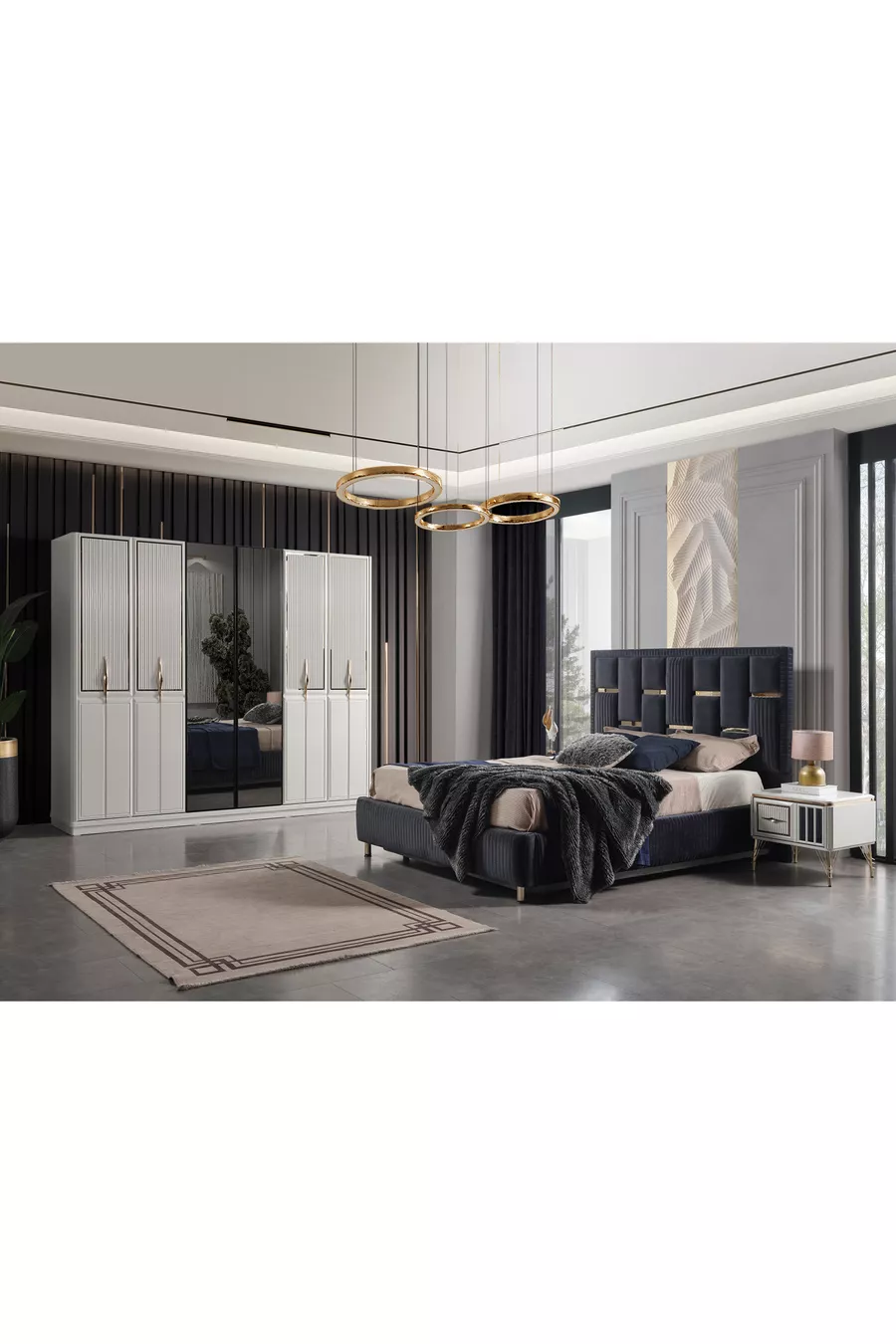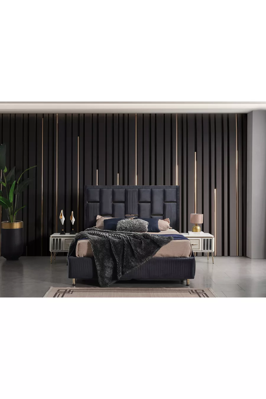 Setinhoud: Bed met opbergruimte + 2 nachtkastjes + ladekast + kledingkast