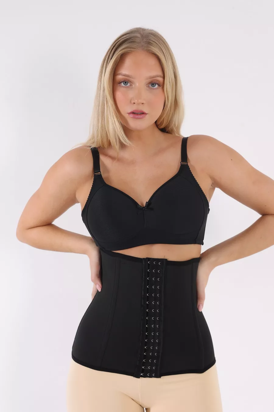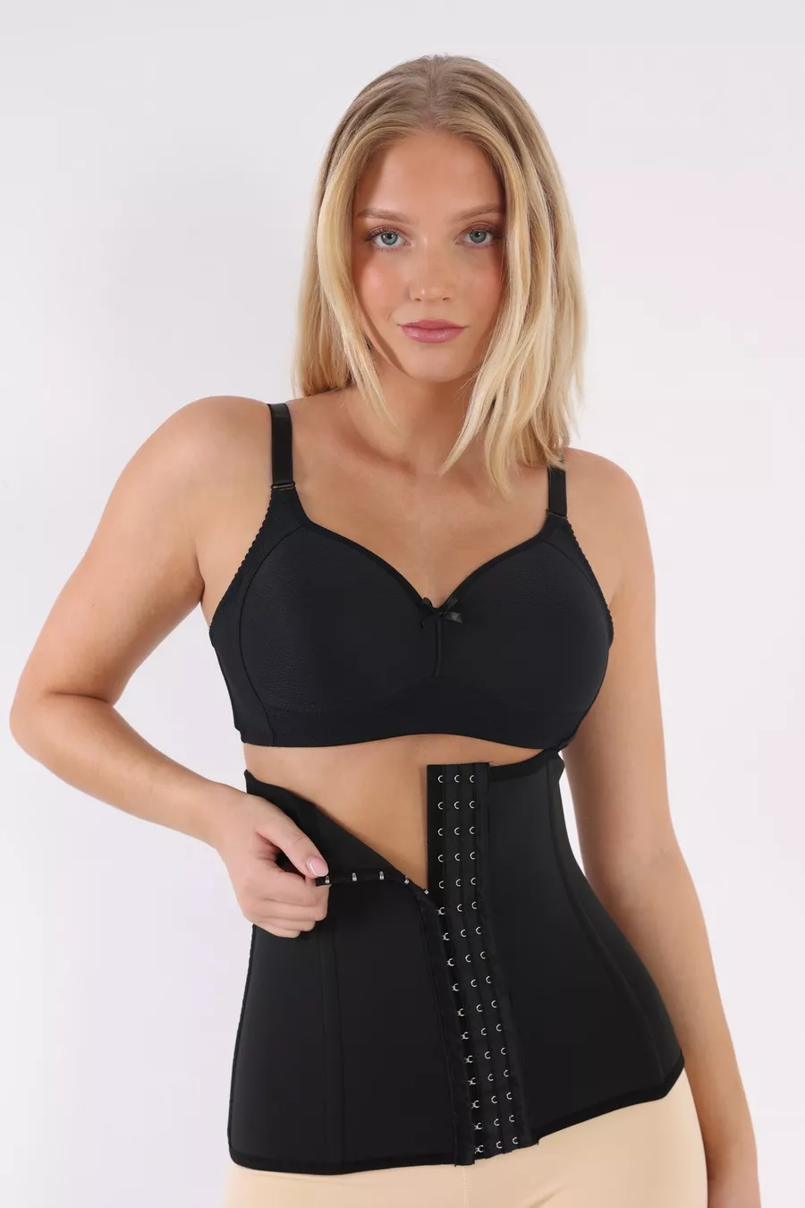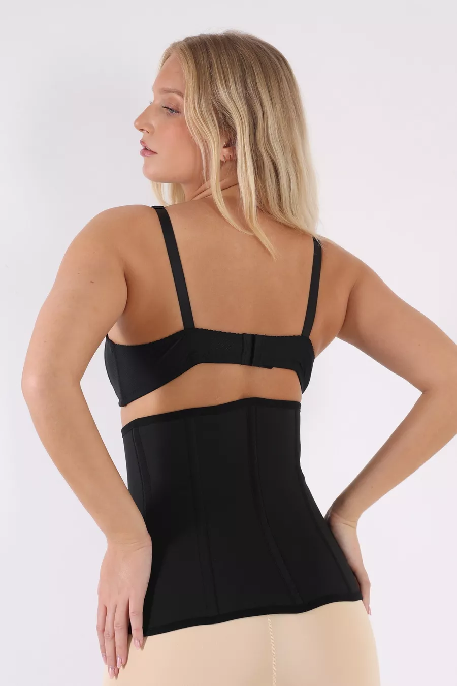 Zwarte latexkorset zonder bandjes met 4-traps versteviging
