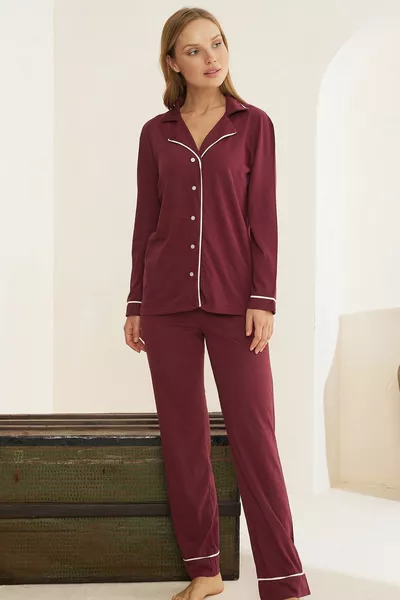 Ensemble pyjama boutonné en coton bordeaux foncé