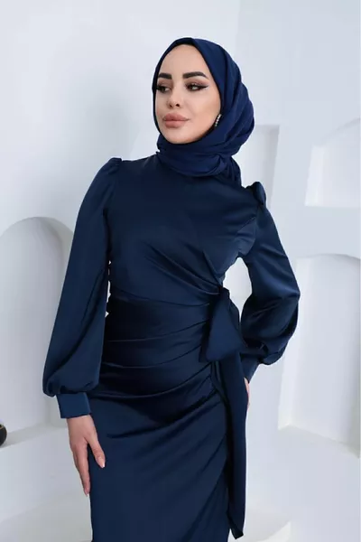 Robe de soirée hijab bleu marine ceinturée argentée