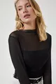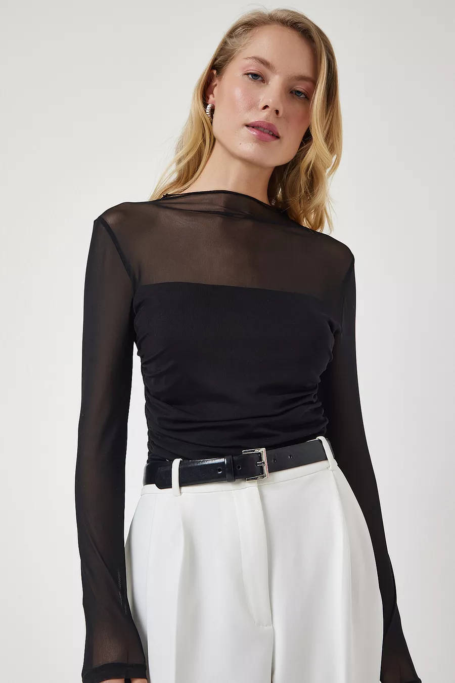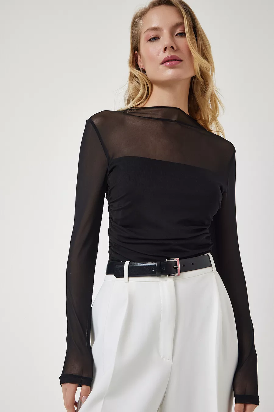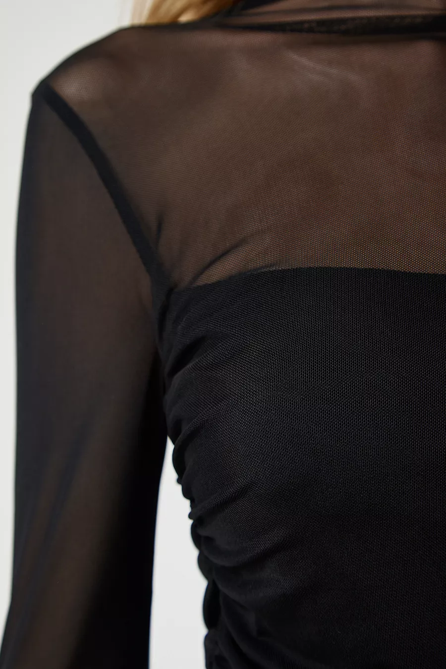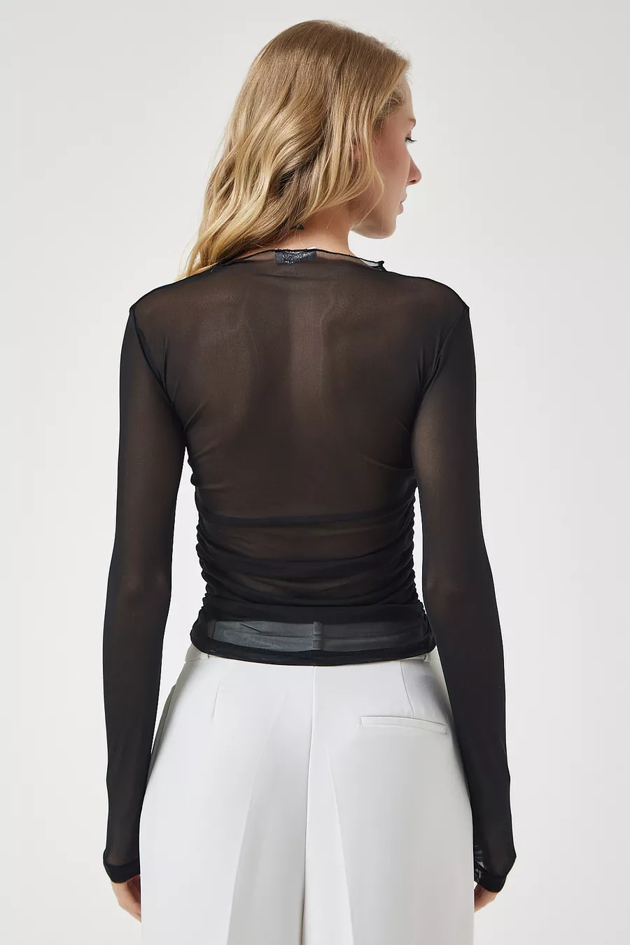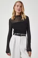 Blouse en chiffon transparente noire pour femme avec détails froncés