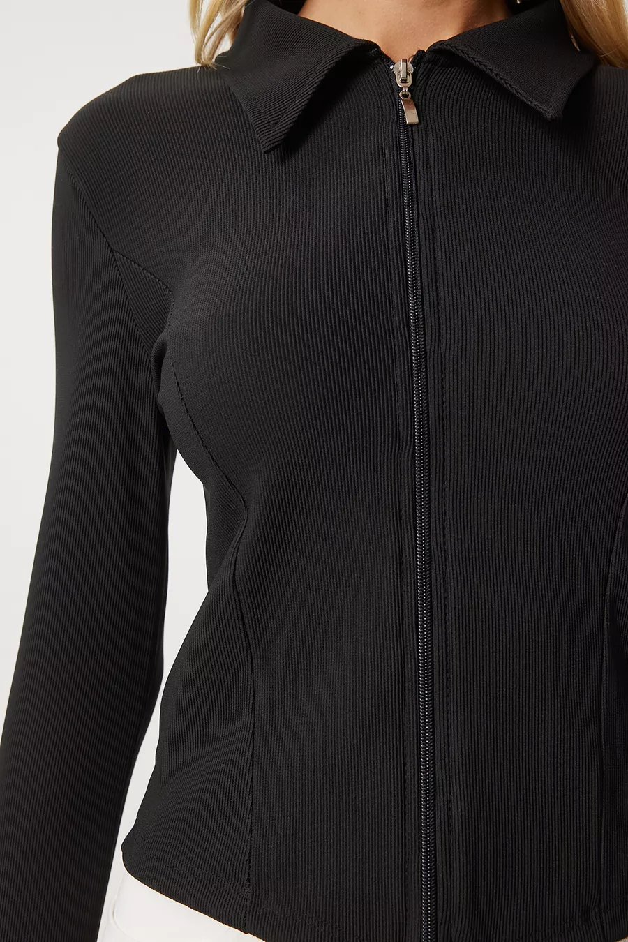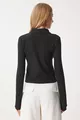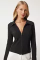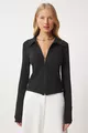 Blouse en maille ajustée pour femme à col polo noir avec fermeture éclair