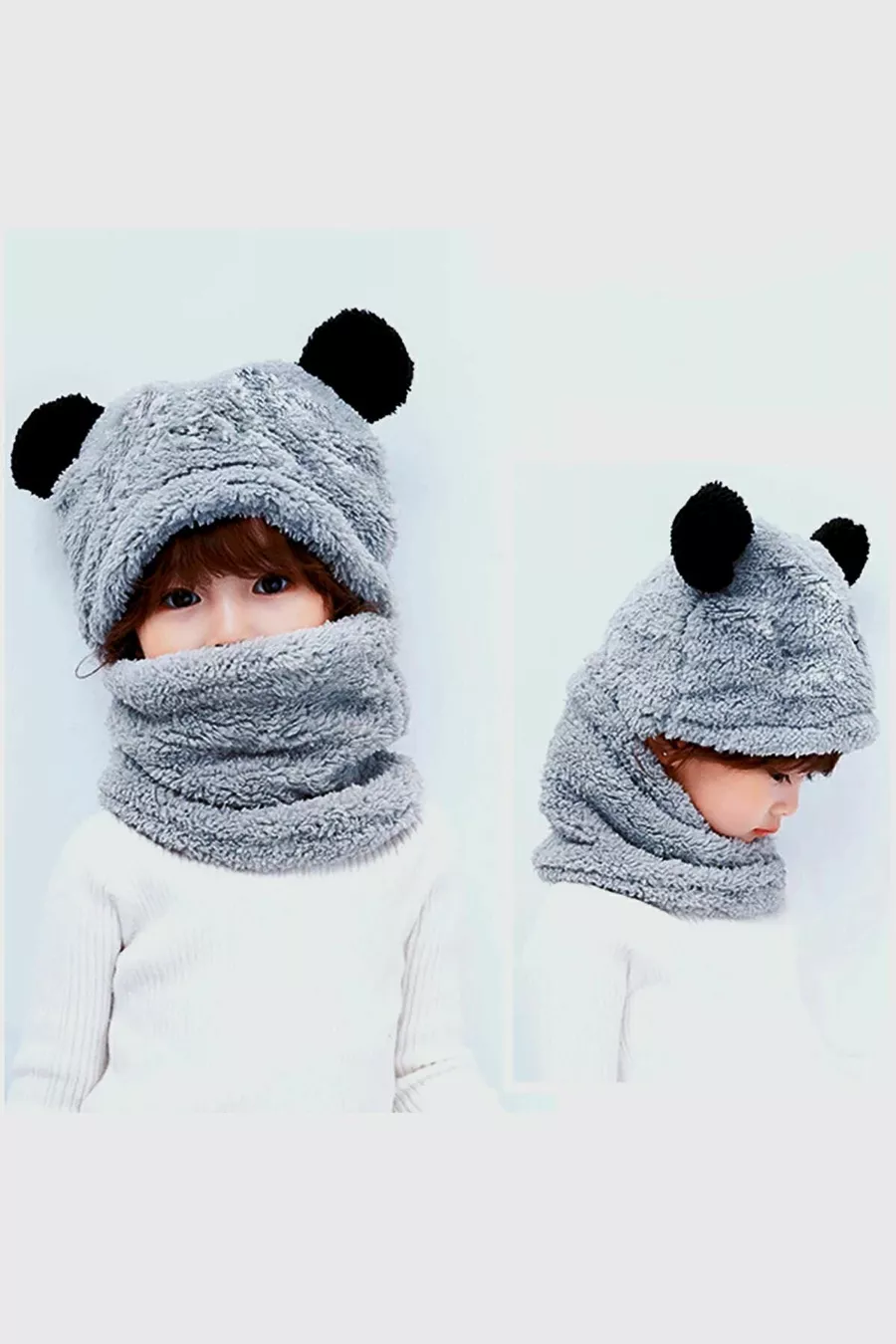Bonnet à capuche en peluche grise pour enfant Panda avec écharpe