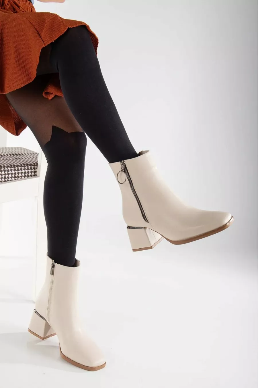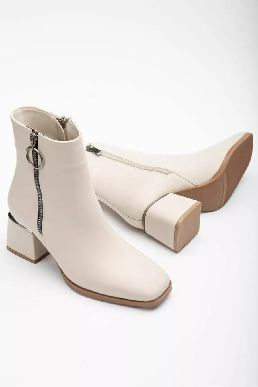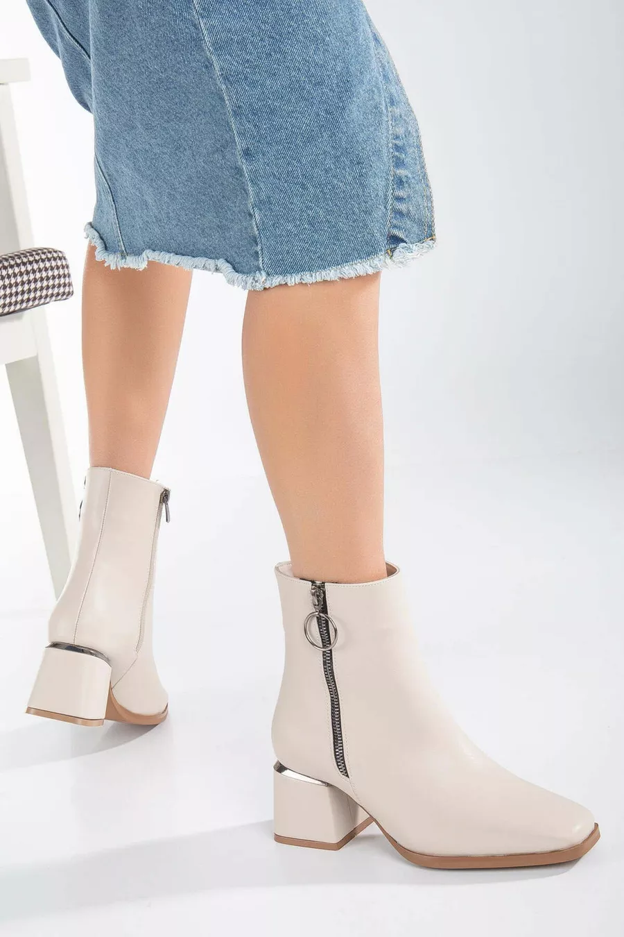 Bottes Femme Beige Fermeture éclair Bout carré Talon épais Fer Détaillé