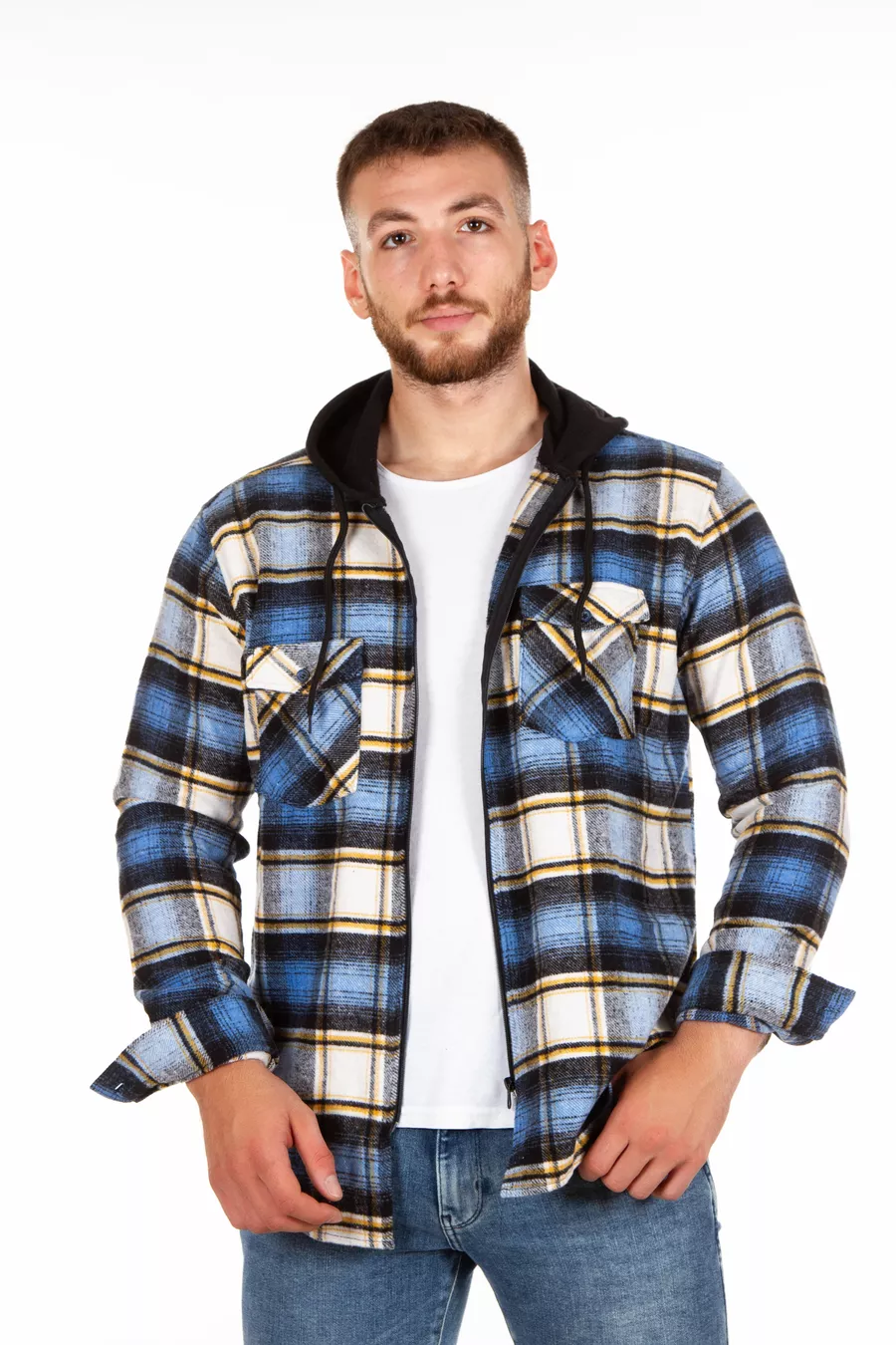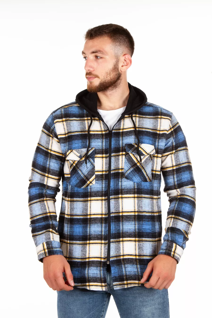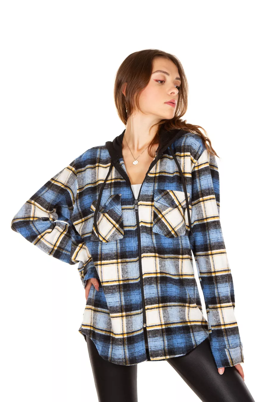 Chemise à carreaux unisexe à capuche et à fermeture éclair