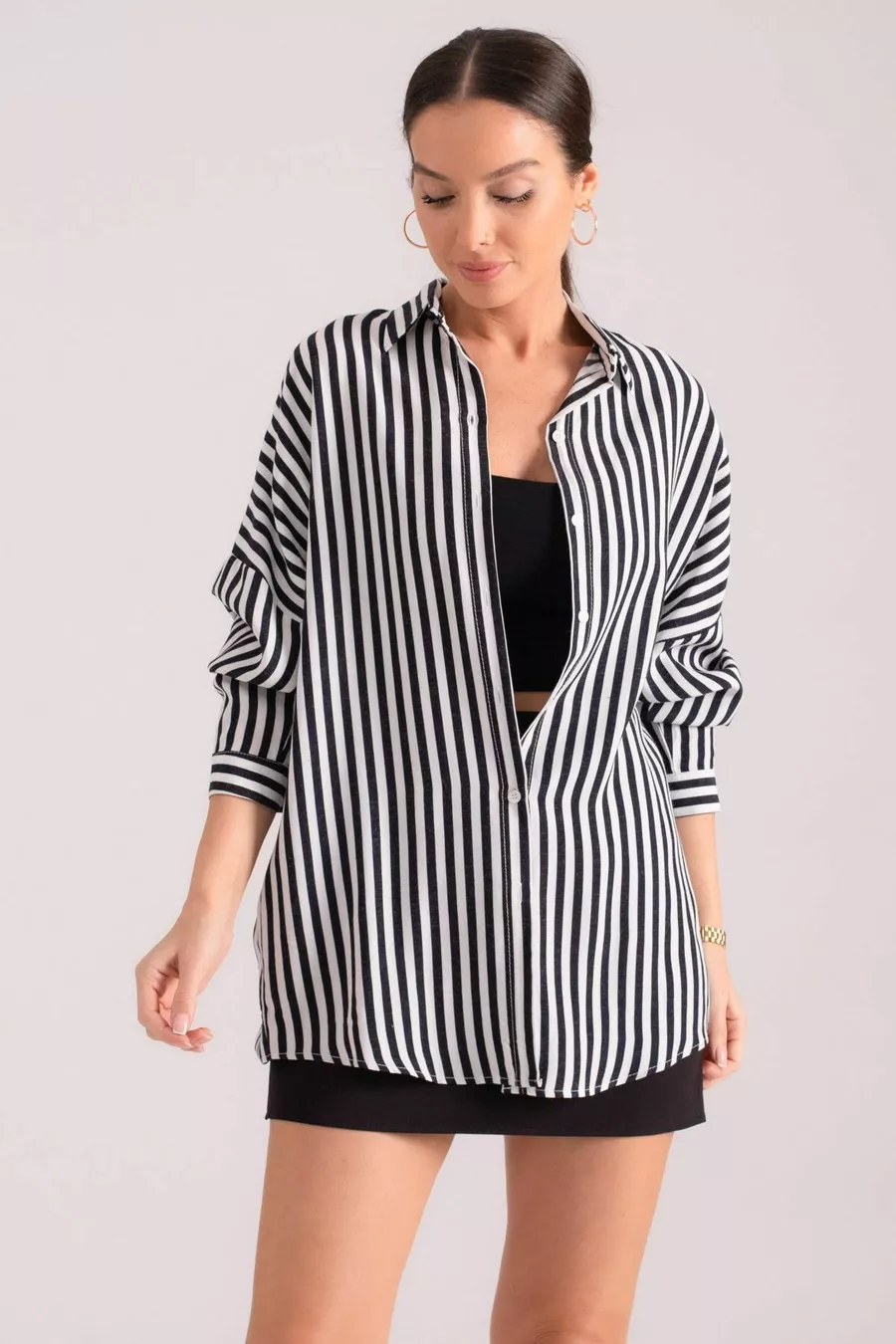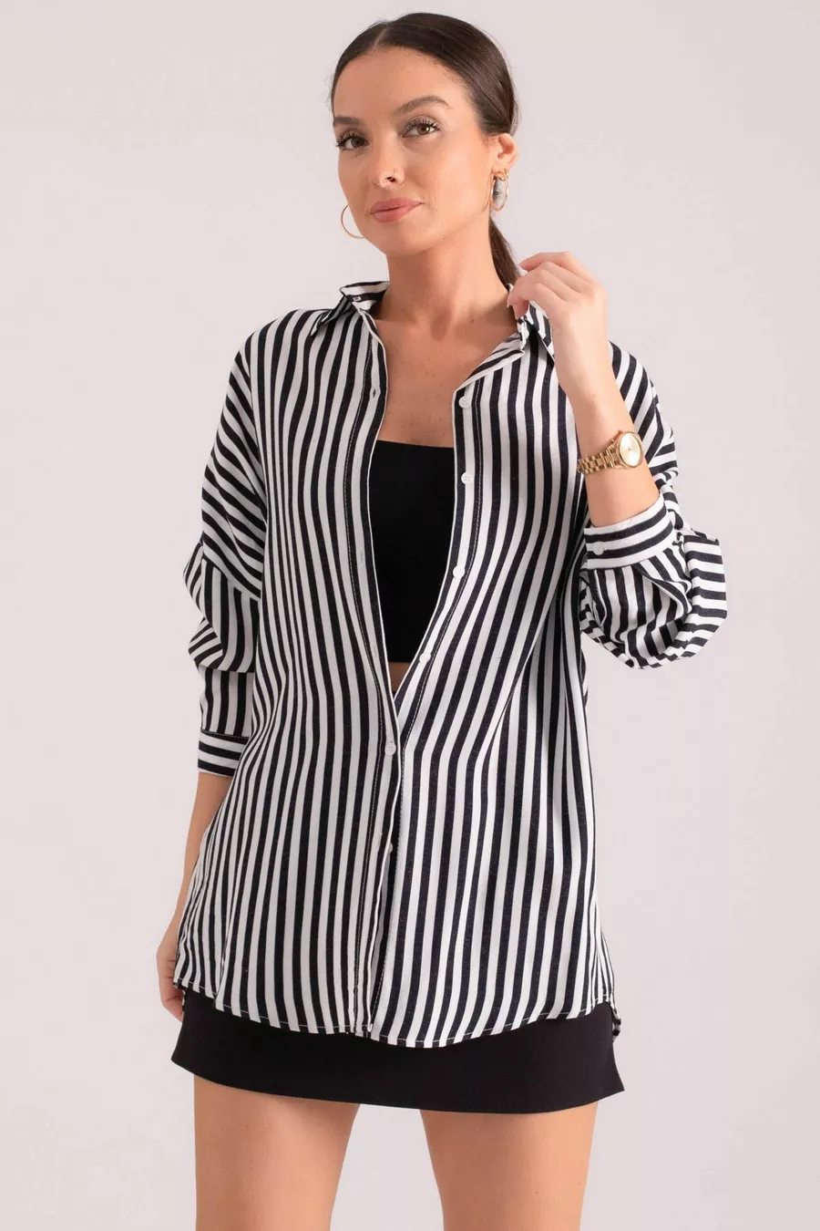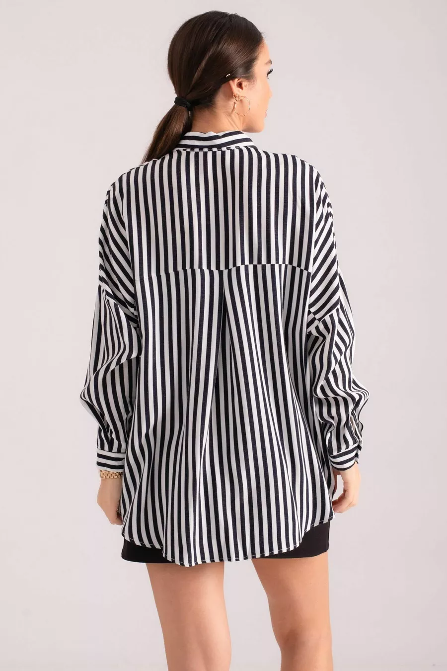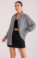 Chemise basique longue oversize pour femme à fines rayures noir et blanc