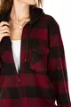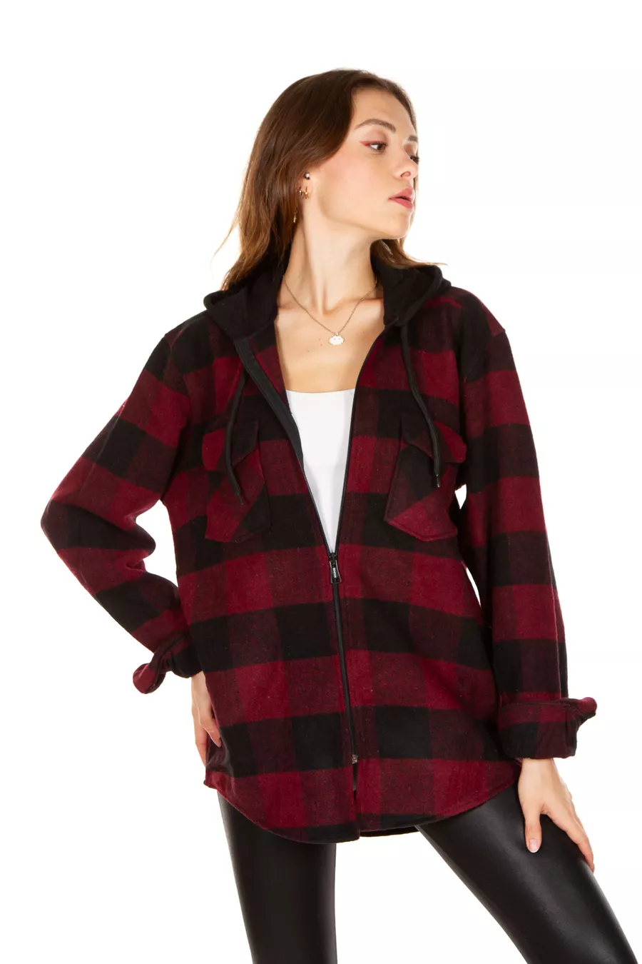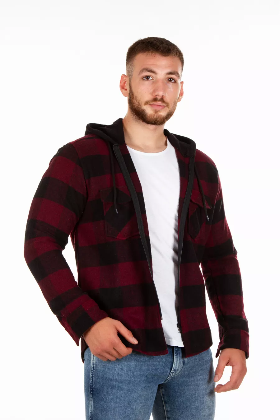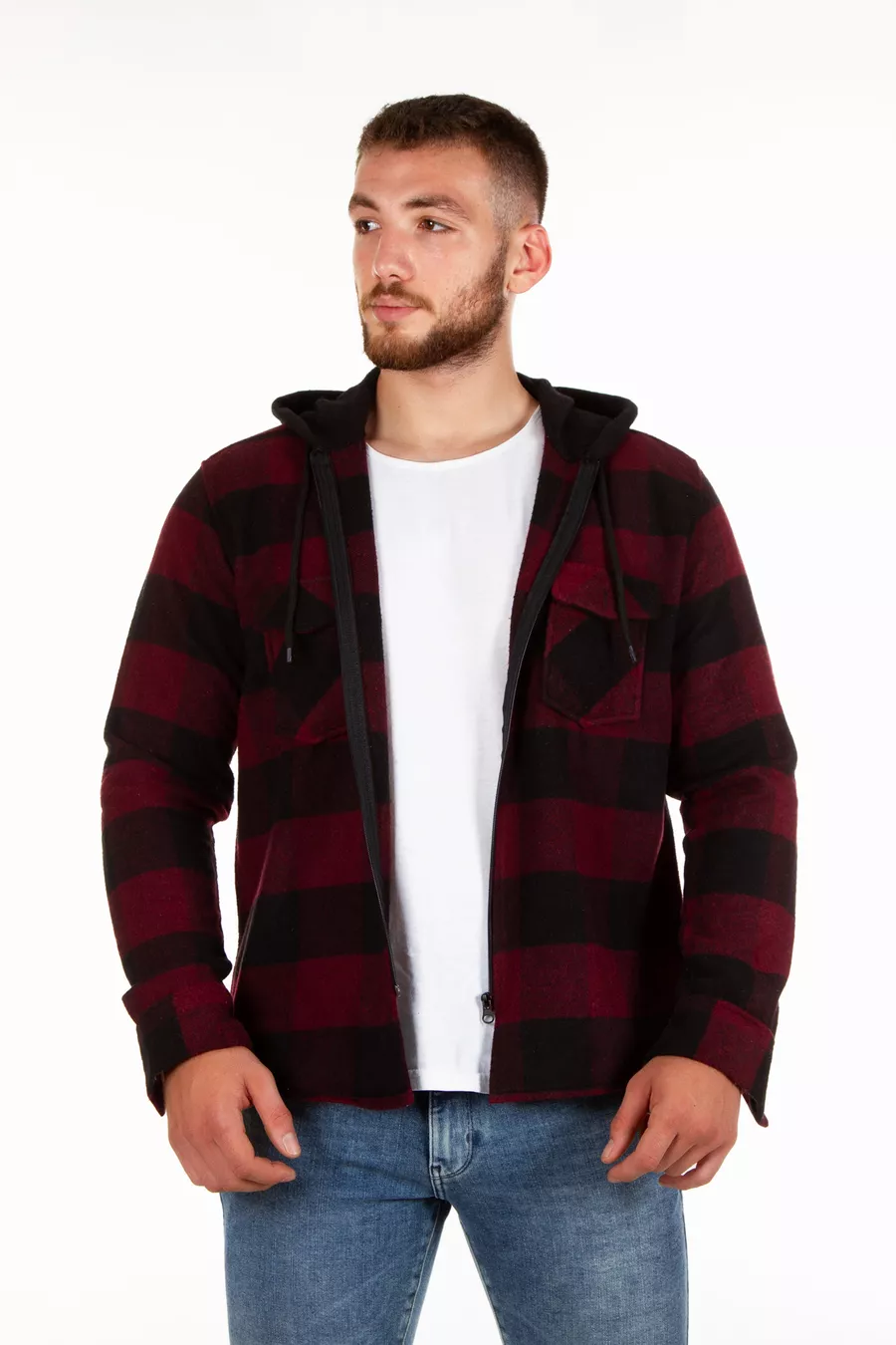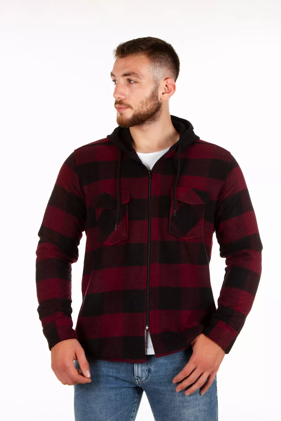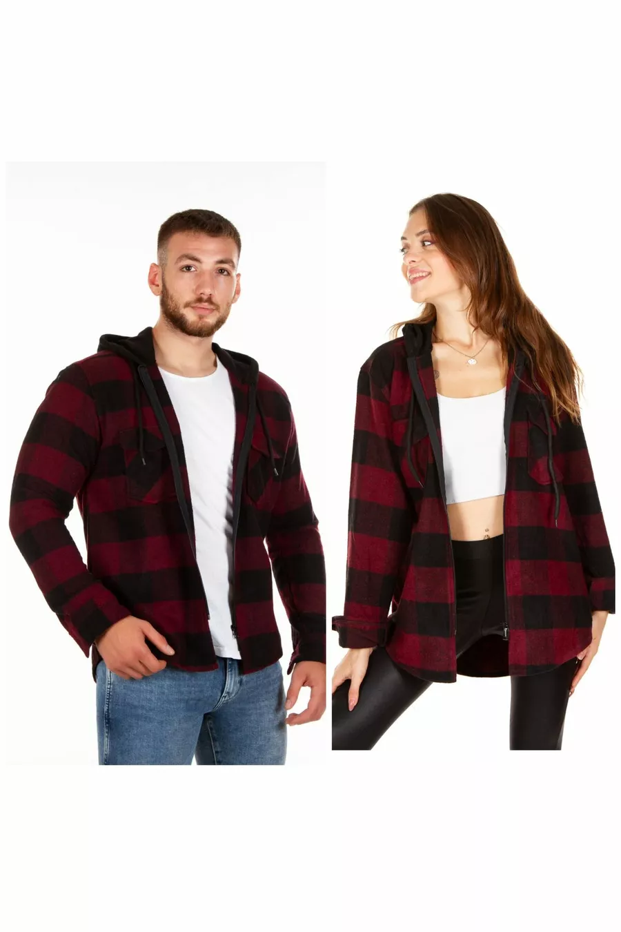 Chemise de bûcheron unisexe bordeaux et noire à capuche et fermeture éclair