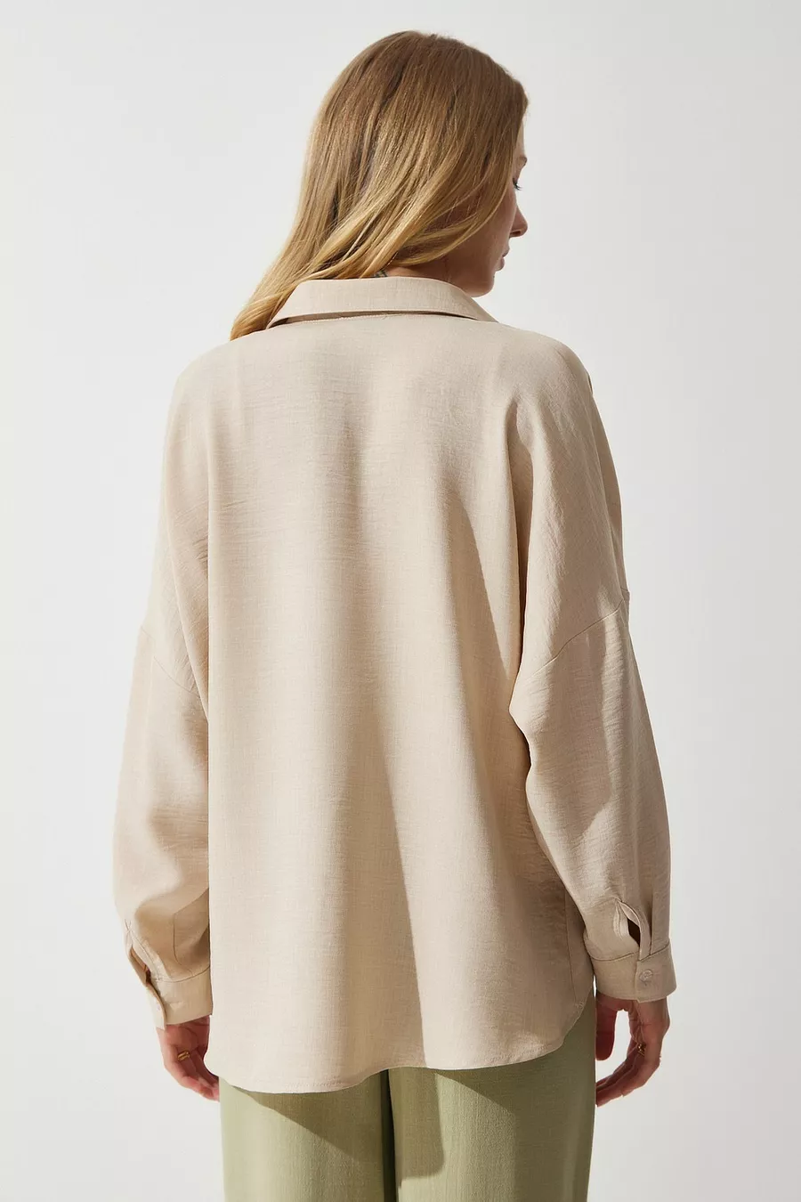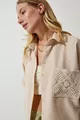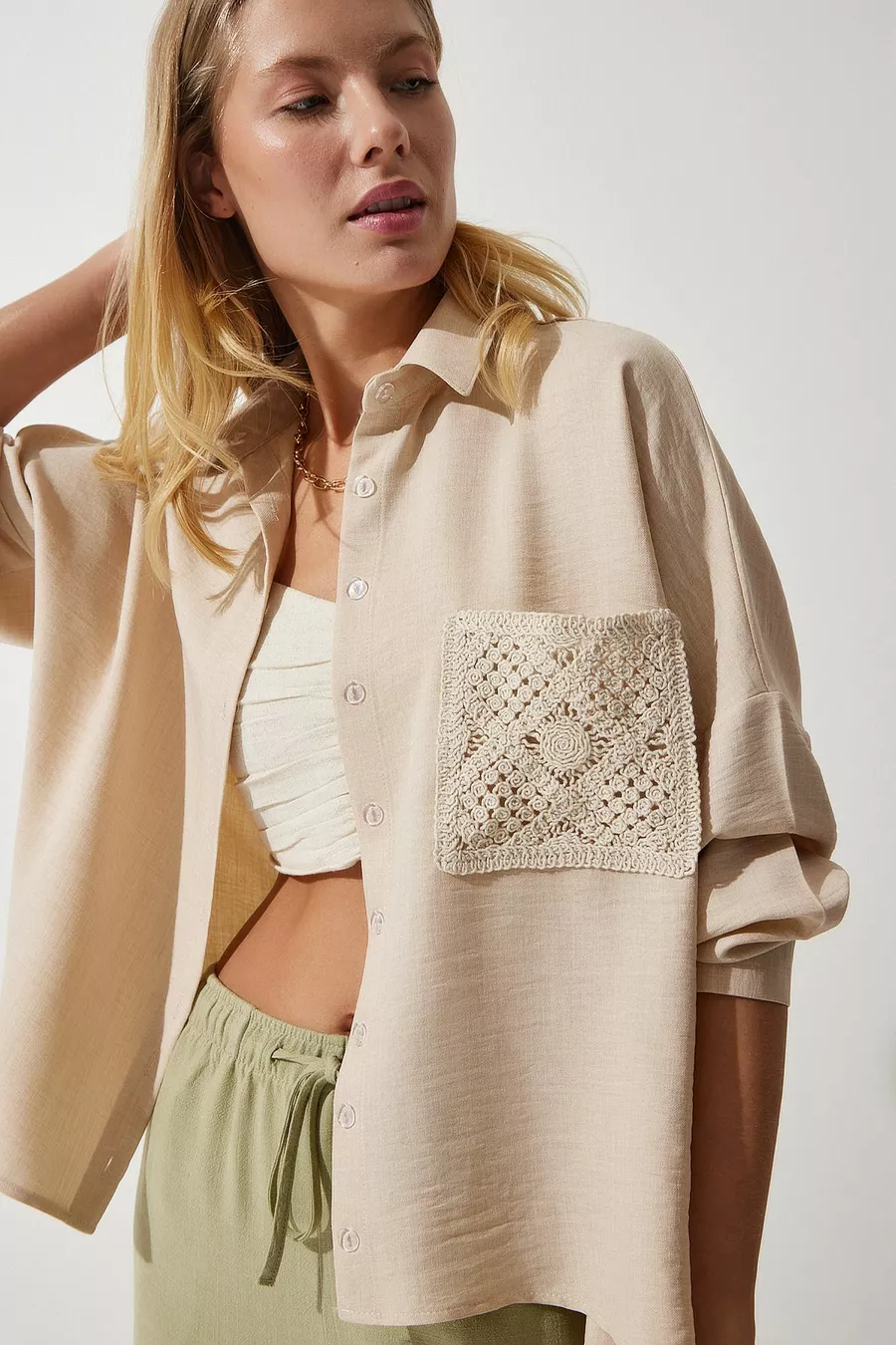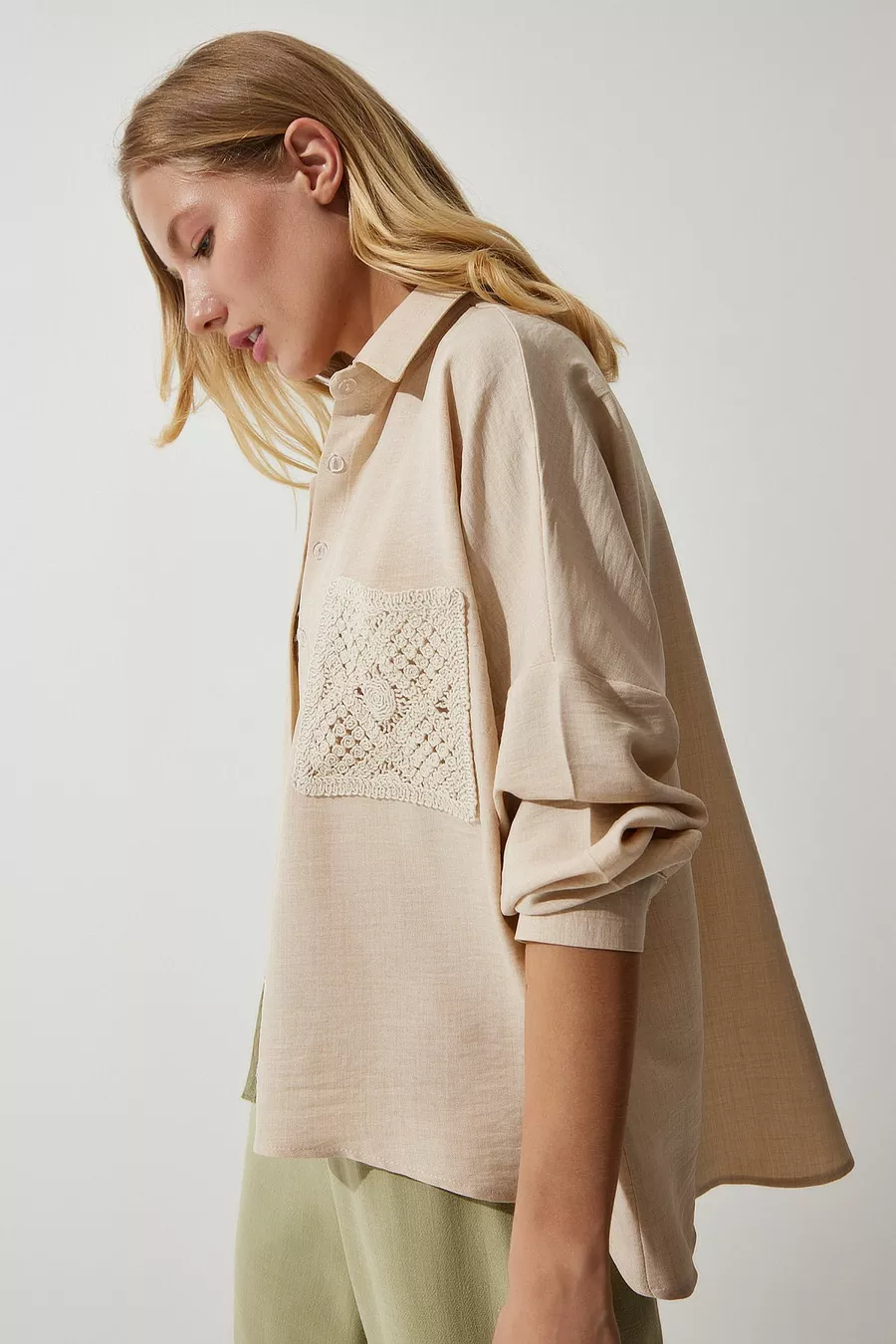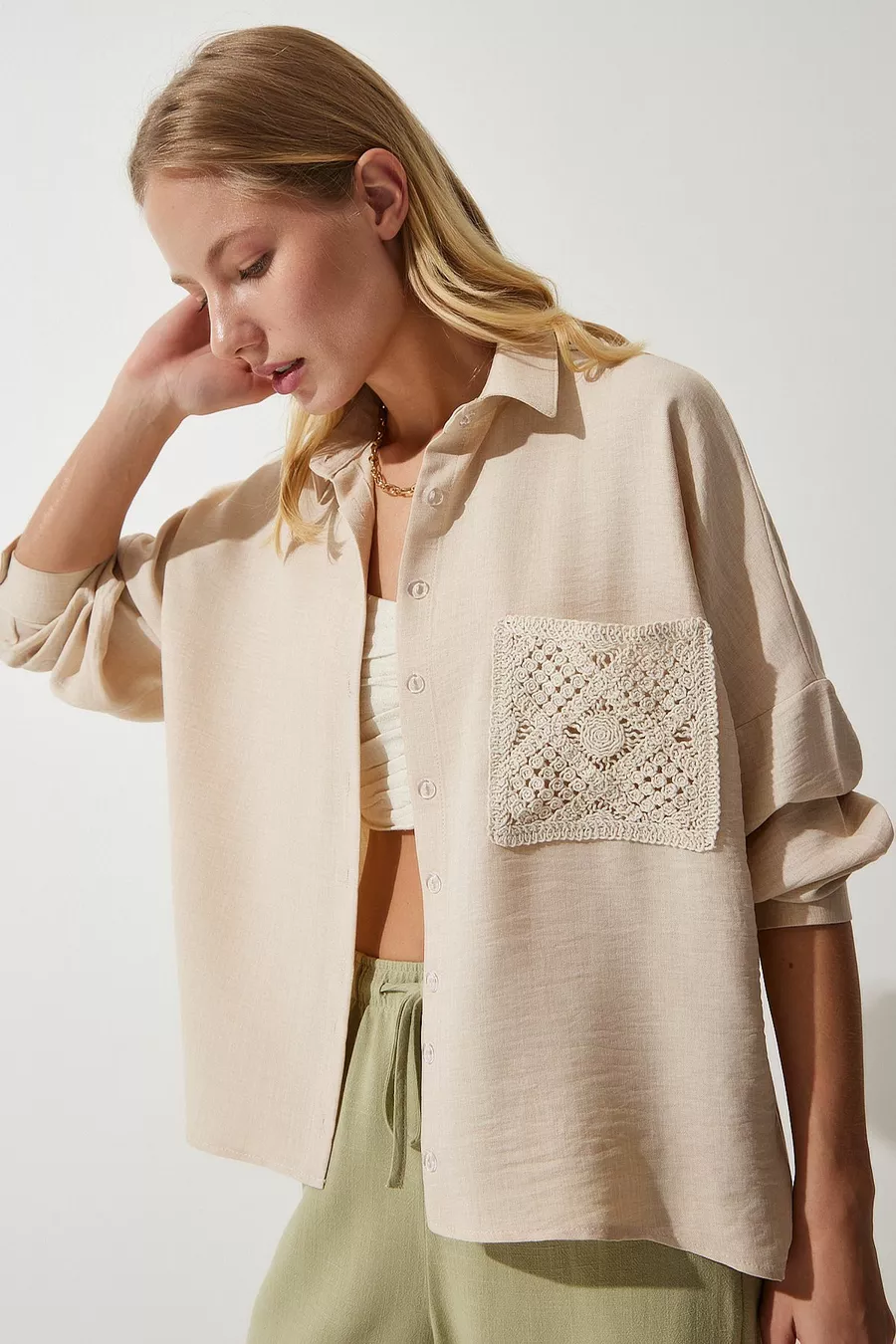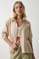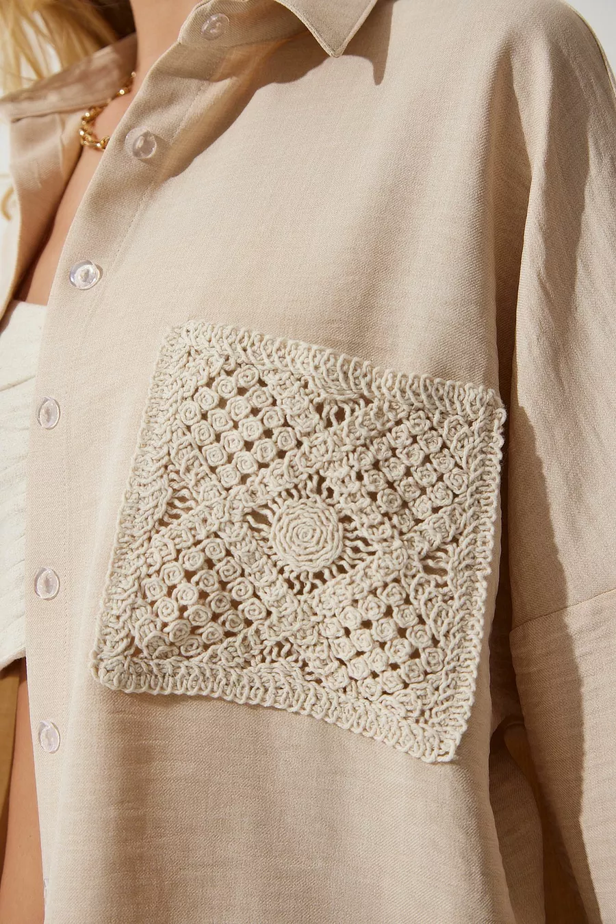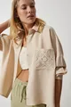 Chemise en lin détaillée en dentelle beige foncé pour femme