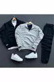 Ensemble 3 pièces Sweat-shirt noir en coton à demi-fermeture éclair + Pantalon de survêtement noir en coton - Haut et bas