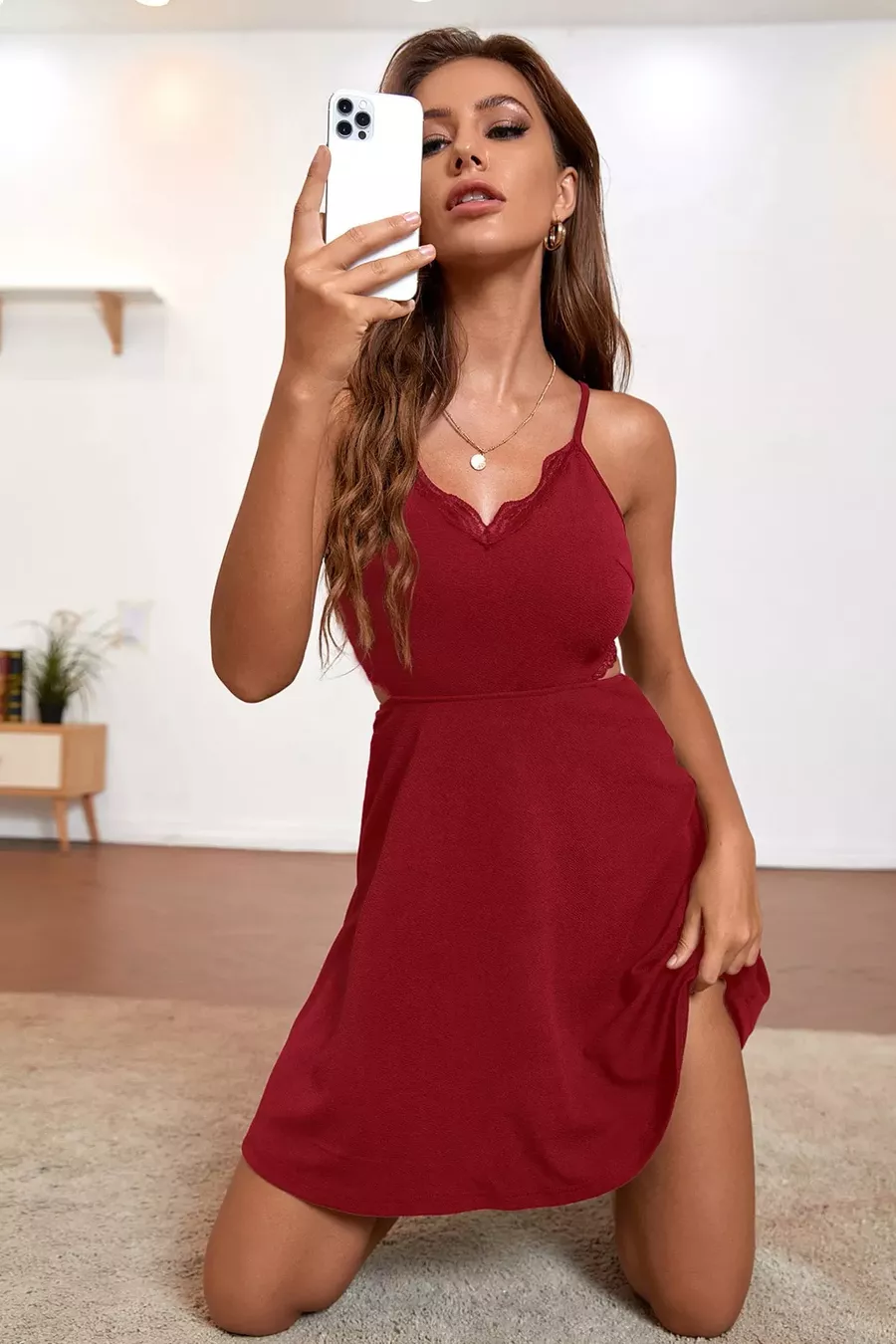 Ensemble de nuit élégant pour femme, bordeaux, dos décolleté, détails en dentelle