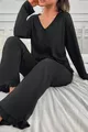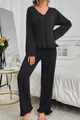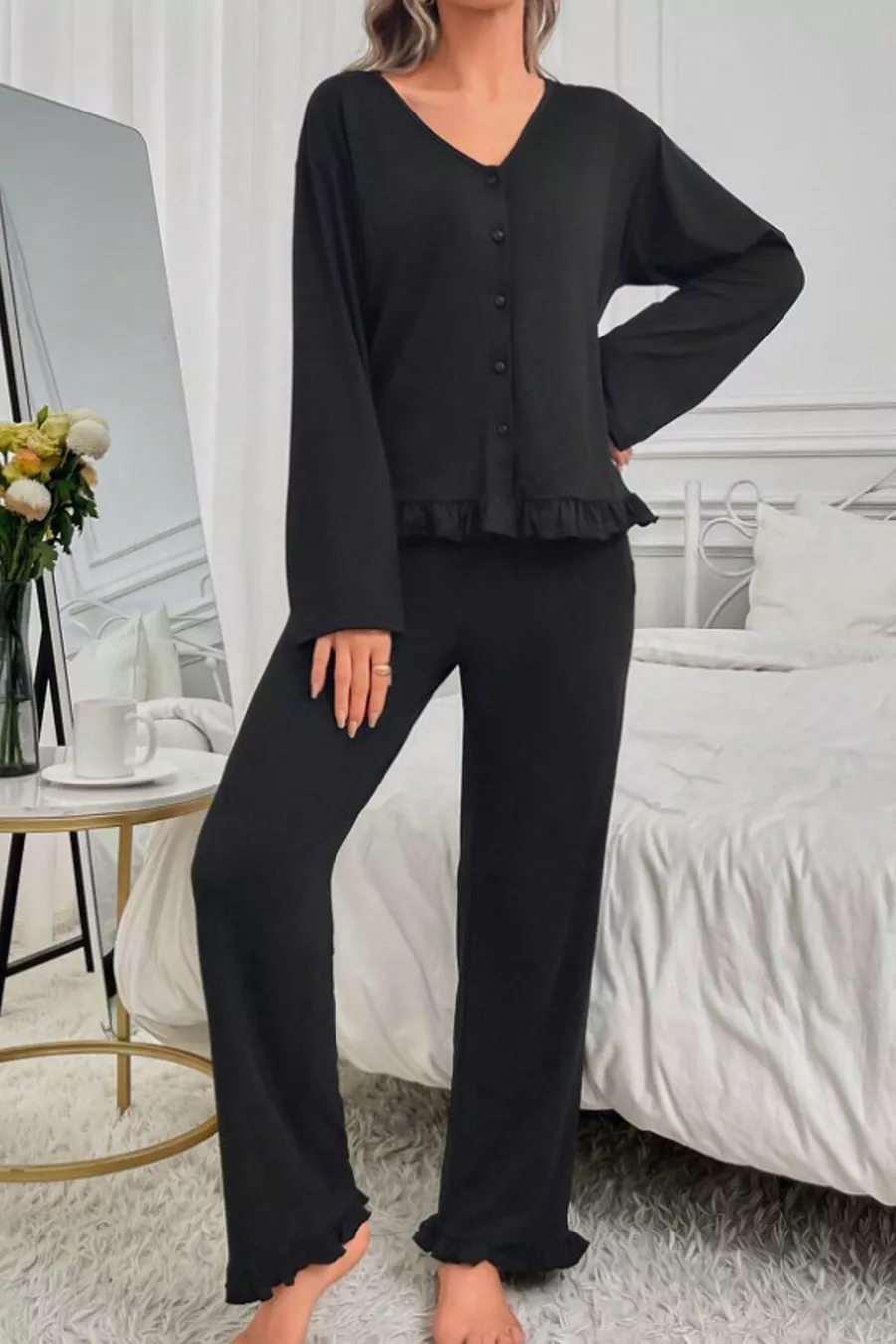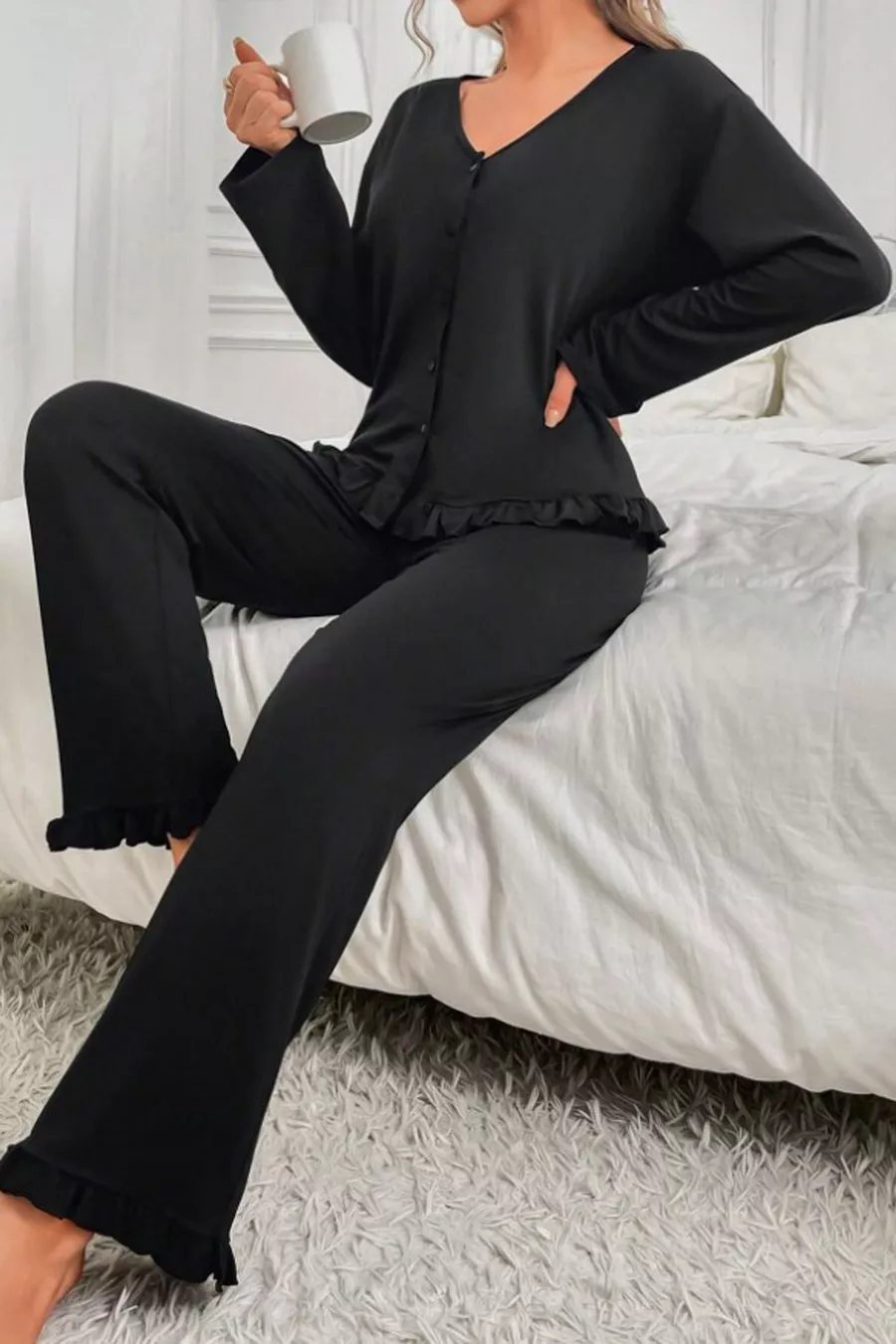 Ensemble de pyjama à boutons Ruffle à manches longues en viscose ultra douce noir