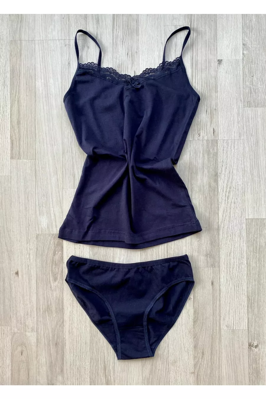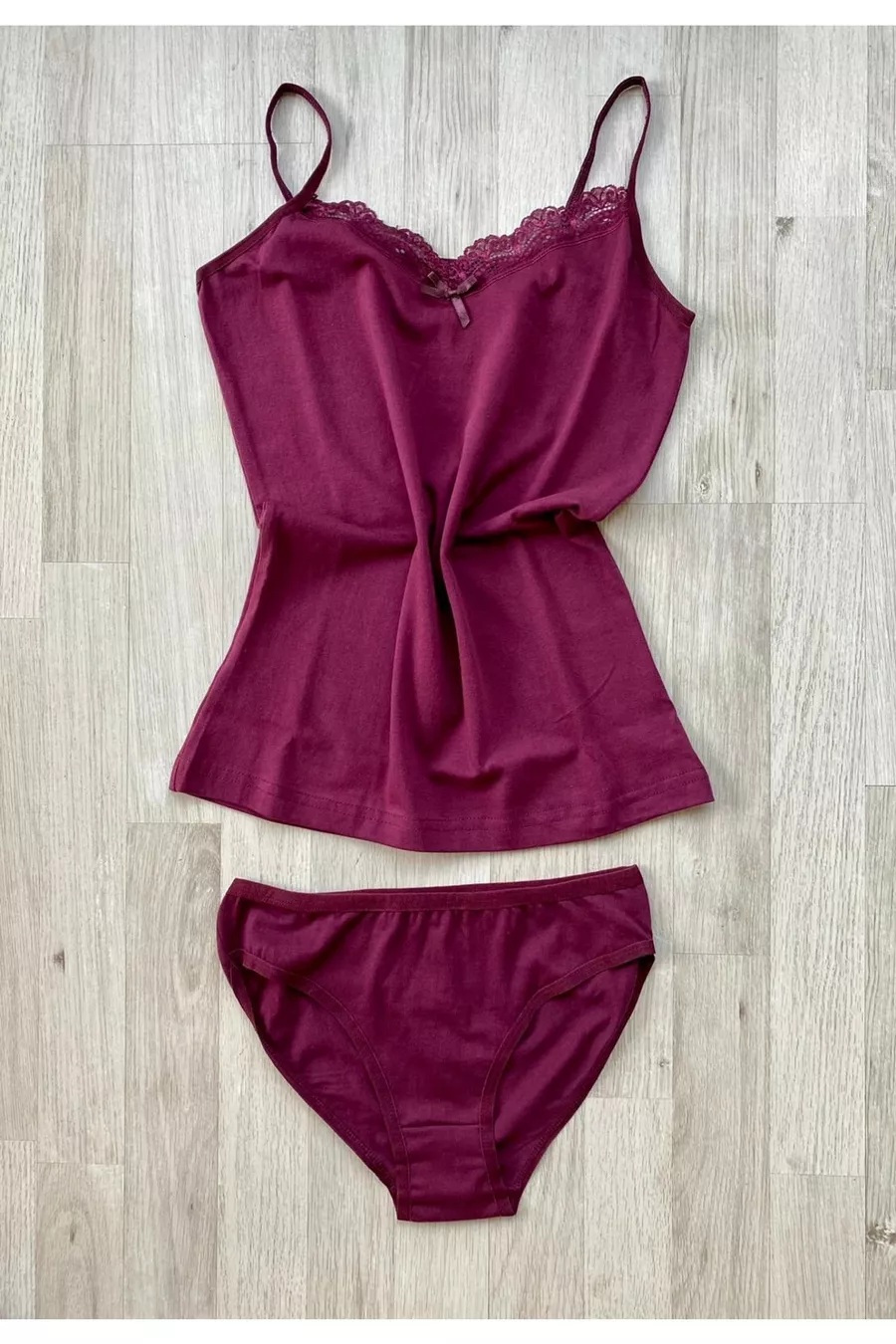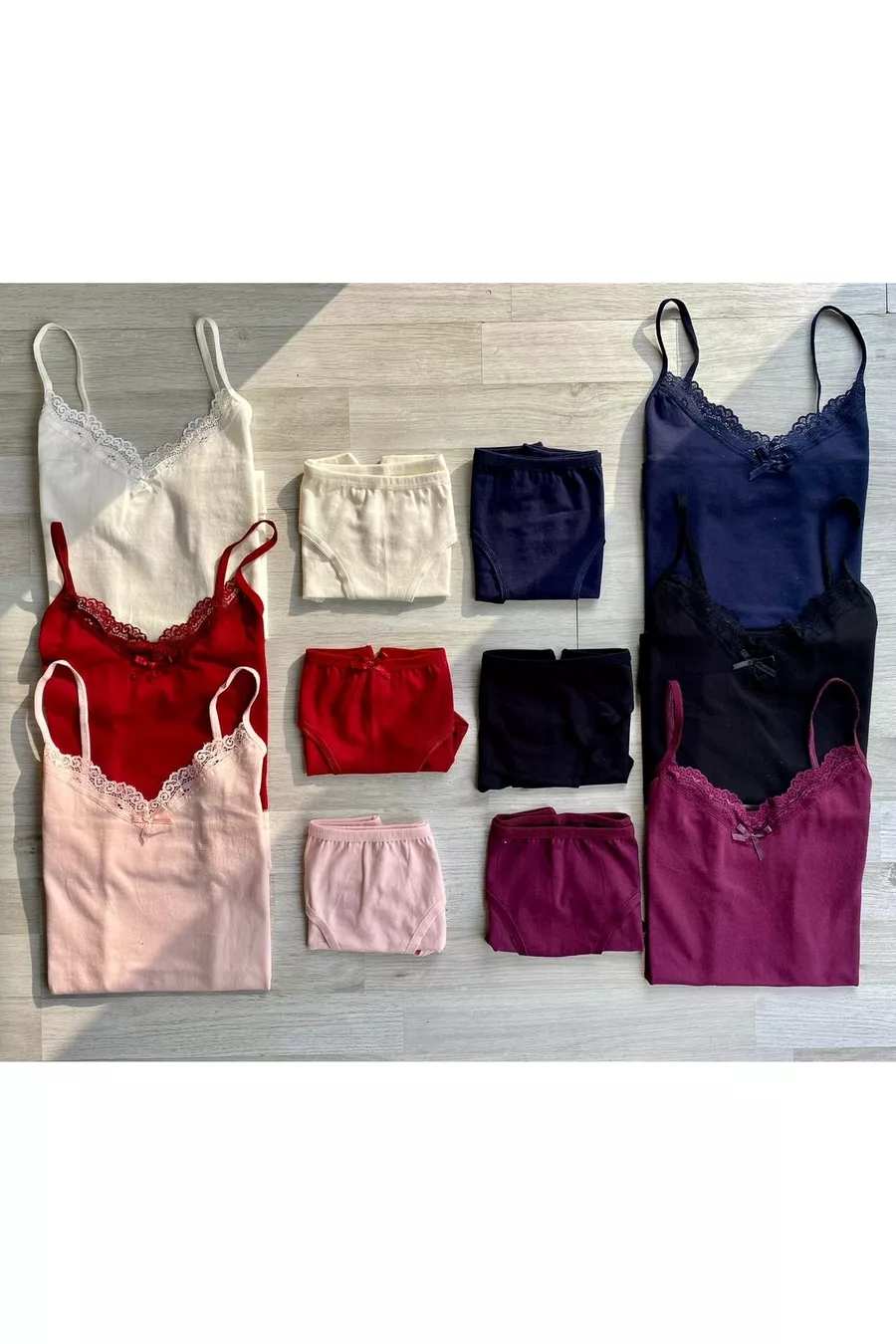 Ensemble de 6 pièces débardeur et culotte en coton avec dentelle à bretelles fines (ÉCRU, NOIR, SAUMON, BLEU MARINE, BORDEAUX, PRUNE, BLANC, GRIS)