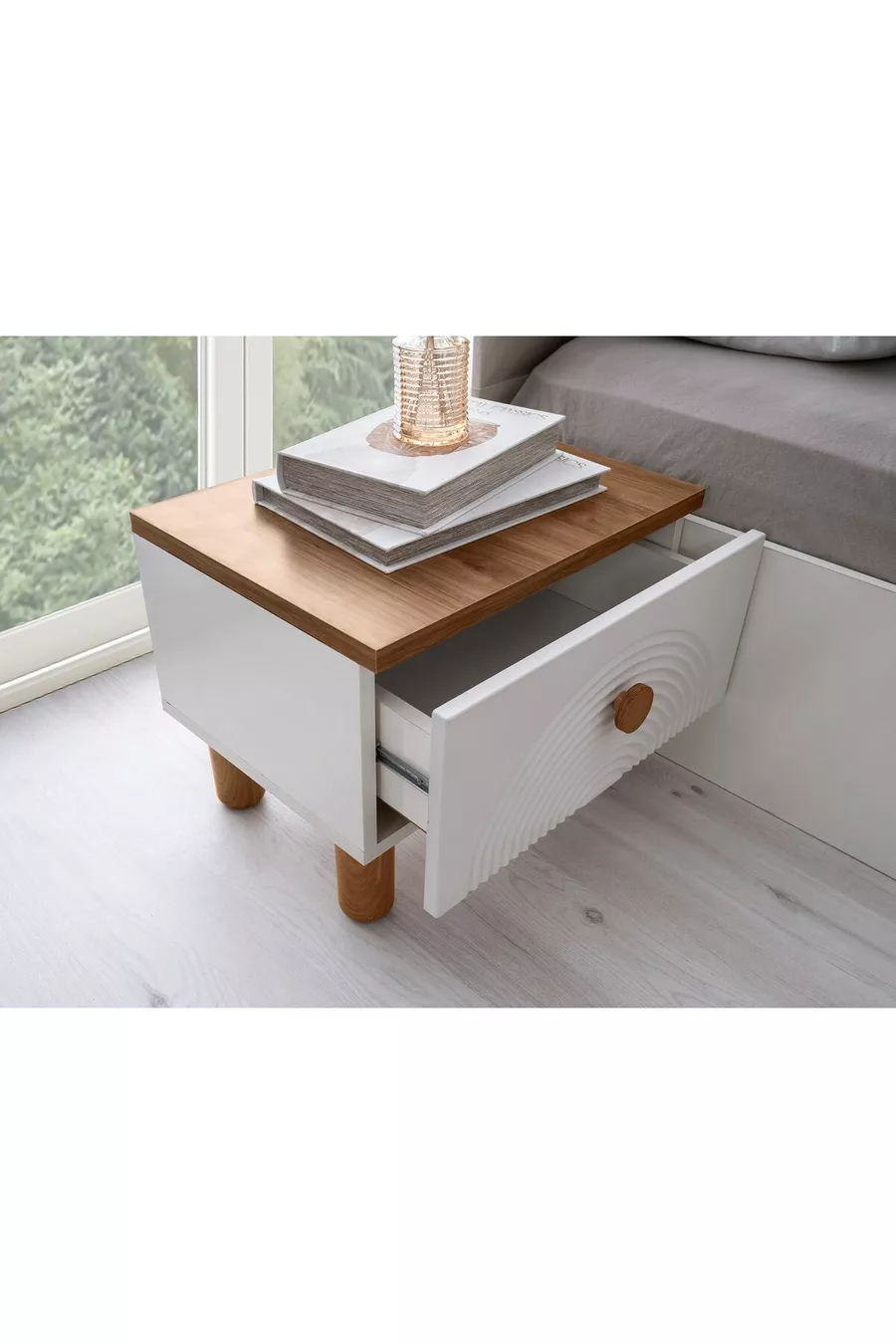 Contenu du set : Lit avec sommier + 2 tables de chevet + commode + armoire