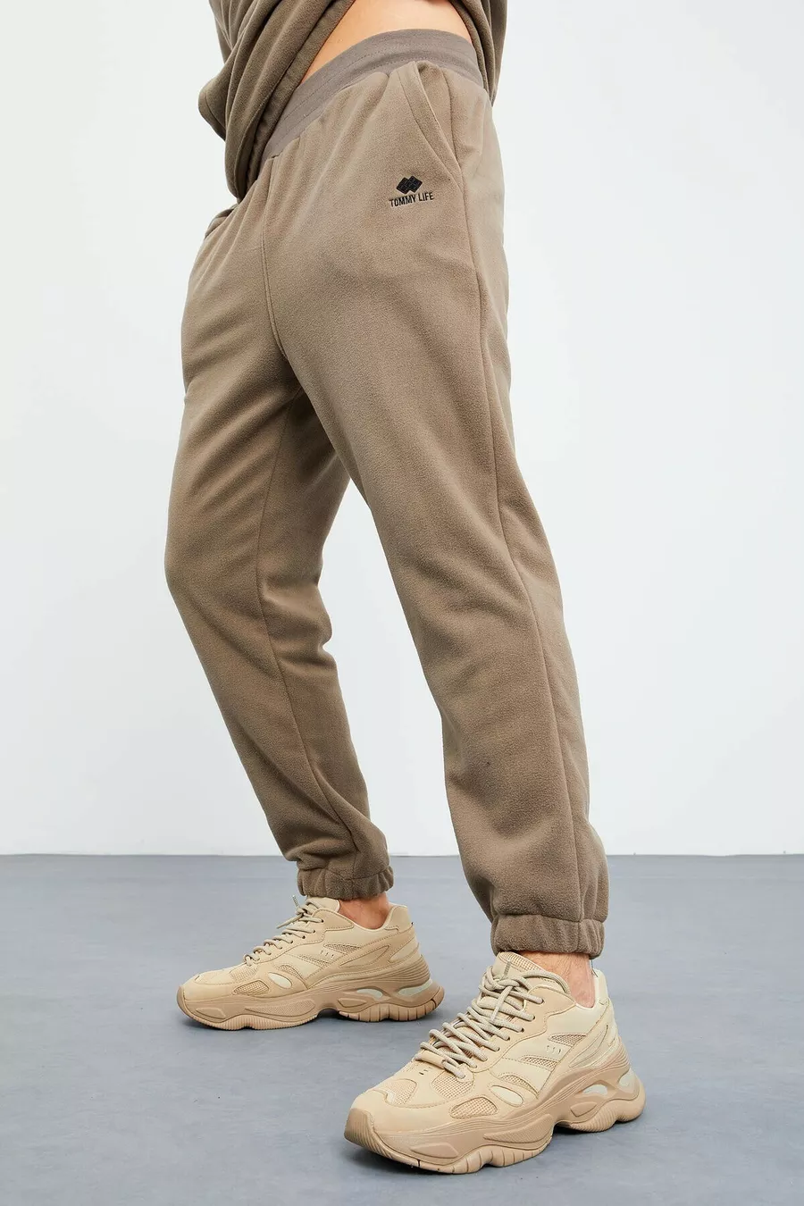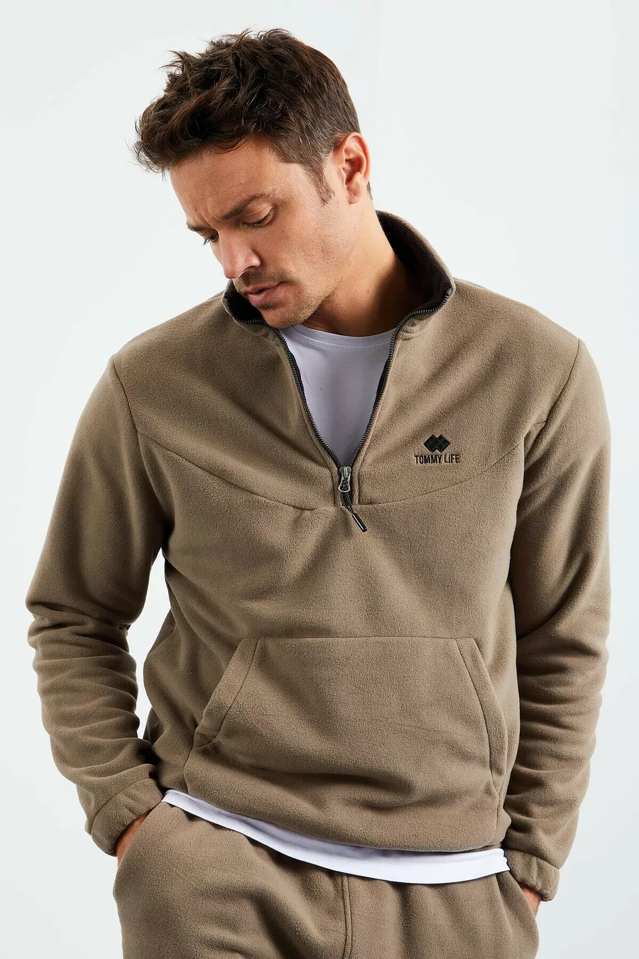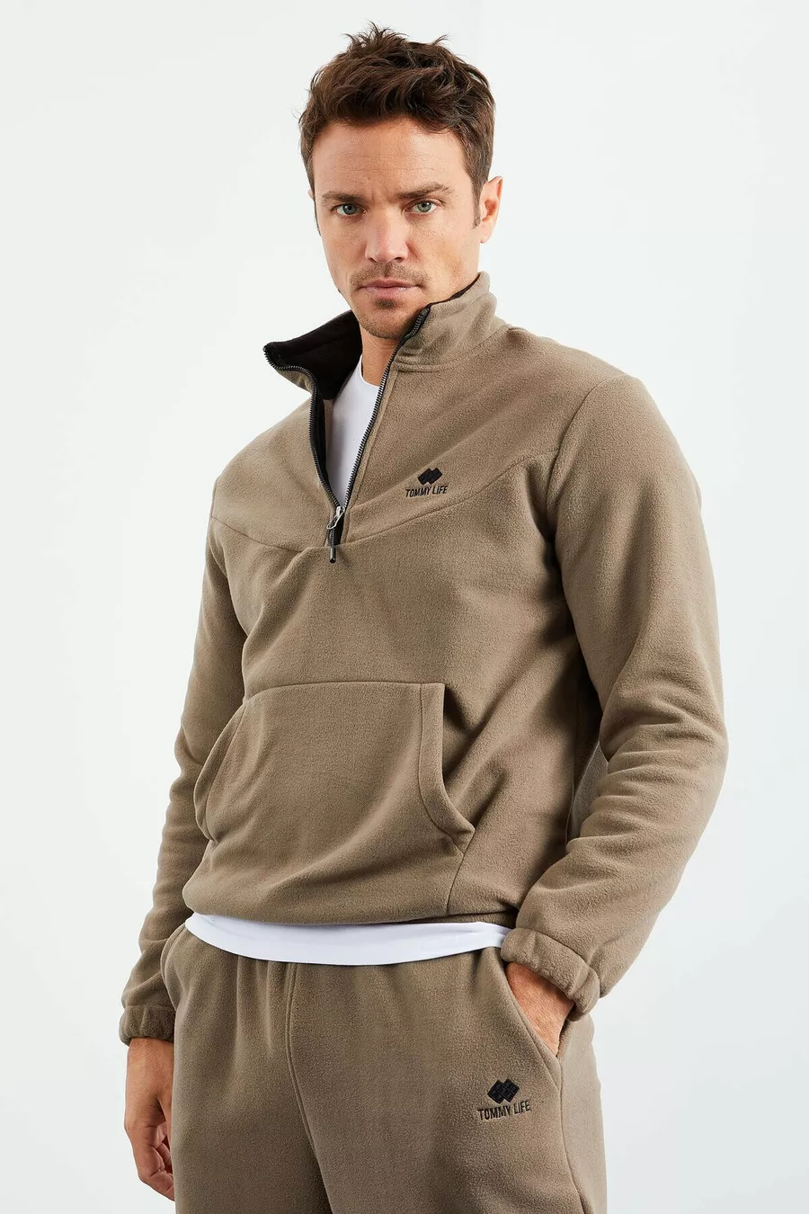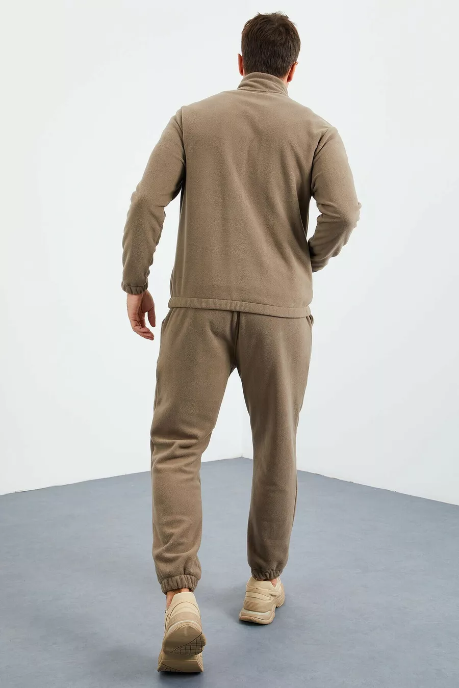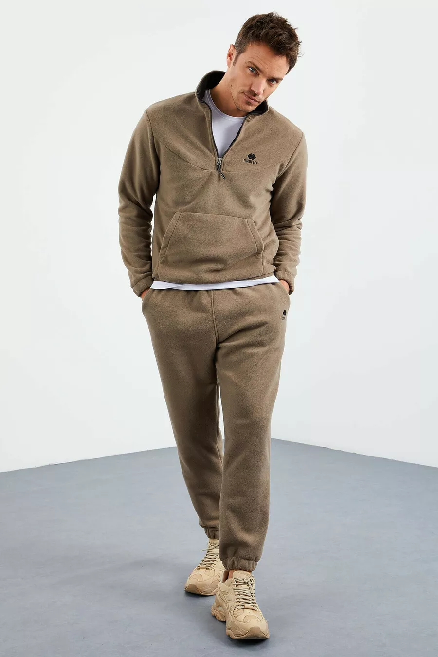 Ensemble de survêtement pour homme en polaire Camel avec col montant, demi-fermeture éclair et bas élastique -