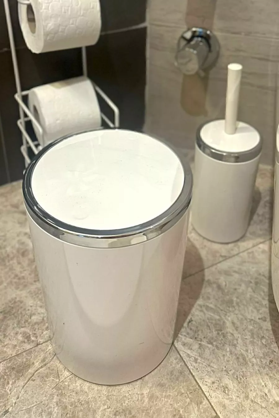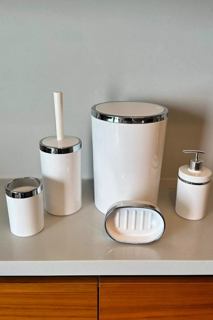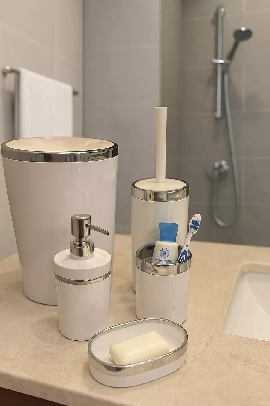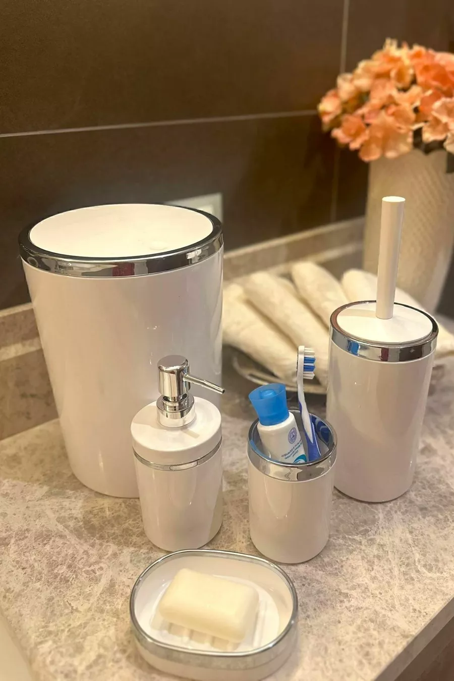 Ensemble de salle de bain 5 pièces, rond, acrylique - Poubelle, porte-brosse WC, distributeur de savon liquide, porte-brosse à dents, distributeur de savon pour les mains