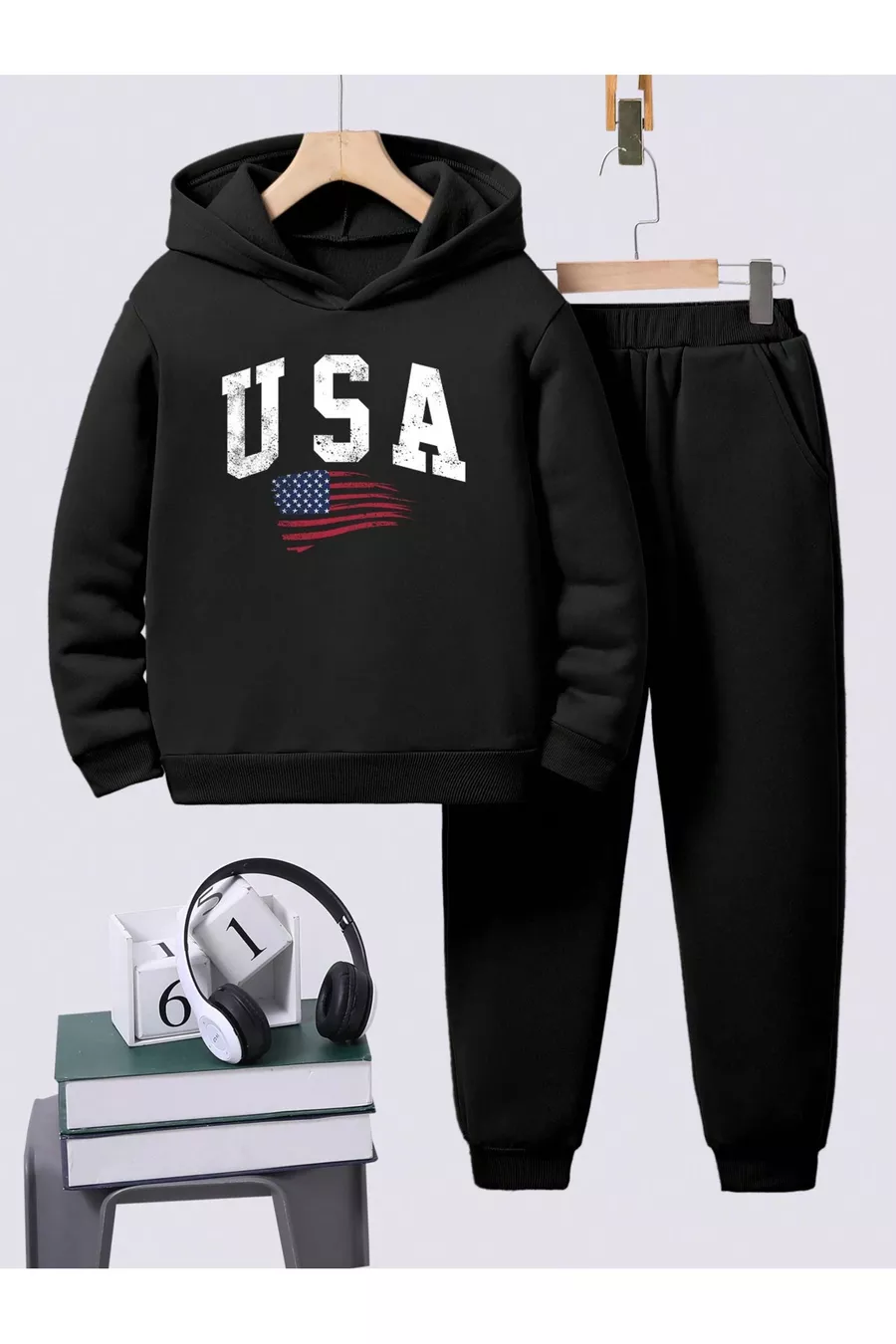 Ensemble de survêtement noir pour enfants unisexe imprimé USA