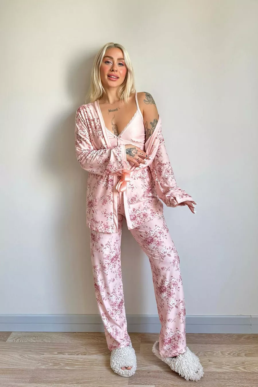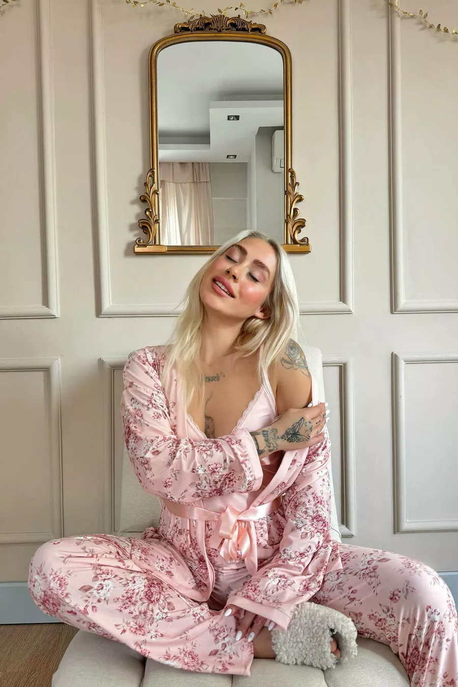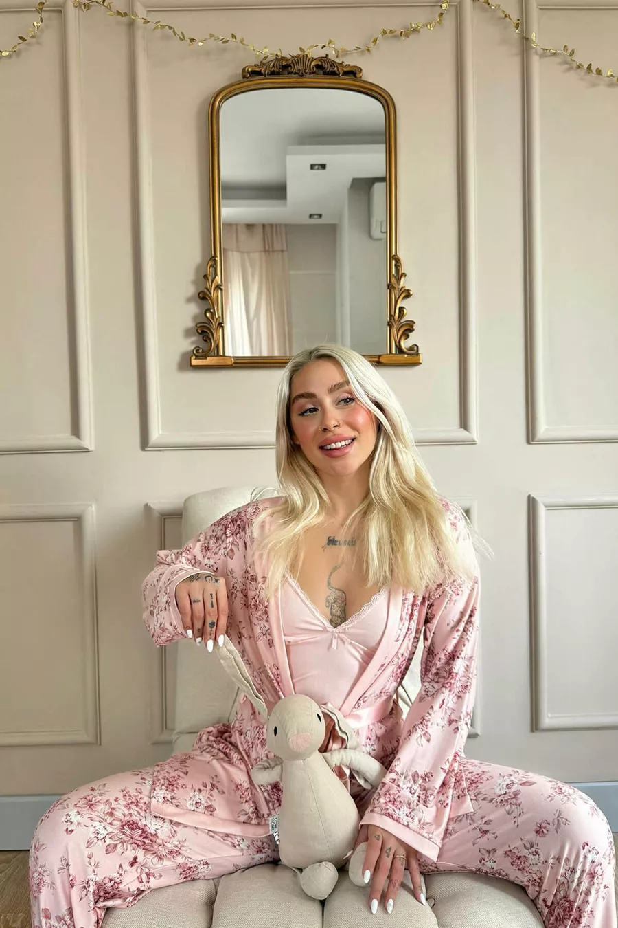 Ensemble de pyjama pour femme avec peignoir en maille exclusive Pembe Flore