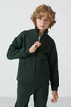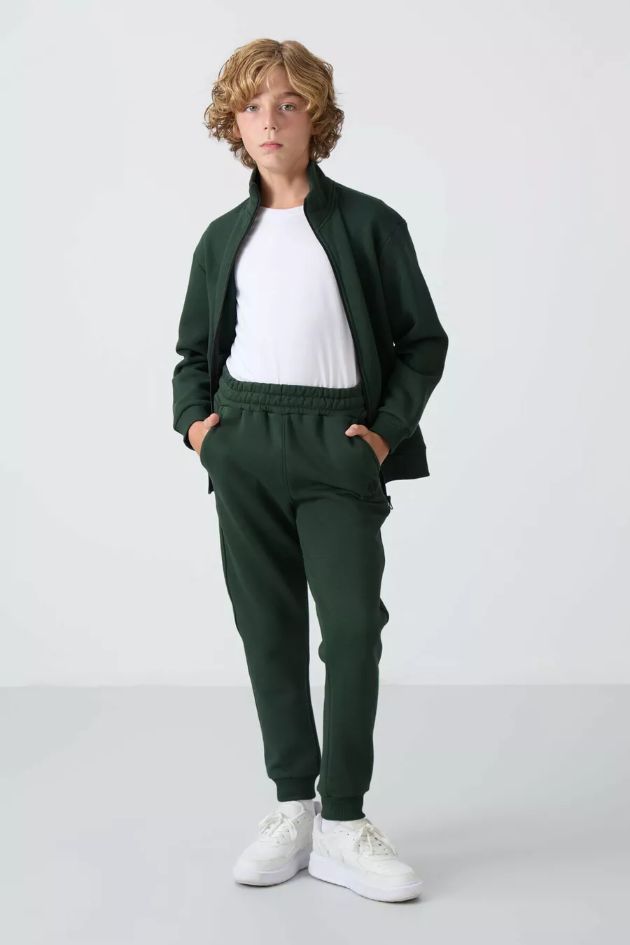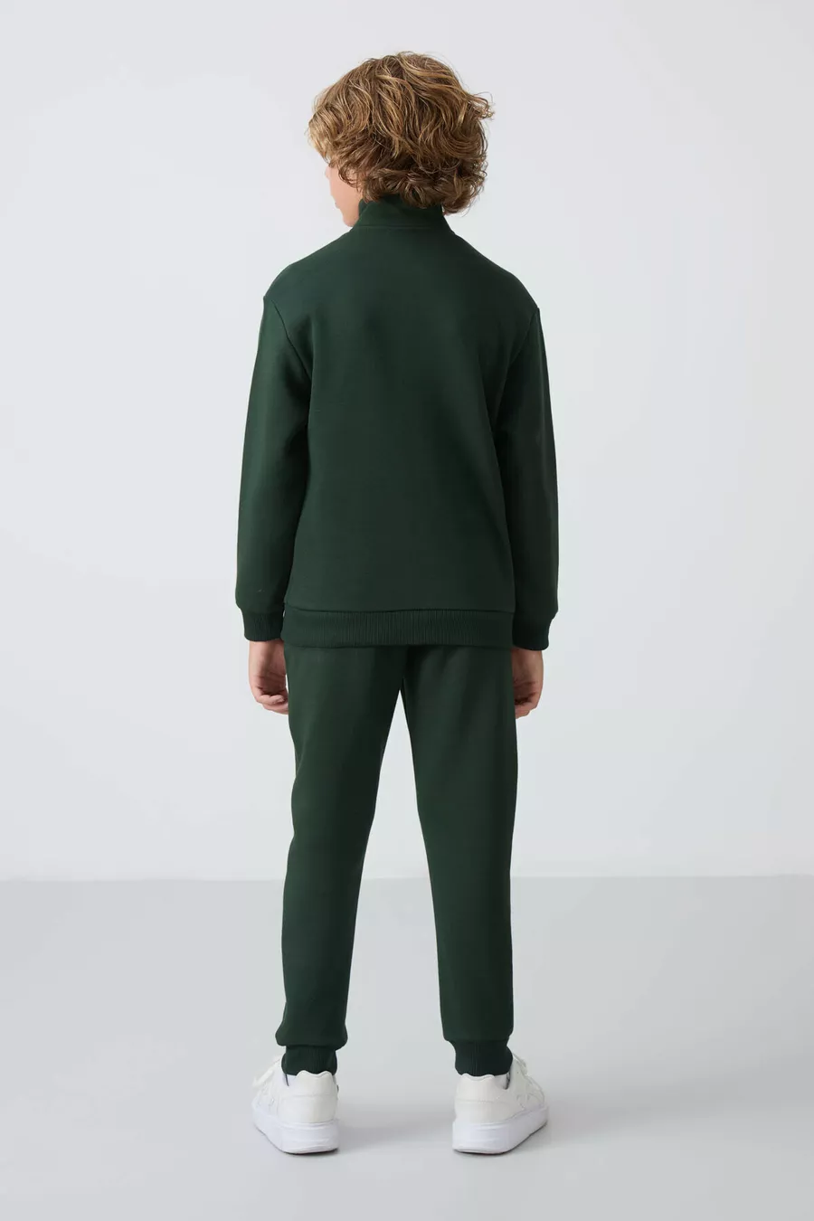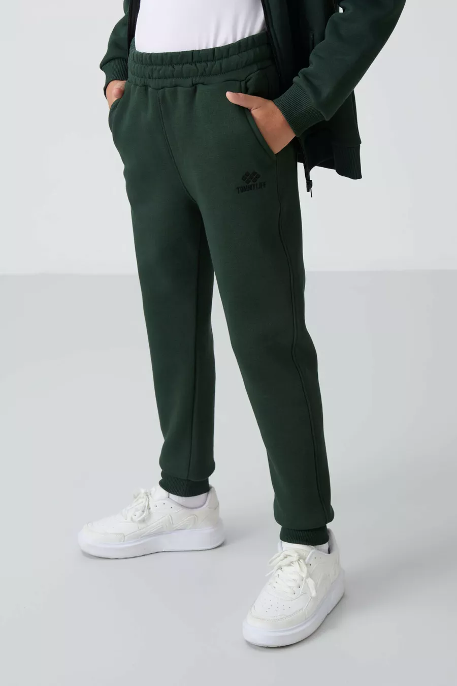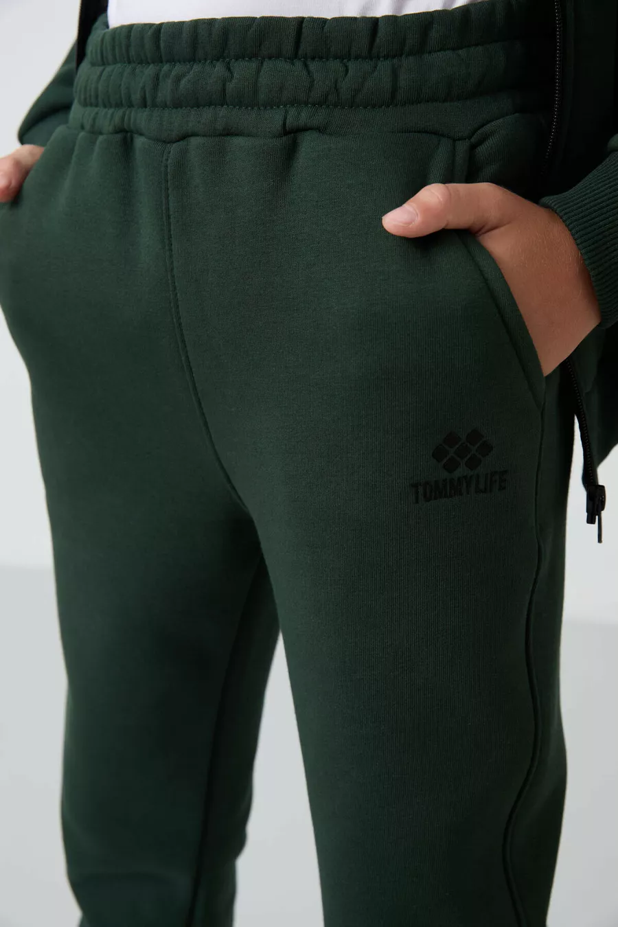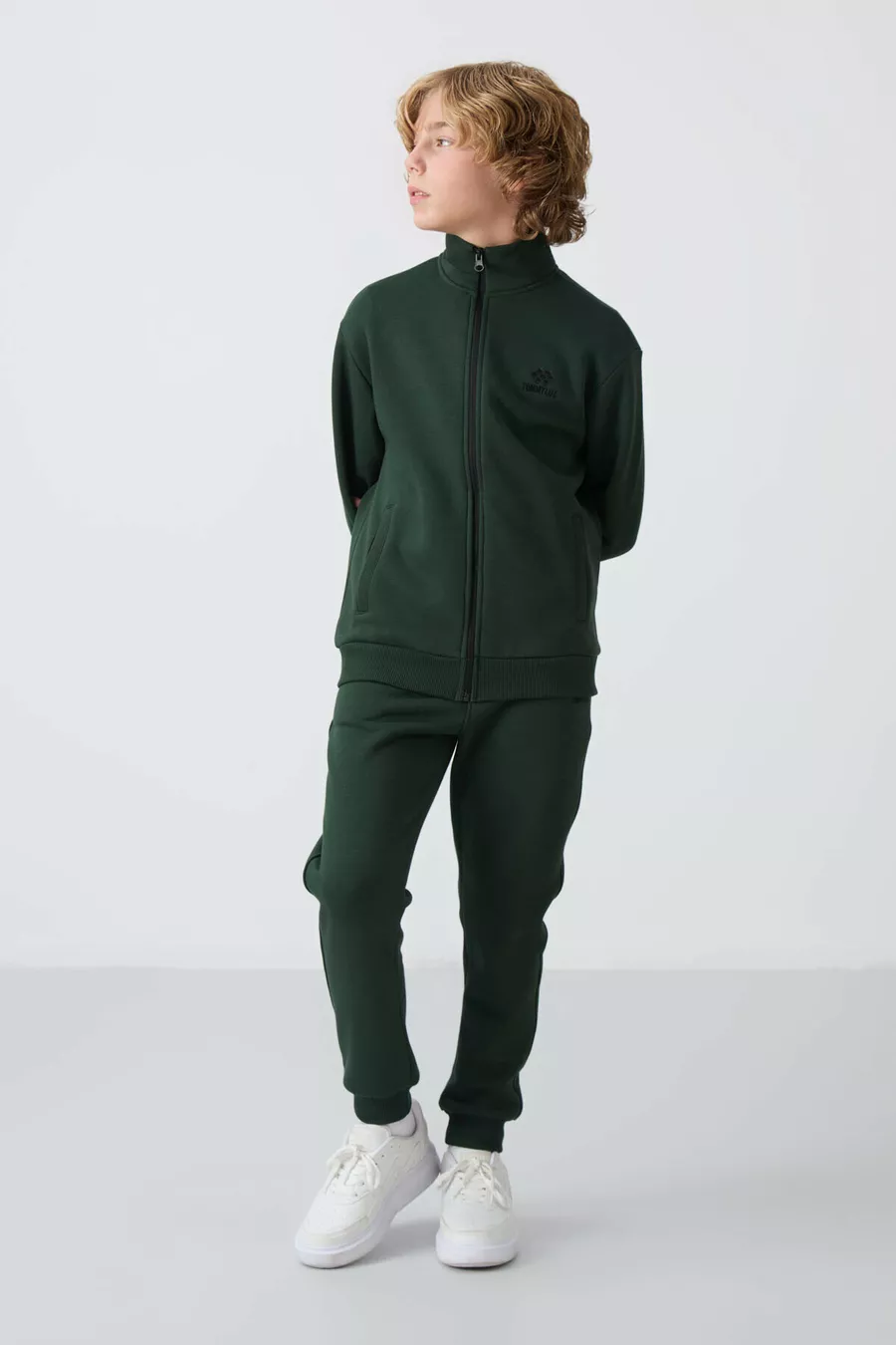 Ensemble de survêtement pour garçon en coton épais vert pin avec intérieur en polaire, coupe standard, brodé -