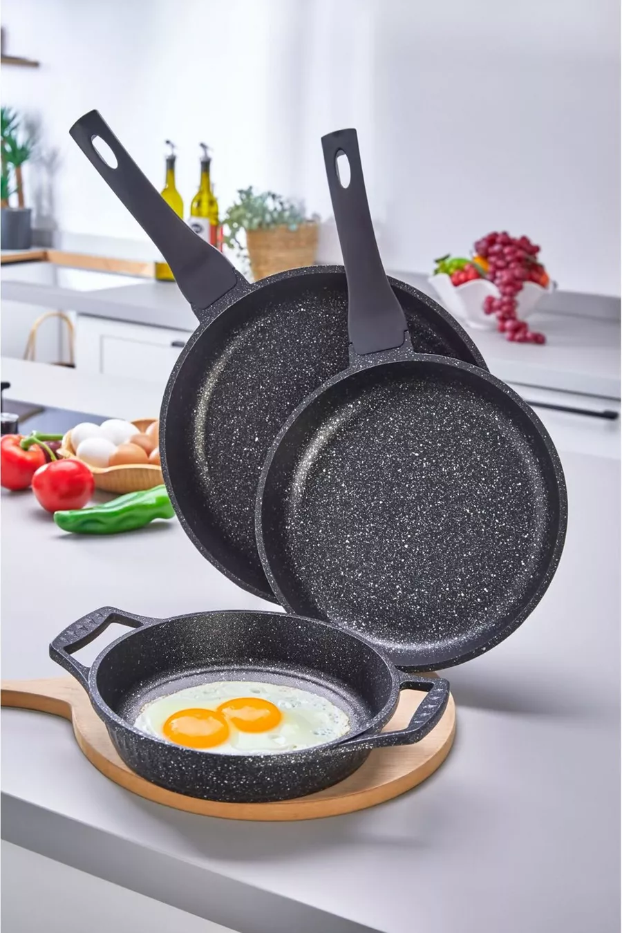 Dimensions/Taille : 24 cm Nombre de pièces : 3 Caractéristique : Fond antiadhésif Type de produit : Poêle à frire Matériau extérieur : Fonte Matériau intérieur : Granit Couleur : Noir Origine : TR Instructions d'entretien (contact alimentaire) : Lavable au lave-vaisselle. Symbole de contact alimentaire : Oui Matériau : Fonte Couleur : Noir
