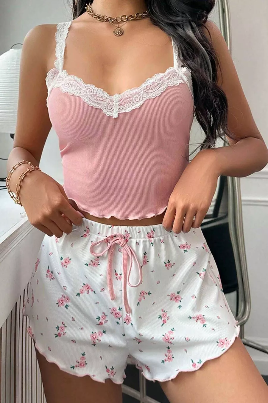 Ensemble de pyjama short à bretelles en dentelle à motif floral