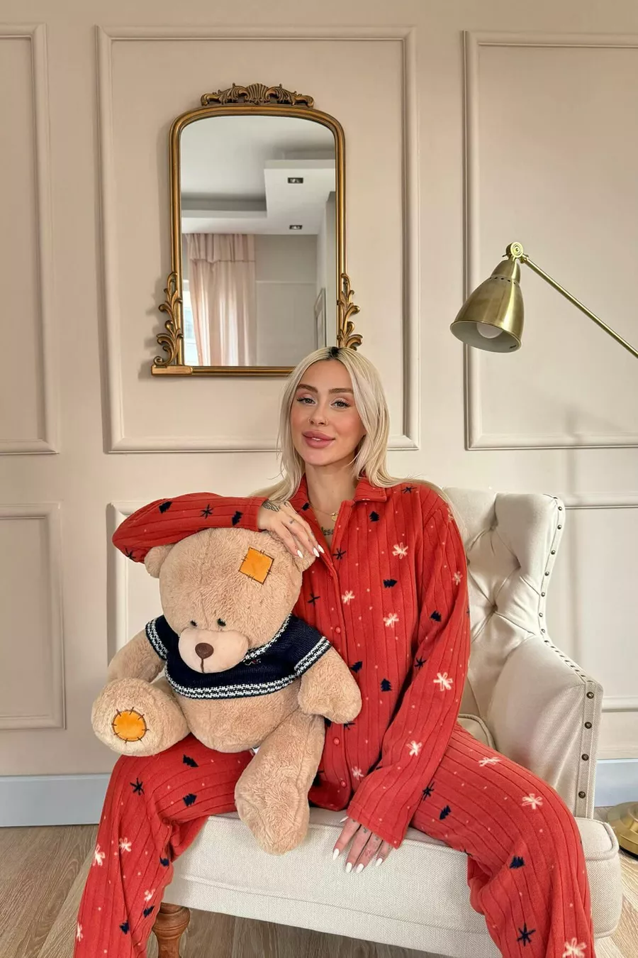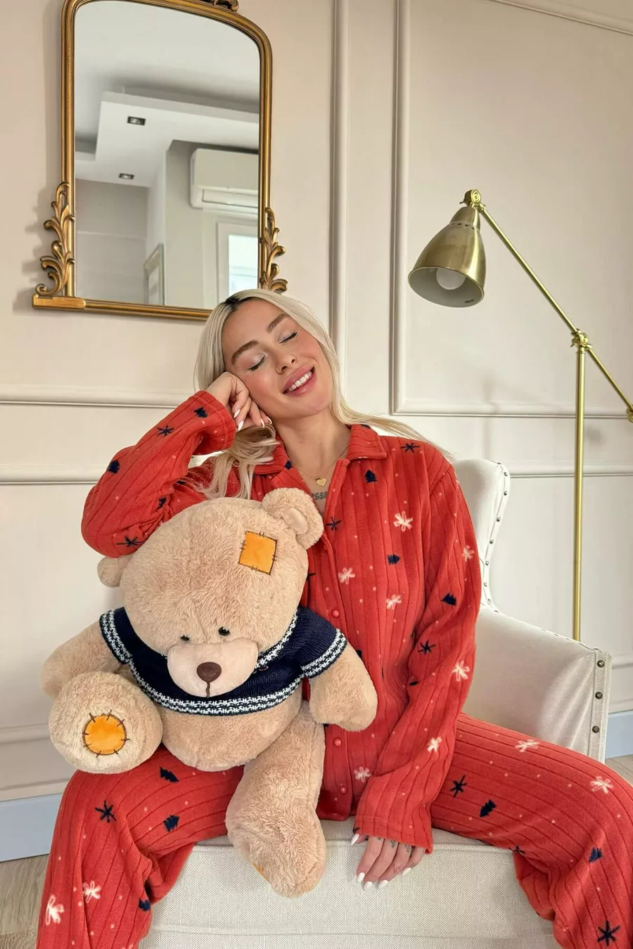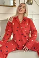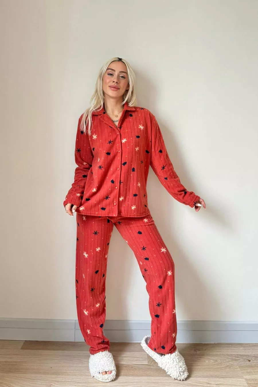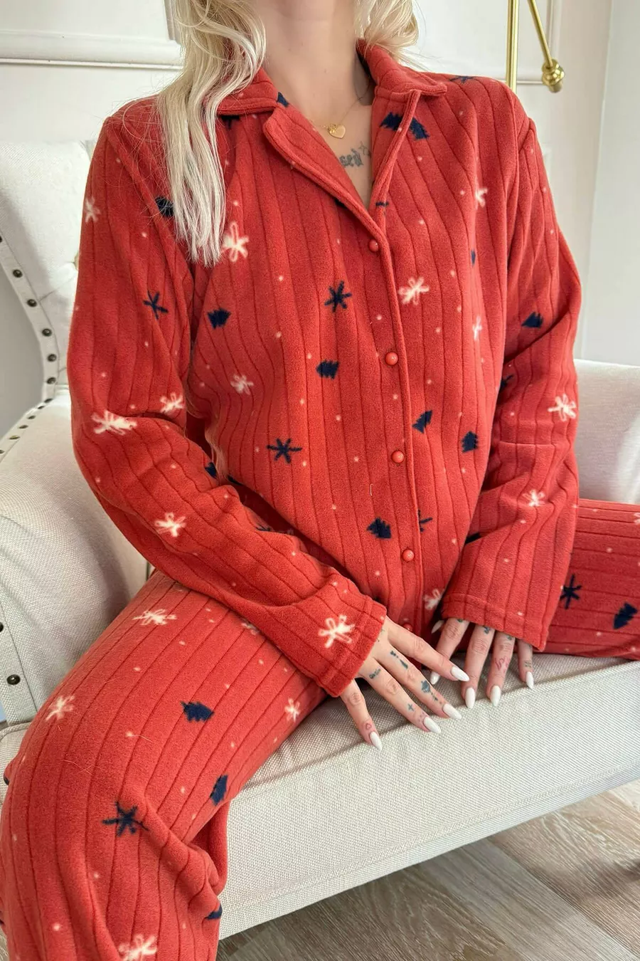 Ensemble de pyjama en polaire peluche à motifs pins brique avec boutons à l'avant