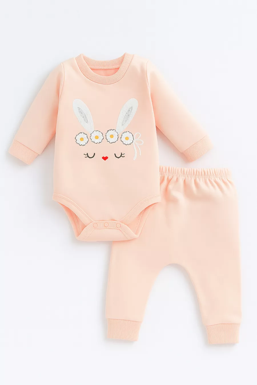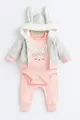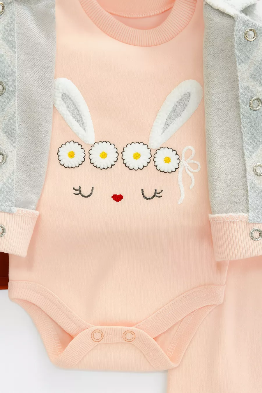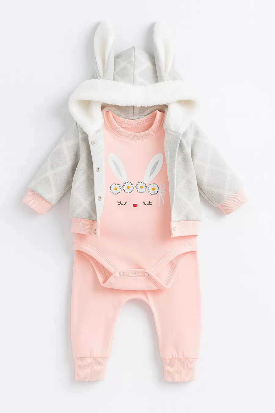 Ensemble Fille Mignon 3 Pièces avec Body, à Capuche Oreilles de Lapin et Imprimé Lapin Rayé, Couleur Saumon